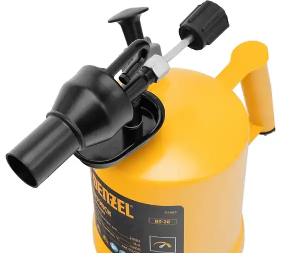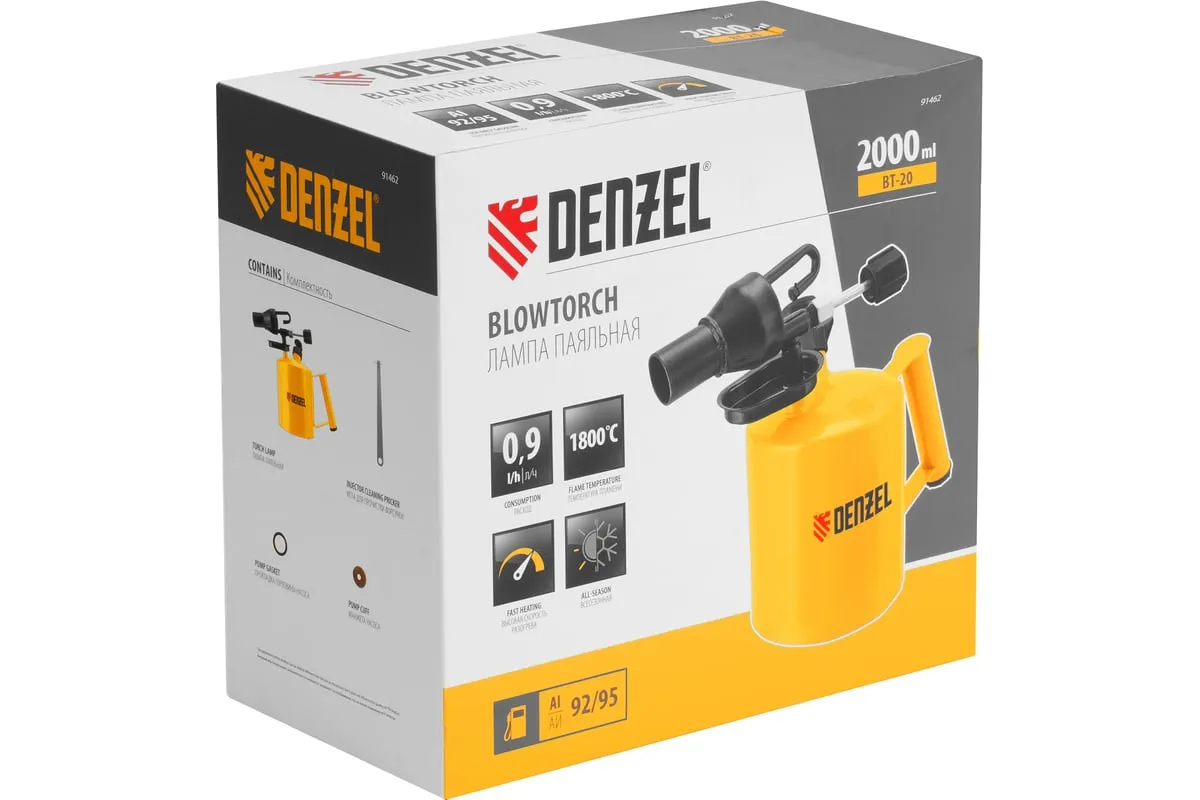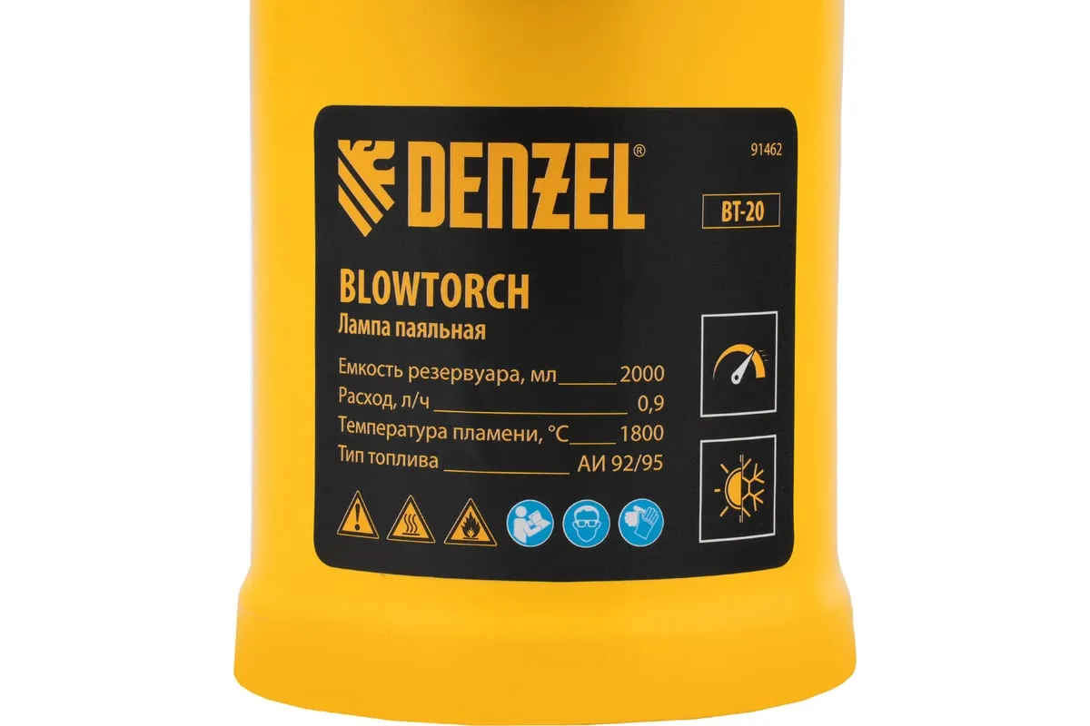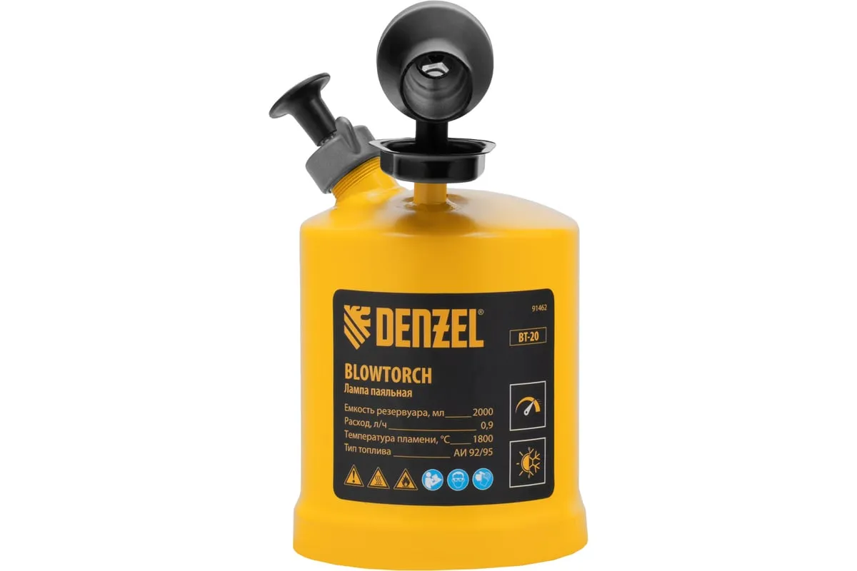 Паяльная лампа Denzel BT-20 91462 с баком объемом 2 л предназначена для нагрева поверхностей при помощи открытого направленного пламени. Полной заправки (1,5 л топлива) хватает больше чем на час работы при расходе 0,9 л/ч. Воздушный насос и форсунка высокого давления обеспечивают эффективную подачу топлива к эжектору. Лампа стабильно работает даже в ветреную погоду. Используется при выполнении ремонтных и демонтажных работ: пайки, сварки, ослаблении заклинивших резьбовых соединений, опаливании древесины, снятии лакокрасочных покрытий и других термических работ. Пригодится для обогрева двигателя. Также будет полезна в сельском хозяйстве и в быту.