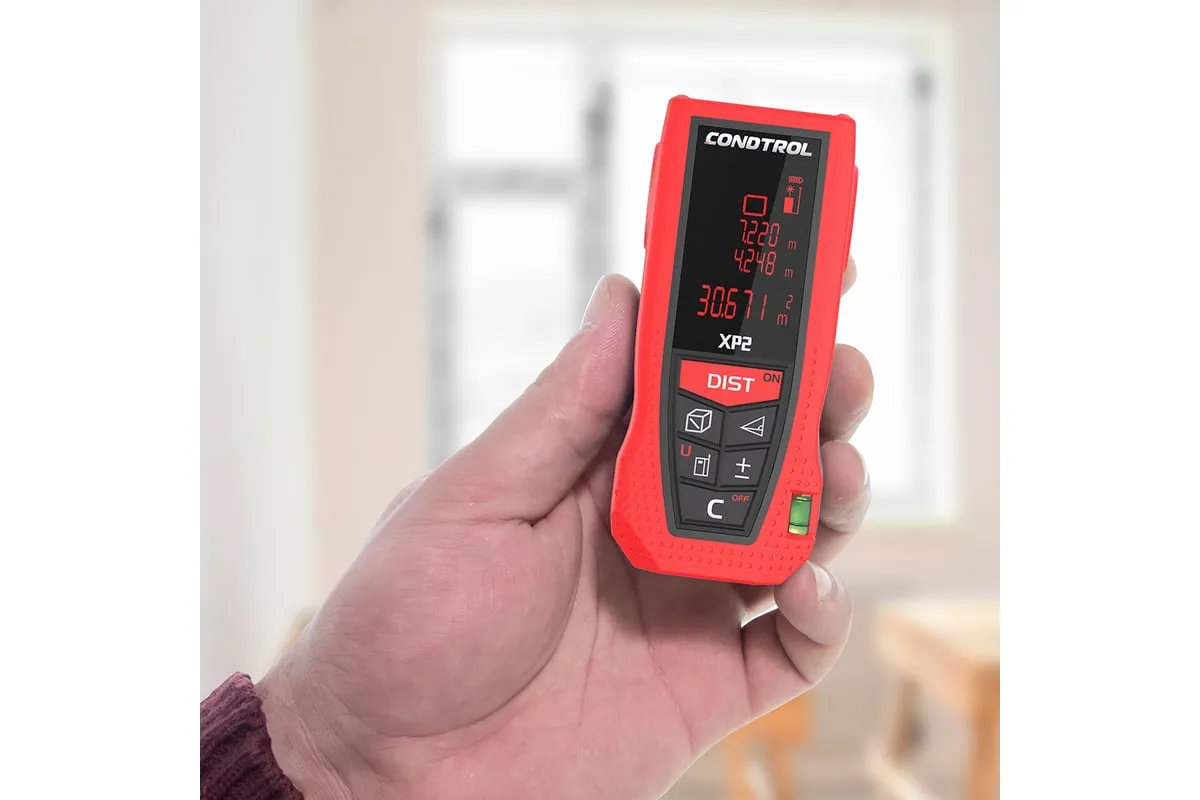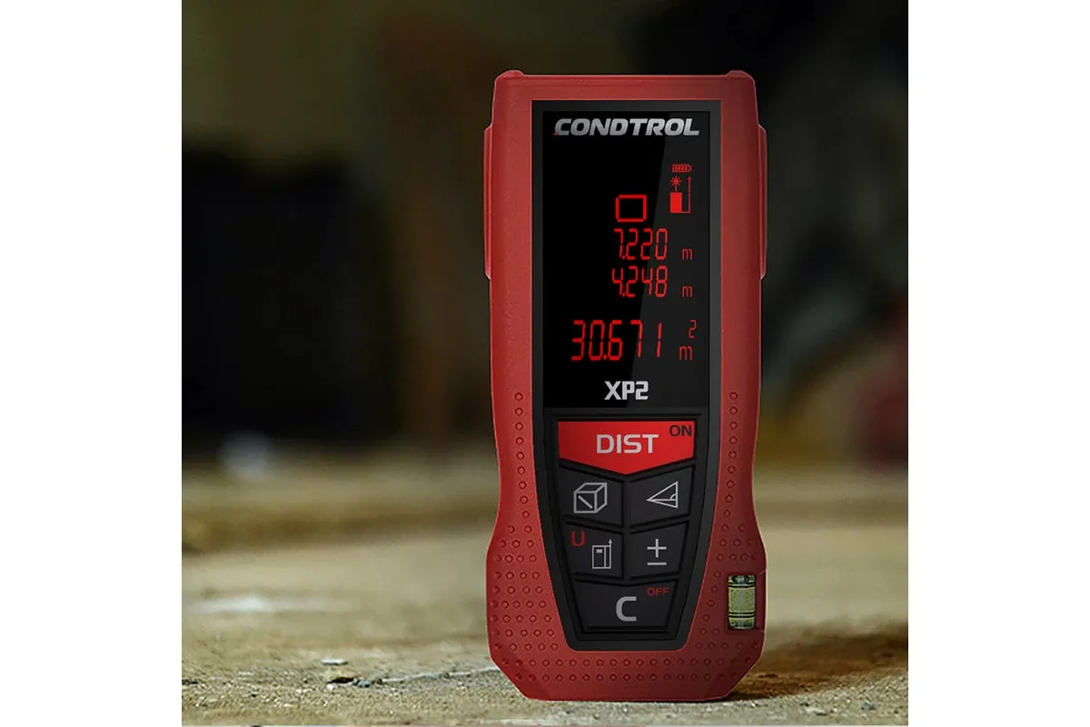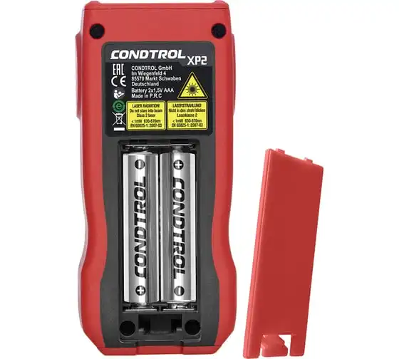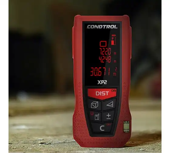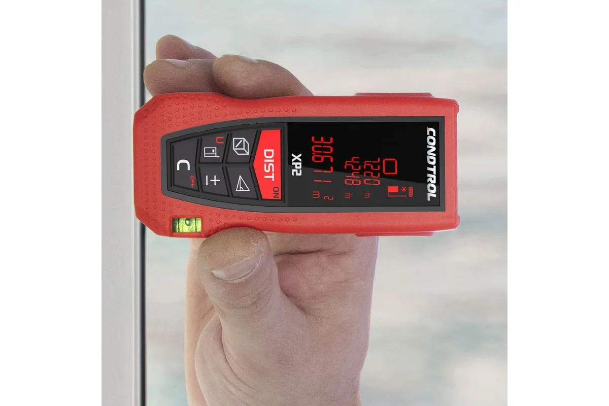 Лазерный дальномер Condtrol XP2 1-4-080 имеет понятный интерфейс и крупный трехстрочный дисплей с подсветкой. В режиме "трекинг" устройство постоянно измеряет дистанцию. При бездействии прибор автоматически отключается через 180 секунд, что значительно экономит заряд батарей. Благодаря крупным кнопкам, можно работать даже в перчатках. Модель имеет защиту от брызг воды и пыли IP54.