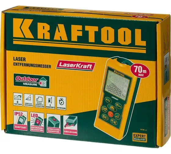 Лазерный дальномер Kraftool LASER-KRAFT 34760_z01 используется для быстрых и точных измерений линейных расстояний, площадей, объемов. Значительно ускоряет ход выполнения разметочных работ. Благодаря инновационной конструкции лазерного модуля и приемника луча можно работать на улице. Возможность надежного покрытия составляет до 50% от заявленного диапазона. В целяхэкономии заряда батарейпредусмотрено энергосберегающее отключение лазерного луча (через 30 сек.) и прибора (через 180 сек.). Модель имеет компактные размеры, чтоупрощает хранение и транспортировку.