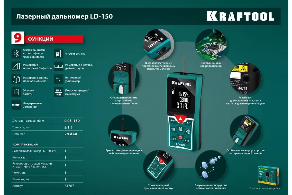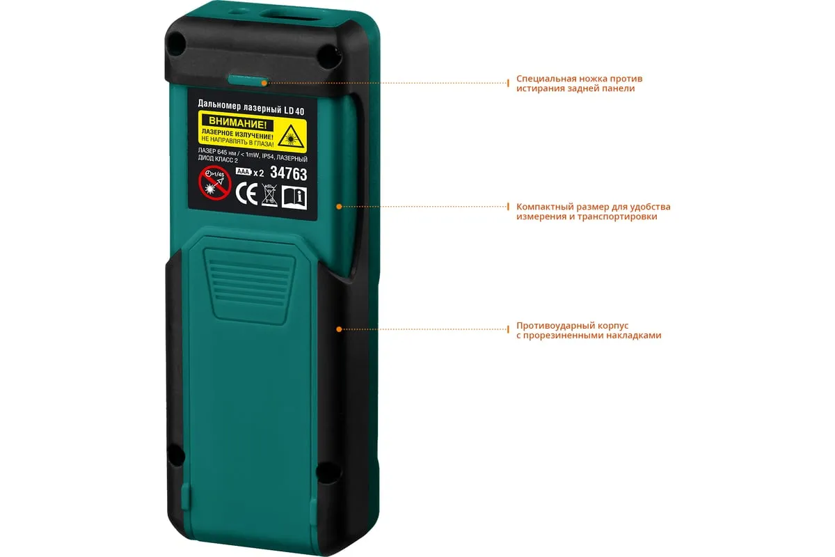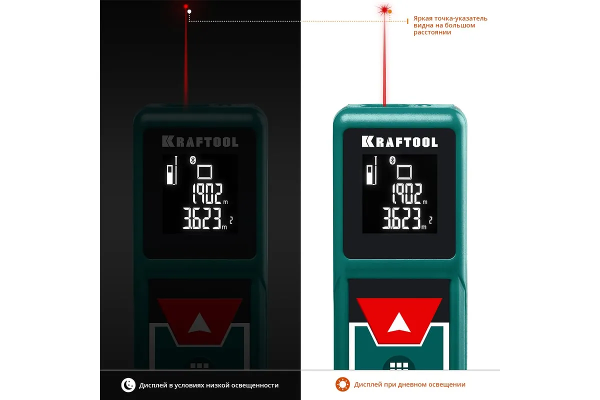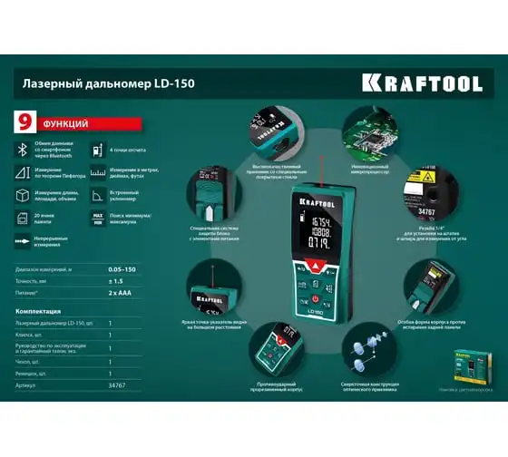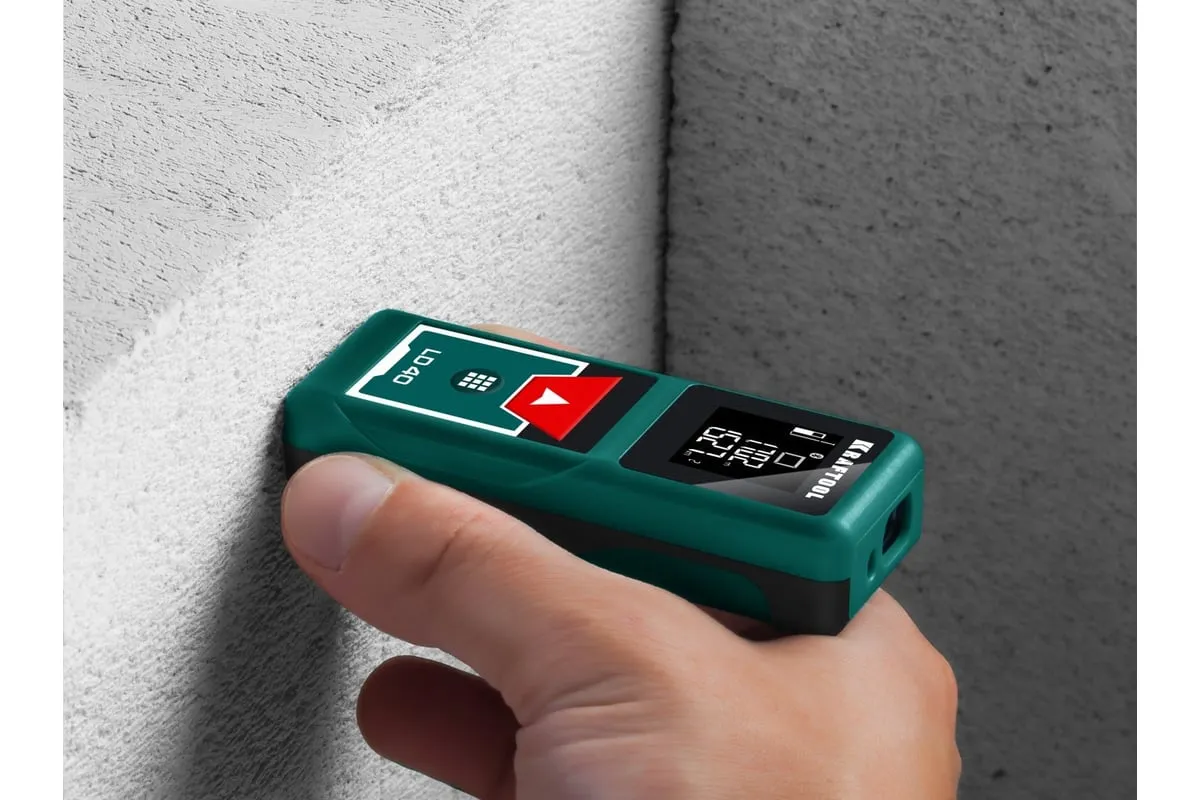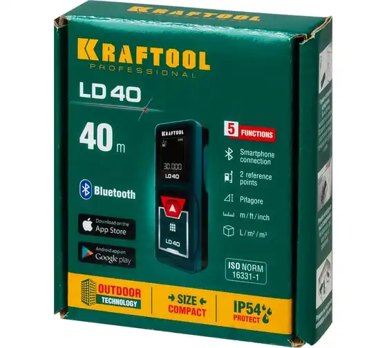 Лазерный дальномер KRAFTOOL LD-40 34763 служит для точного измерения линейных расстояний, площадей и объемов. Автоотключение прибораэкономит расход заряда батареи. Две точки отсчета помогают делать замерв труднодоступных местах. Удобная транспортировкаприбора достигается благодаря небольшим размерам. Профессиональный лазерный дальномер это высокоточный прибор для точного измерения линейных расстояний, площадей и объёмов. Позволяет проводить весь цикл измерений одному человеку, значительно ускоряя выполнение разметочных работ и повышая надёжность полученных данных. Позволяет создавать дизайнерские проекты напрямую в вашем смартфоне.