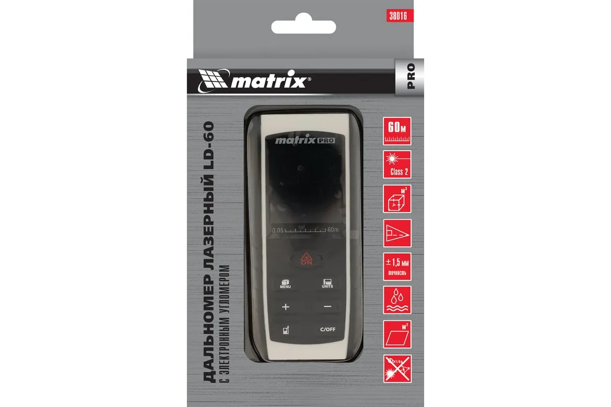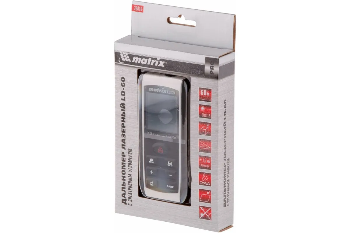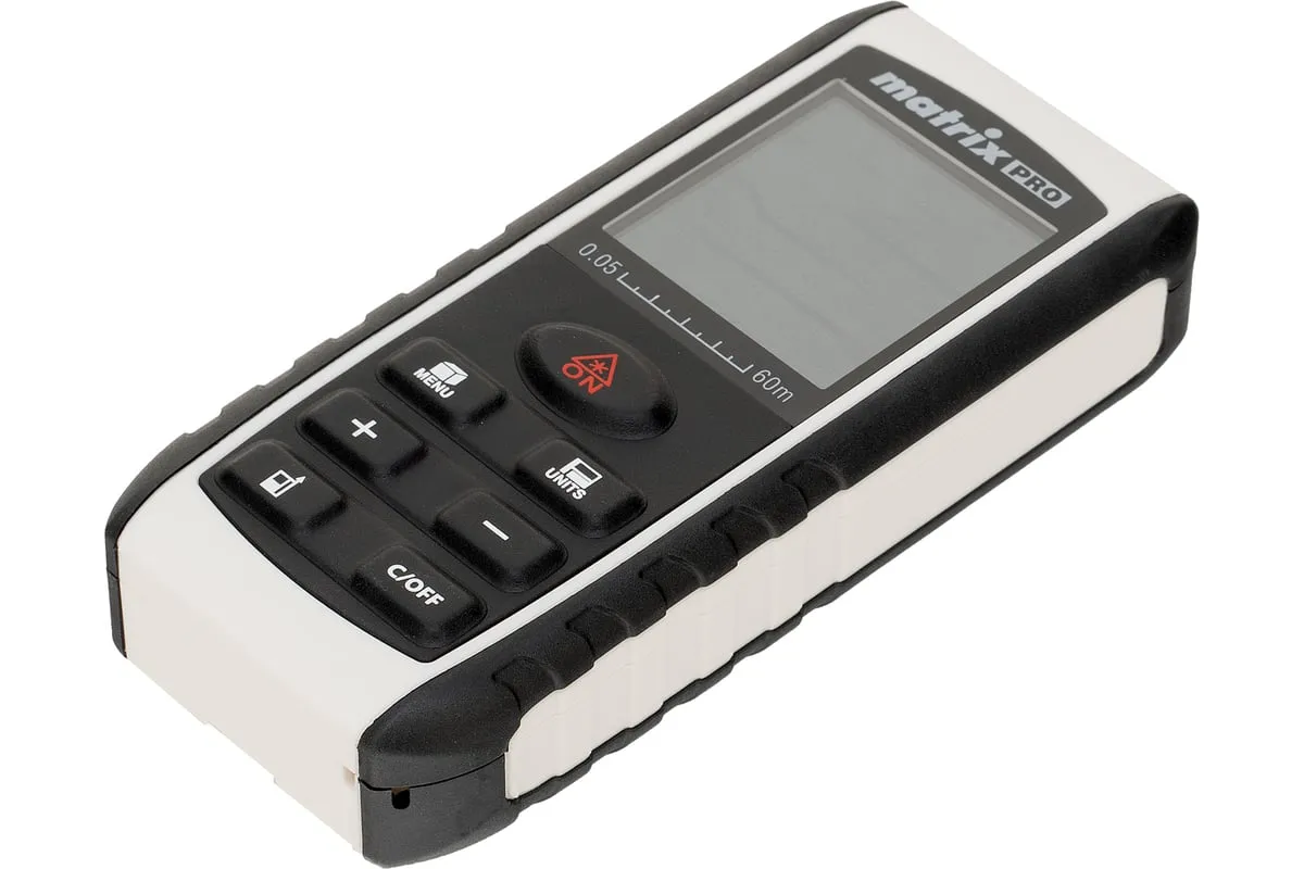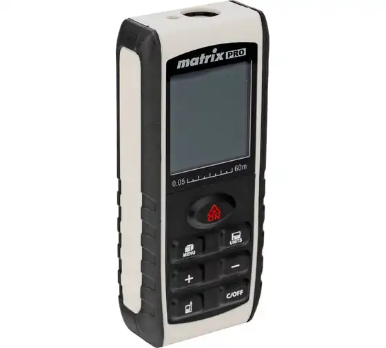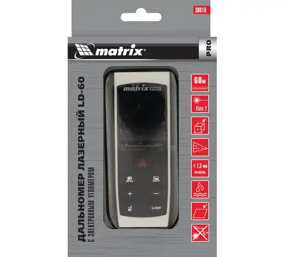 Лазерный дальномер с электронным угломером Matrix LD-60 38016 используется для измерения линейных расстояний и углов, вычисления площадей и объемов.