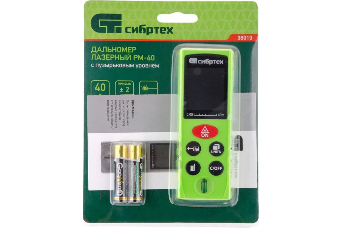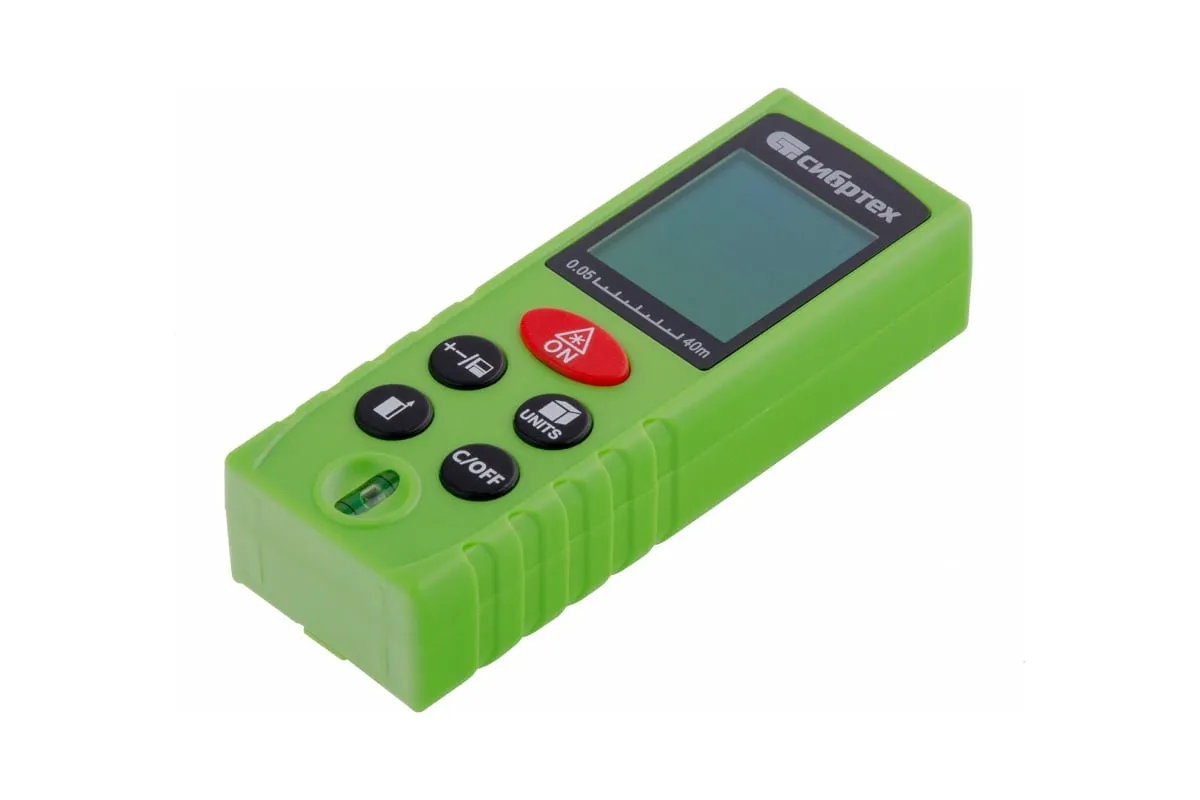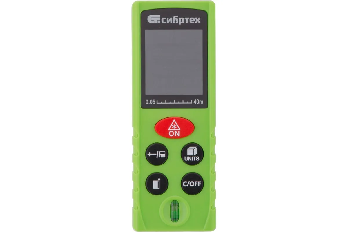 Лазерный дальномер с пузырьковым уровнем Сибртех PM-40 38010 используется для измерения линейных расстояний и углов, вычисления площадей и объемов. Корпус из прочного ABS-пластиказащищает внутренности прибора при ударах. Резиновые накладки обеспечивают надежный хват, поэтому инструментне выскальзывает из рук. Встроенный пузырьковый уровень гарантируетровное расположение на любой поверхности.