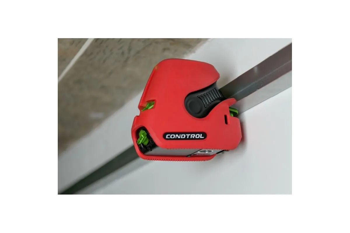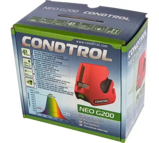 Лазерный нивелир Condtrol NEO G200 имеет дизайн, защищенный патентами в России и Европе. Он используется при проведении ремонтных и строительных работ для построения горизонтальной и вертикальной плоскости. Металлическая рама внутри конструкции обеспечивает стабильную геометрию подвеса и защиту оптики. Фирменный демпфер способствует удароустойчивости. Преимуществом данной модели являются лазеры зеленого цвета с длиной волны 532 Нм. Они в 4 раза ярче по сравнению с красными лазерами такой же мощности излучателя.