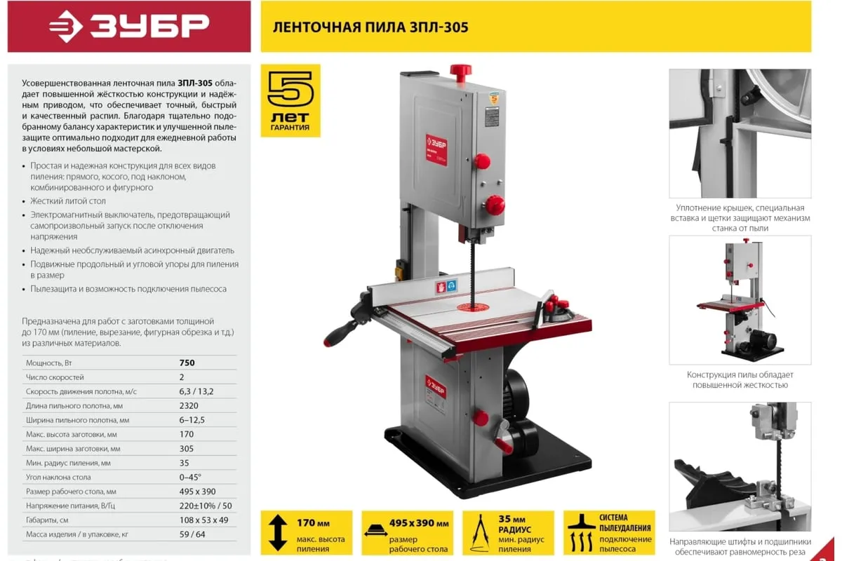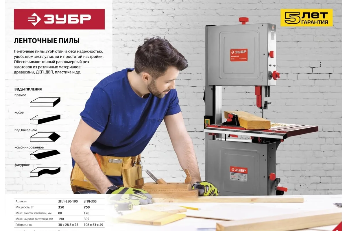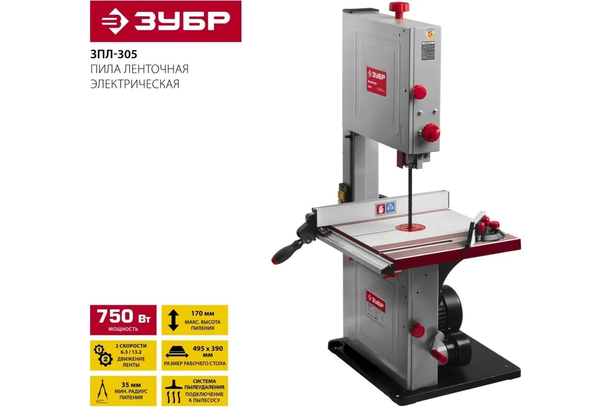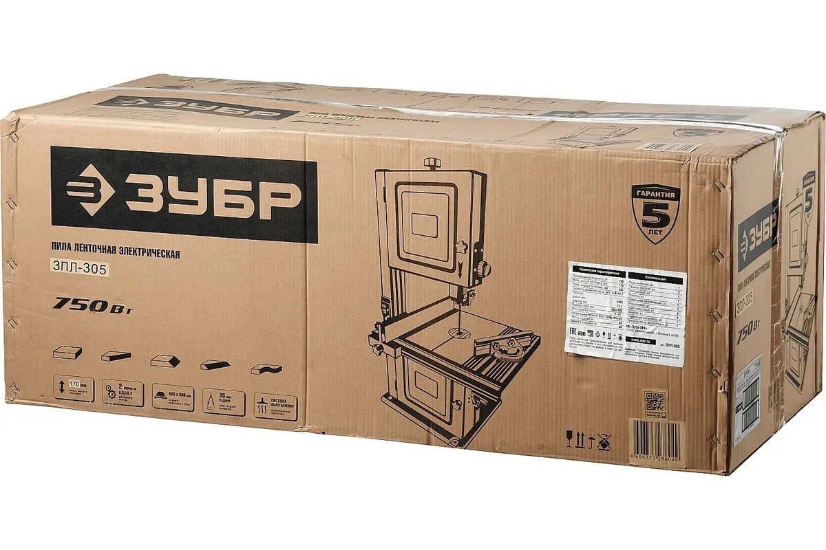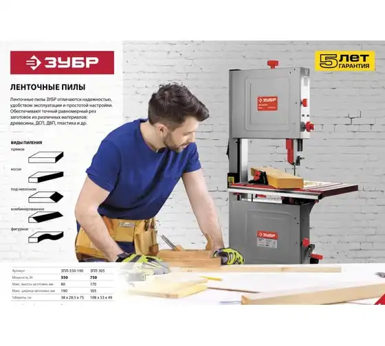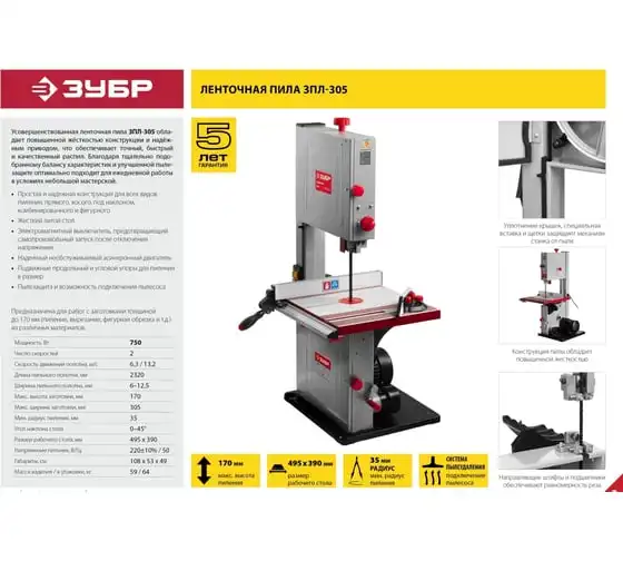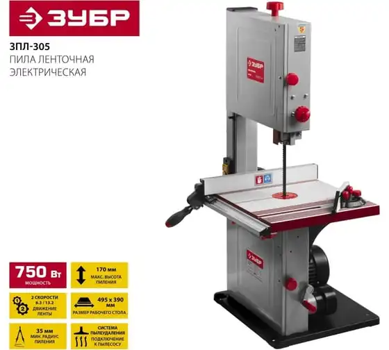 Ленточная пила ЗУБР 750 Вт ЗПЛ-305 - многофункциональная установка для вырезание, пиления, фигурной резки дерева, пластика или металла. Модель отличается высокой надежностью в работе и не доставляет сложностей в эксплуатации. Ключевые моменты: