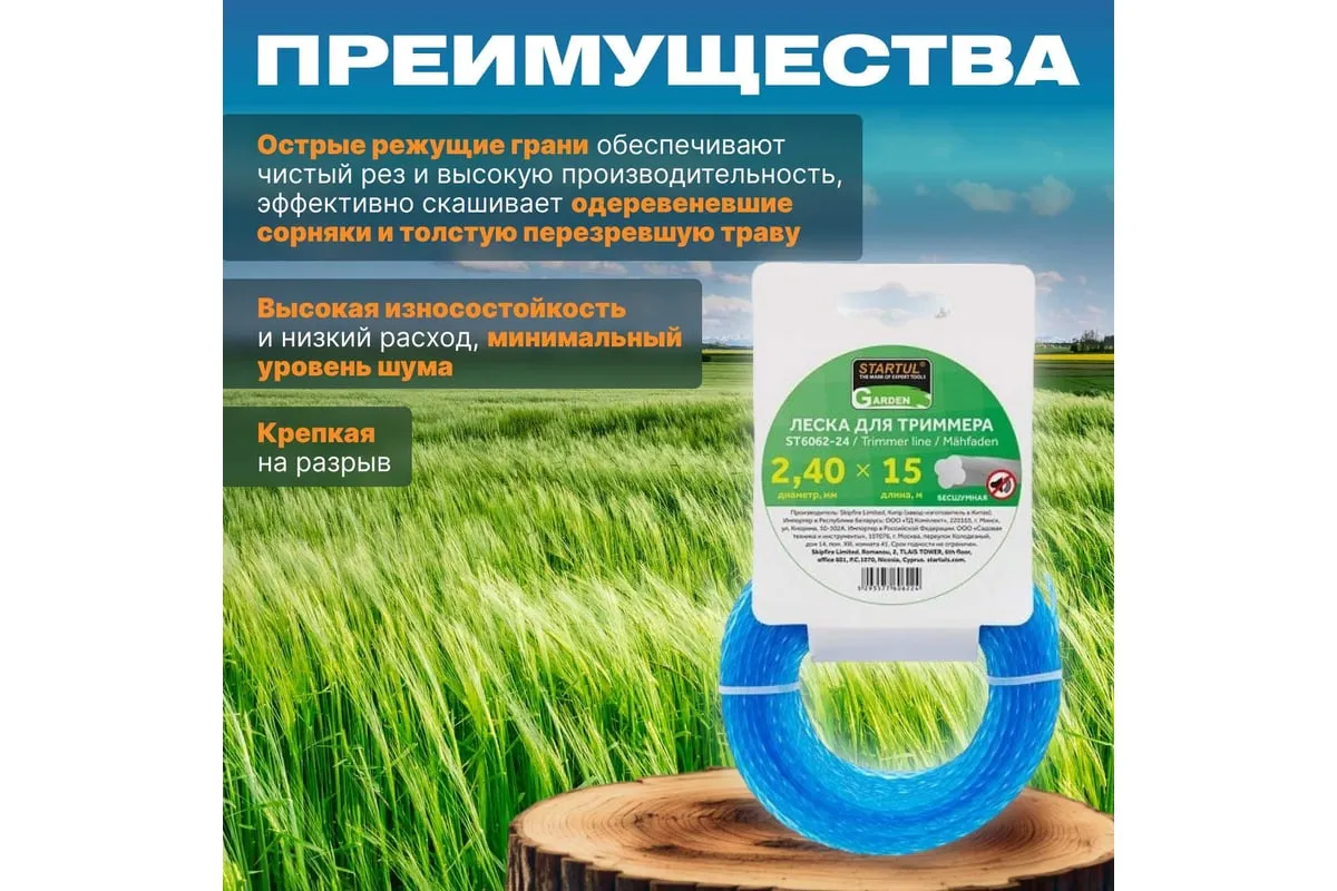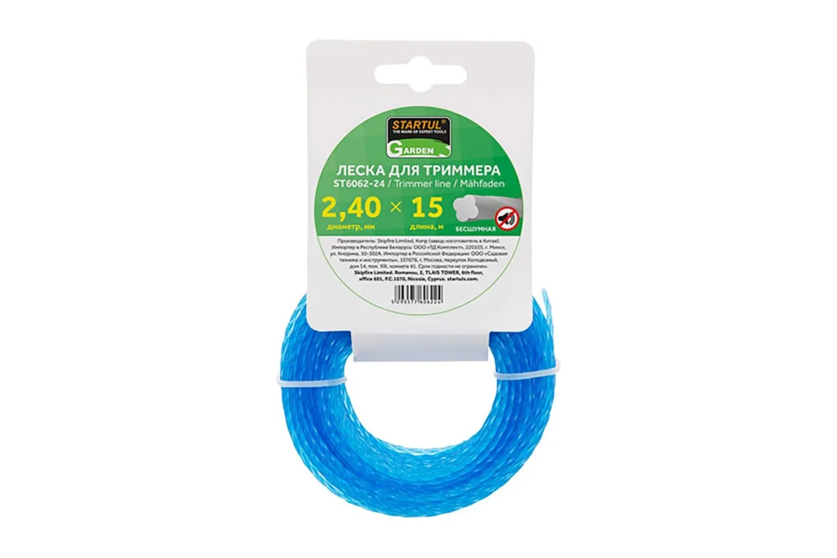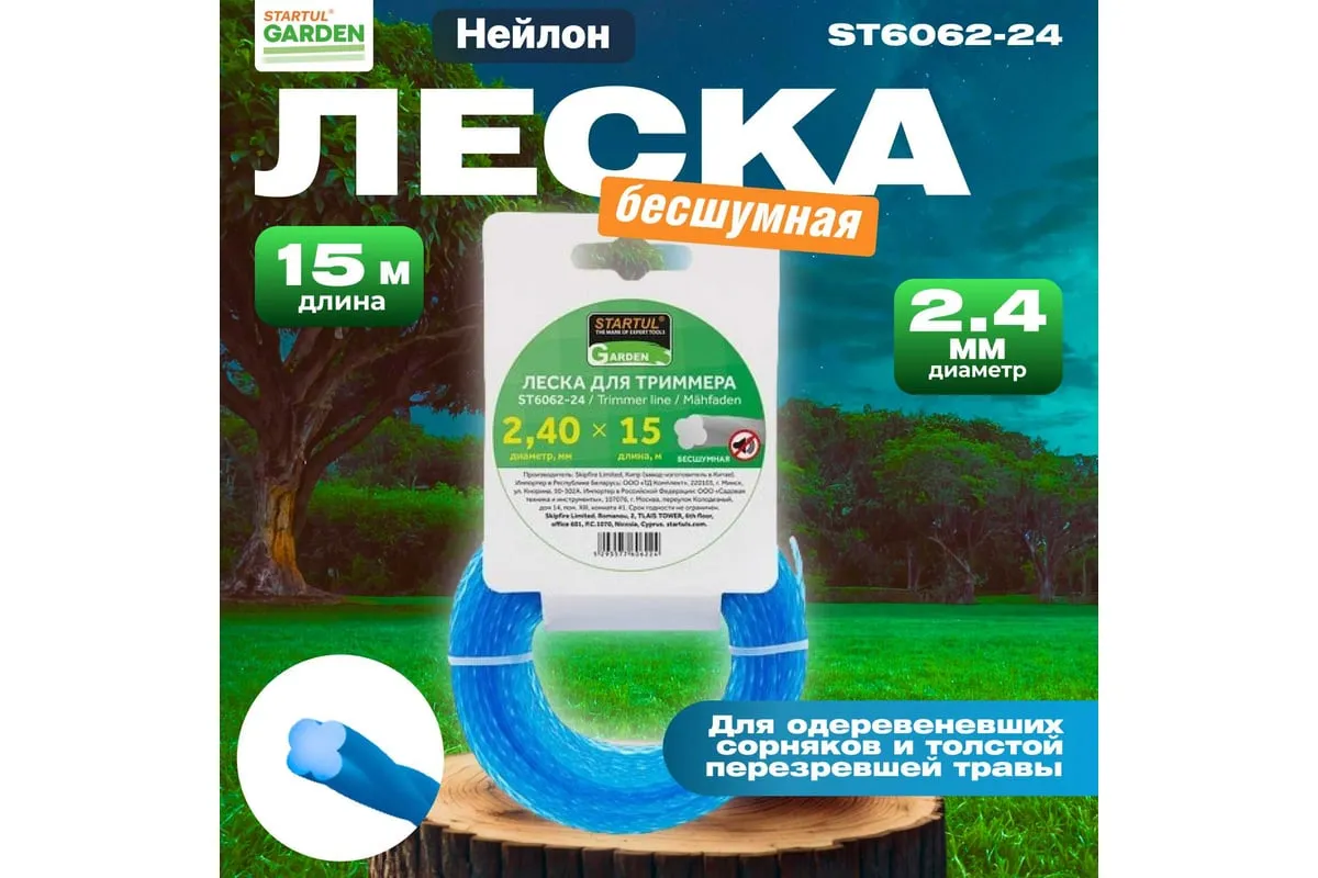 Леска бесшумная GARDEN 2.4 мм, 15 м STARTUL ST6062-24 используется на мотокосах с объемом двигателя до 35 см3. Заправляется в триммерную головку.
