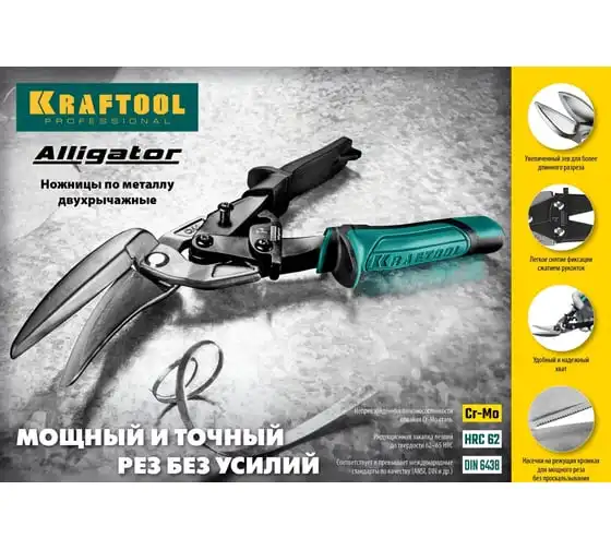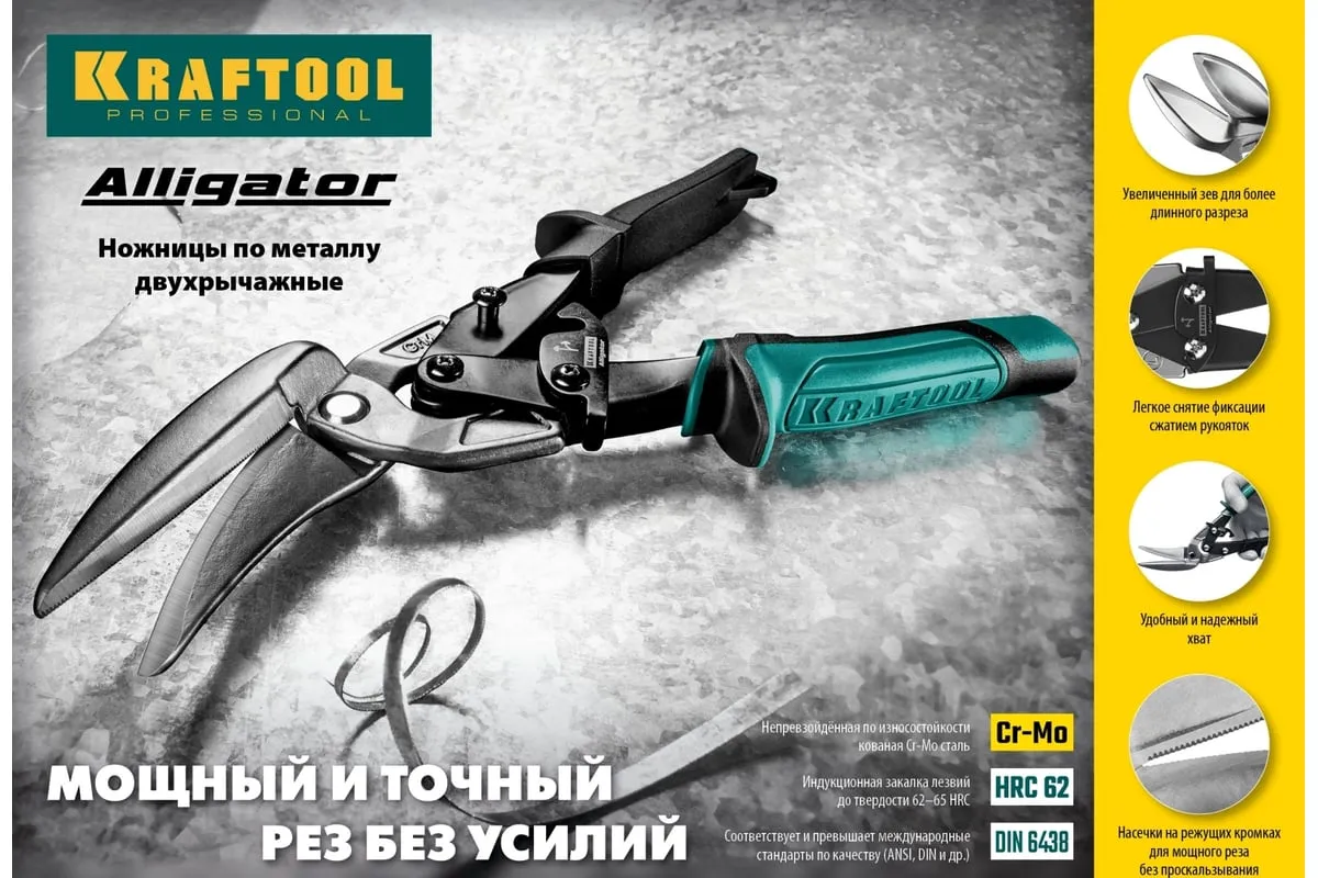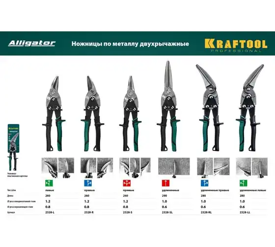 Левые ножницы по металлу KRAFTOOL Alligator 250 мм 2328-L применяются для прямой и фигурной резки (в левую сторону) листовых материалов из стали повышенной твердости, нержавеющей стали, цветных металлов. Изготовлены из хромомолибденовой стали. Индукционная закалка лезвий до твердости 62 – 65 HRC. Увеличенный зев облегчает рез твердой стали без заусенцев. Двухкомпонентные рукоятки обеспечивают удобство и надежный захват при работе.