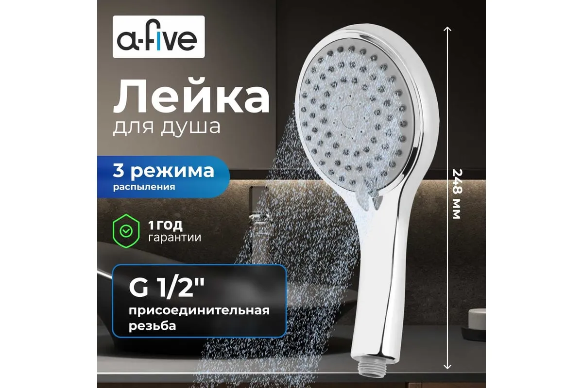 Лейка для душа A-five A5-017 имеет 3 режима работы: Корпус лейки изготовлен из ABS-пластика.