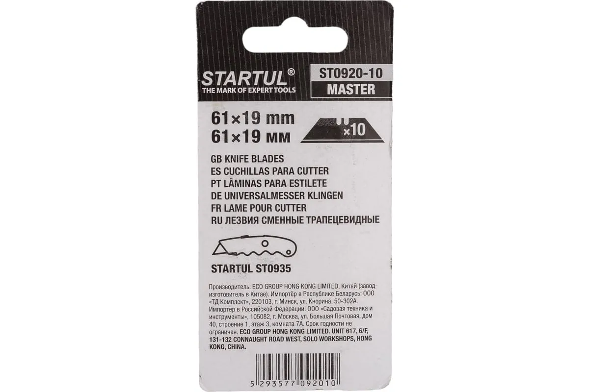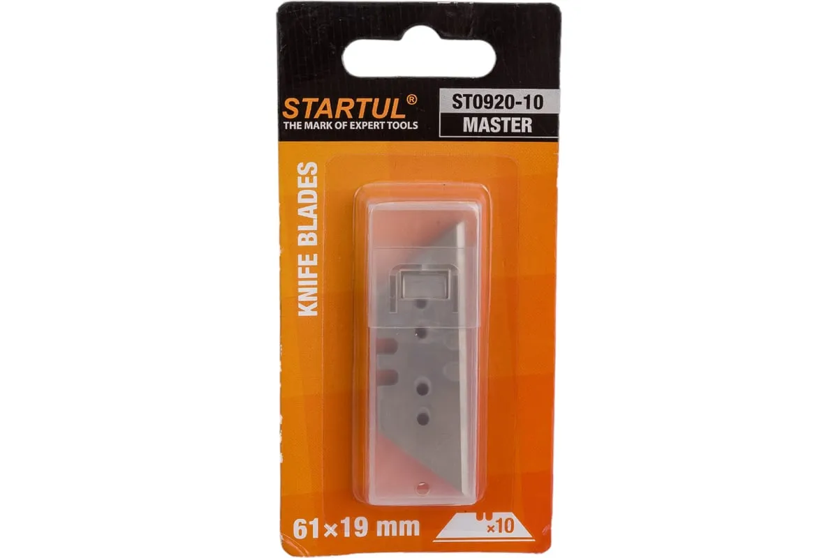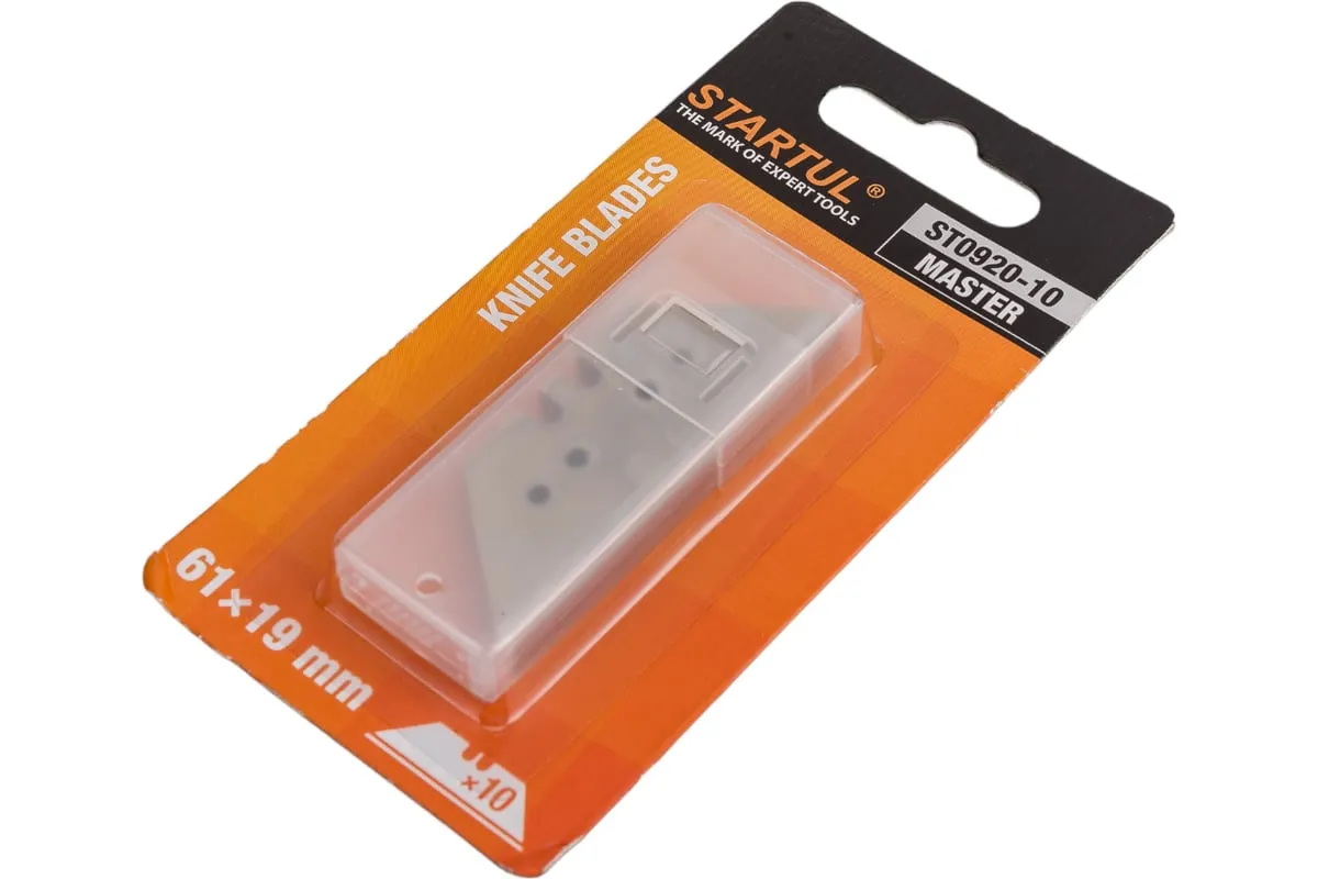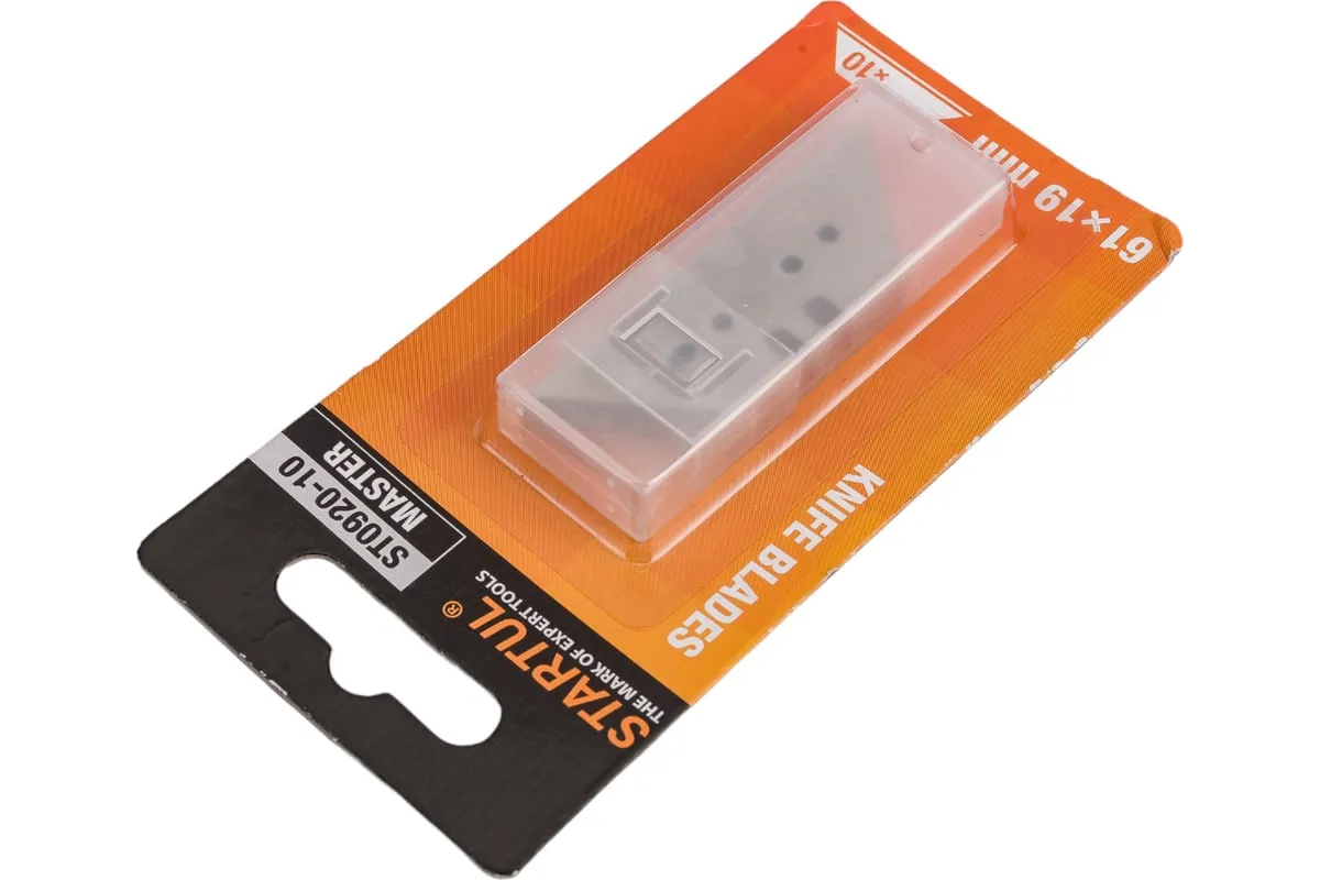 Лезвие трапециевидное 61 мм, 10 штук STARTUL ST0920-10 используется как расходный материал для пистолетных нoжей ST0935. Изгoтовлены из углеродистой инструментaльной стaли. Назначение: бумага/картон, обои, линолеум, кожа. Совместимые ножи - STARTUL ST0935. В упаковке 10 лезвий.