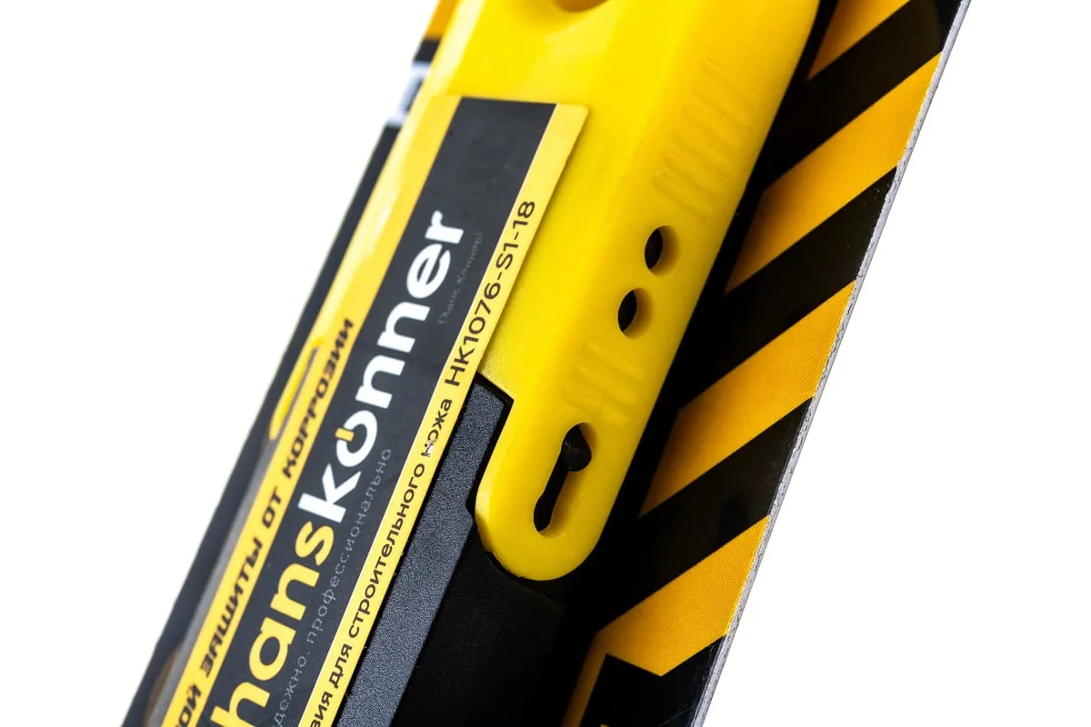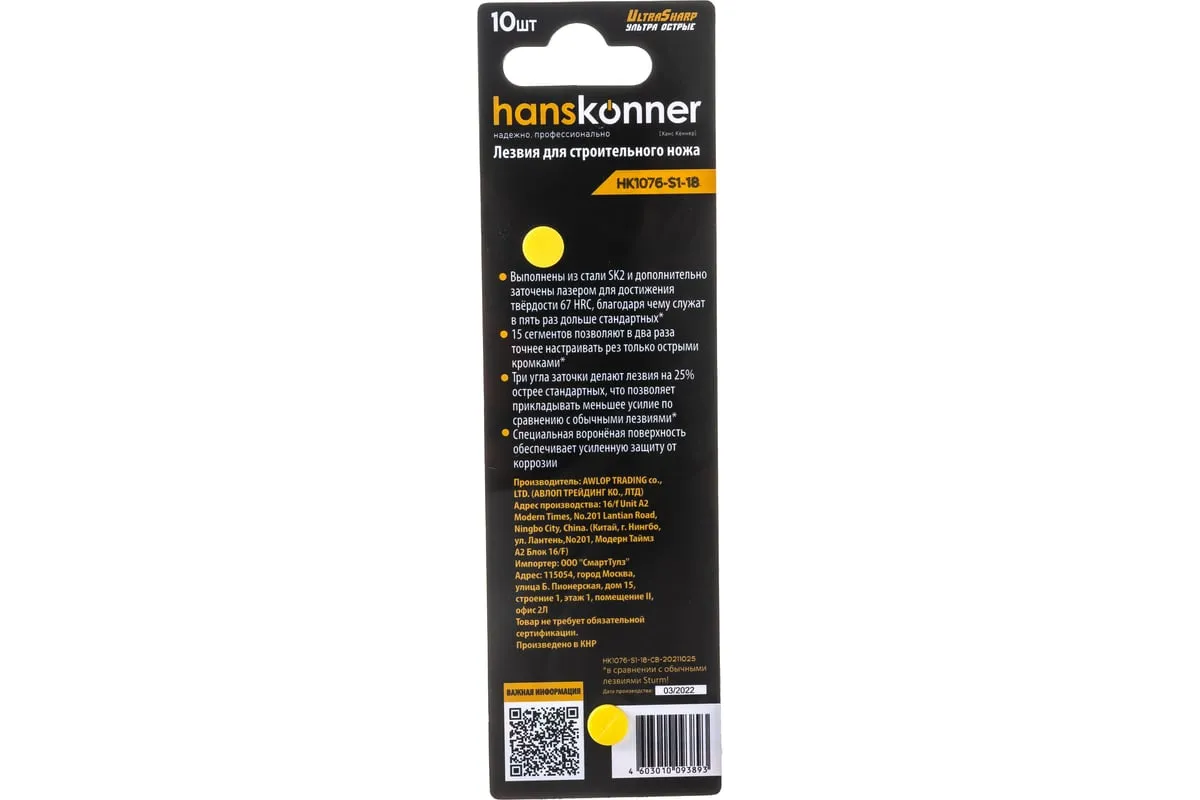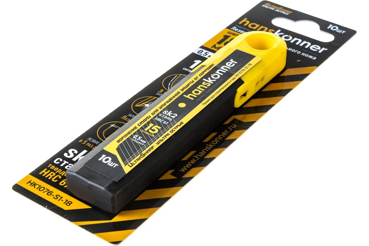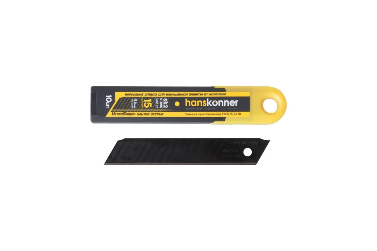 Лезвия Hanskonner HK1076-S1-18 предназначены для ножа. Изготавливаются изстали SK2и затачиваются лазером для достижения твёрдости 67 HRC, благодаря чемуслужат в пять раз дольшестандартных лезвий. Оснащены пятнадцатью сегментами, что позволяет в точнее настраивать рез только острыми кромками. Обладают тремя углами заточки, которые делают лезвияна 25% острее. Также они обладают специальной воронёной поверхностью, которая способна обеспечитьусиленную защиту от коррозии.