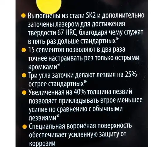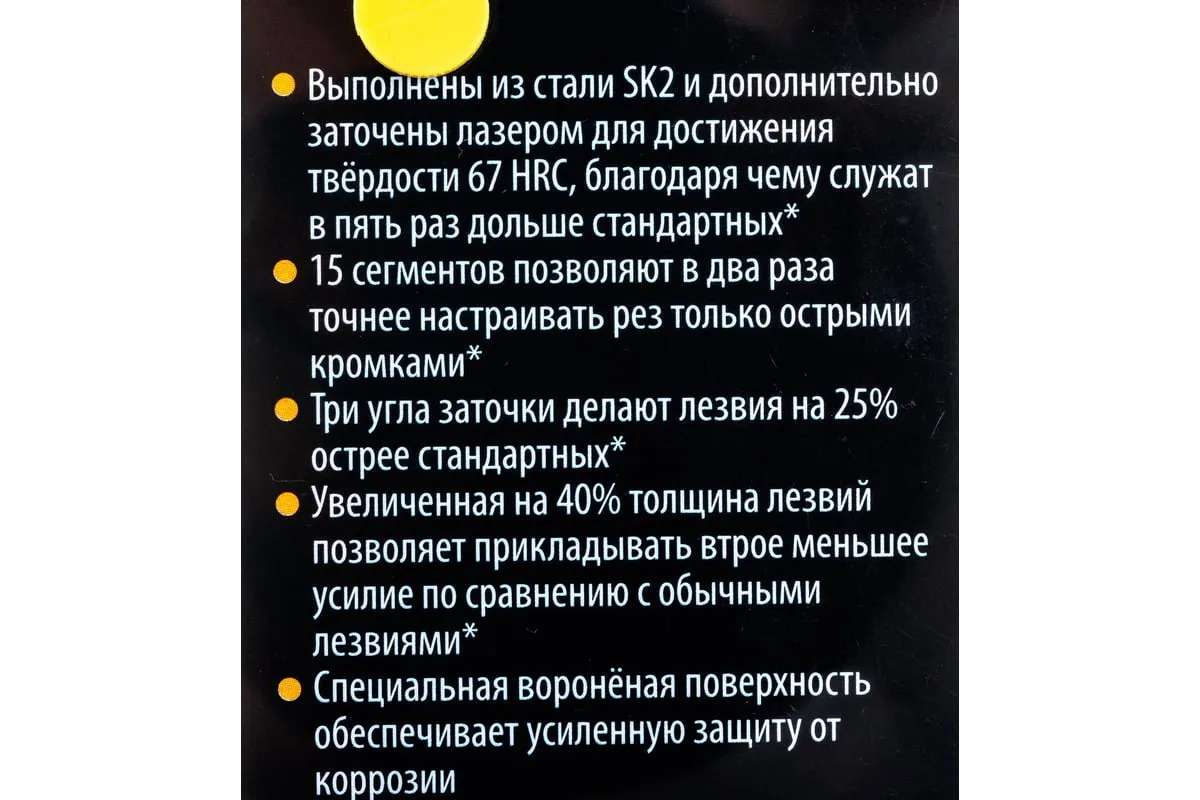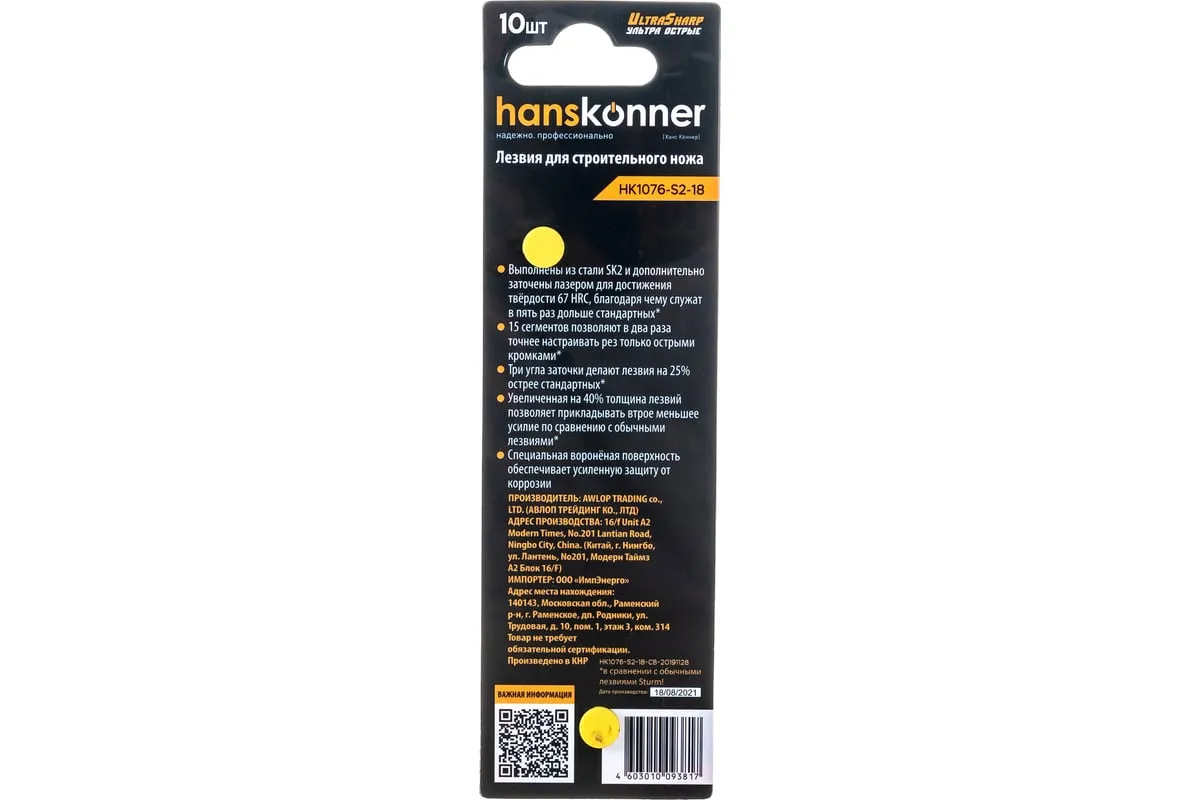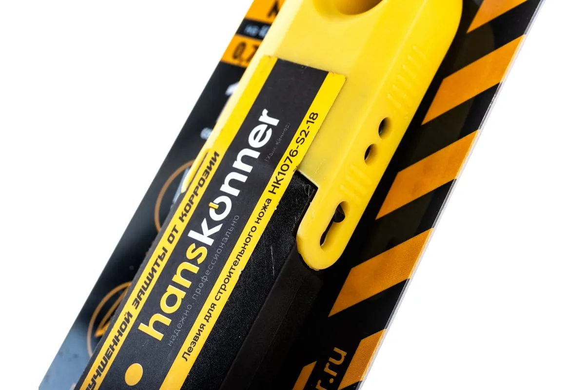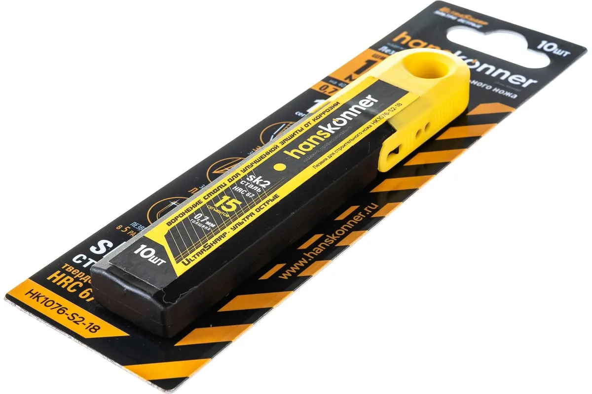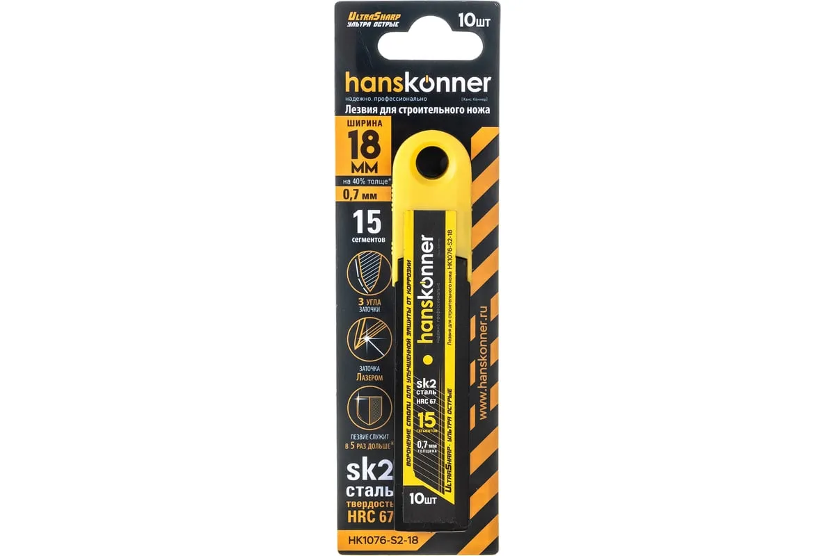 Лезвия Hanskonner HK1076-S2-18 предназначены для ножа. Изготавливаются изстали SK2и затачиваются лазером для достижения твёрдости 67 HRC, благодаря чемуслужат в пять раз дольшестандартных лезвий. Оснащены пятнадцатью сегментами, что позволяет точнее настраивать рез только острыми кромками. Обладают тремя углами заточки, которые делают лезвияна 25% острее. Чтобы прикладывать меньше усилий при работе лезвия делают почтина 40% толще обычных. Также они обладают специальной воронёной поверхностью, которая способна обеспечитьусиленную защиту от коррозии.
