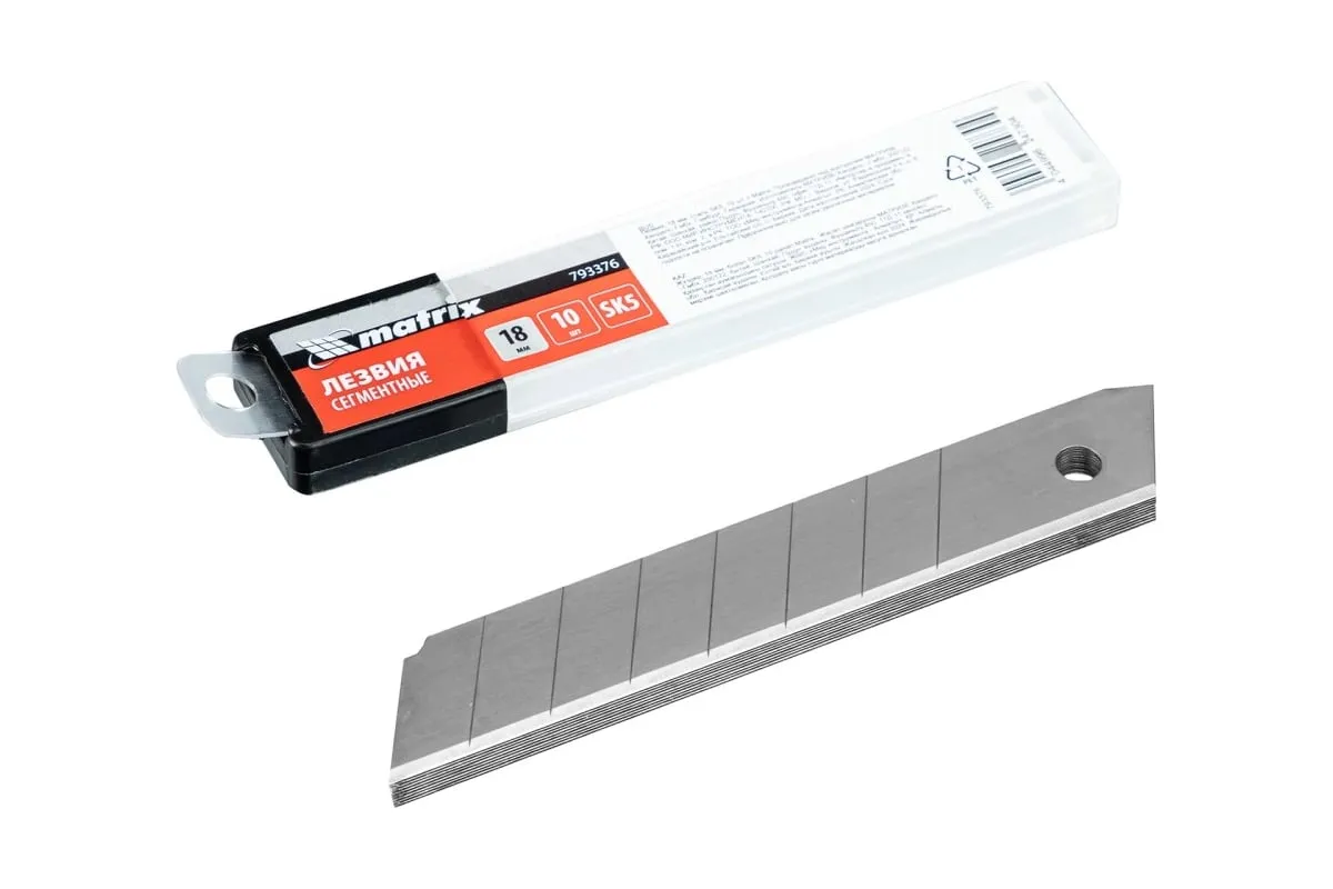 Лезвия Matrix 793376 из стали SK5, шириной 18 мм и длиной 100 мм, 10 шт. в упаковке, — сменные режущие элементы для монтажных ножей соответствующего типоразмера. Режут бумагу, пленку, картон, а также плотные материалы: линолеум, пластик, гипсокартон. Используются во время проведения строительных и отделочных работ, также полезны в быту.