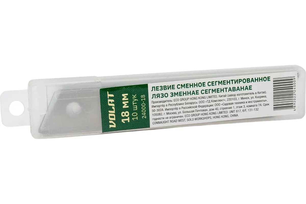 Лезвия сменные сегментированные 10 шт, 18 мм ВОЛАТ 24000-18 используются как расходный материал для пистолетных ножей 24100, 24101, 24102, ST0938, ST0939. Подходят для бумаги, картона, обоев. Изготовлены из инструментальной легированной стали.