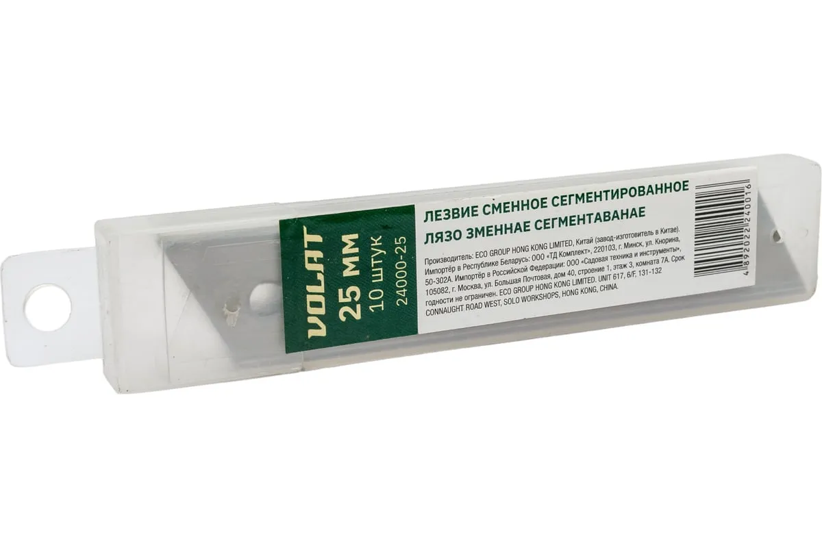 Лезвия сменные сегментированные 10 шт, 25 мм ВОЛАТ 24000-25 используются как расходный материал для пистолетного ножа 24103. Подходят для бумаги, картона, обоев, линолеума, кожи. Изготовлены из углеродистой инструментальной стали.