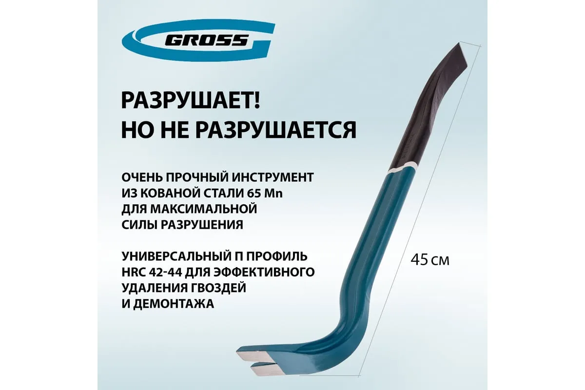 Лом-гвоздодер 450 мм GROSS 25236 применяется для вытаскивания гвоздей и используется как рычаг для приподнятия тяжёлых грузов. Изготовлен из рельсовой стали, что гарантирует высокую прочность. Двутавровый профиль усиливает инструмент на момент излома. Благодаря антикоррозионному покрытию повышен срок службы инструмента.