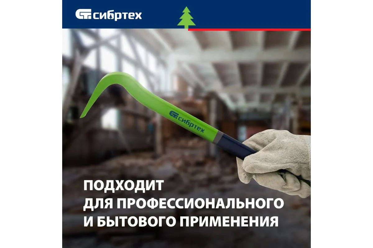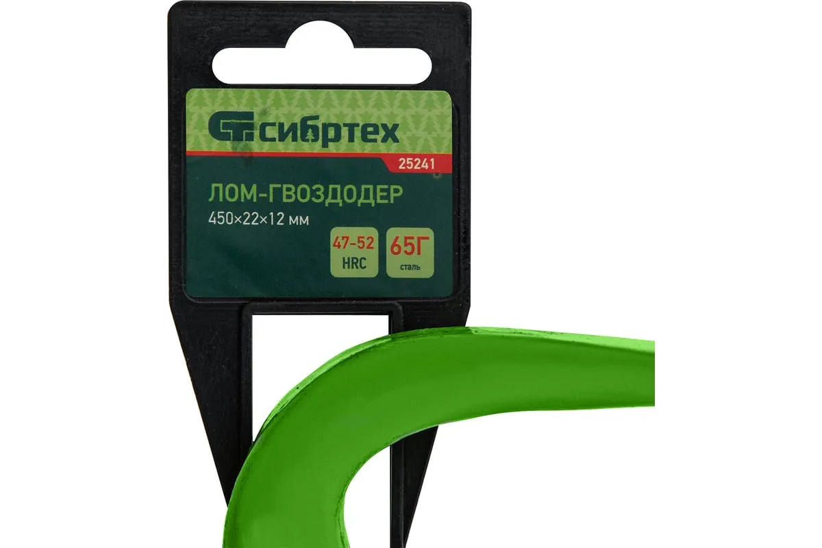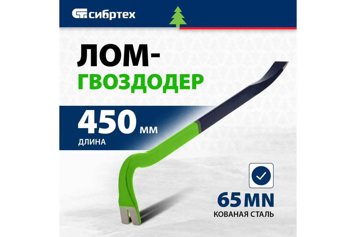 Лом-гвоздодер Сибртех 25241, 450 х 22 х 12 мм, позволяет удалять гвозди, а также срывать доски с пола, разбирать ящики, демонтировать заборы, вагонку со стен или шифер с крыши. Может служить рычагом для поднимания грузов, поскольку прямоугольно-овальный профиль значительно усиливает его на момент излома. Инструмент подходит для профессионального и бытового применения.
