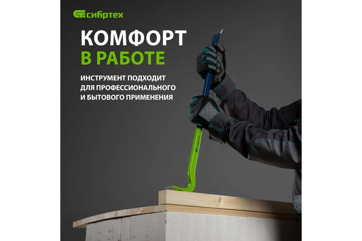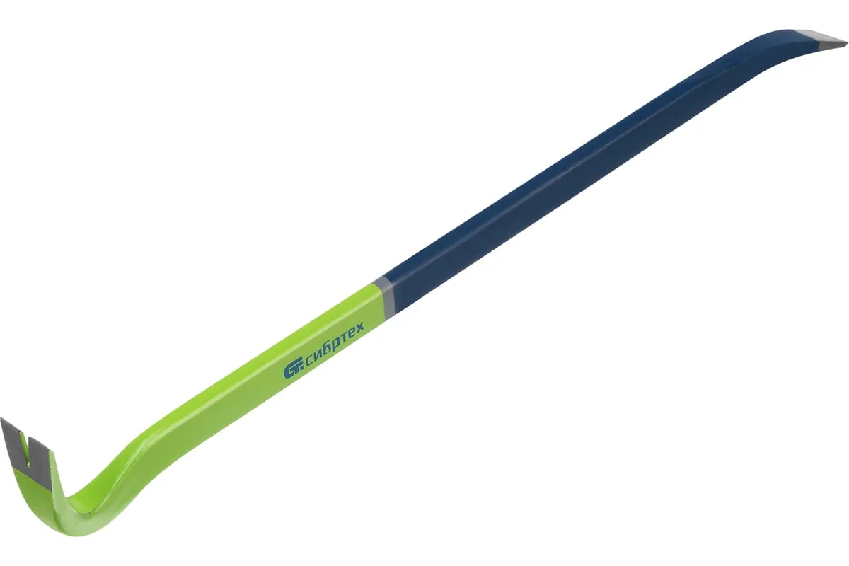 Лом-гвоздодер Сибртех 25243, 600 х 25 х 12 мм, позволяет удалять гвозди, а также срывать доски с пола, разбирать ящики, демонтировать заборы, вагонку со стен или шифер с крыши. Может служить рычагом для поднимания грузов, поскольку прямоугольно-овальный профиль значительно усиливает его на момент излома. Инструмент подходит для профессионального и бытового применения.