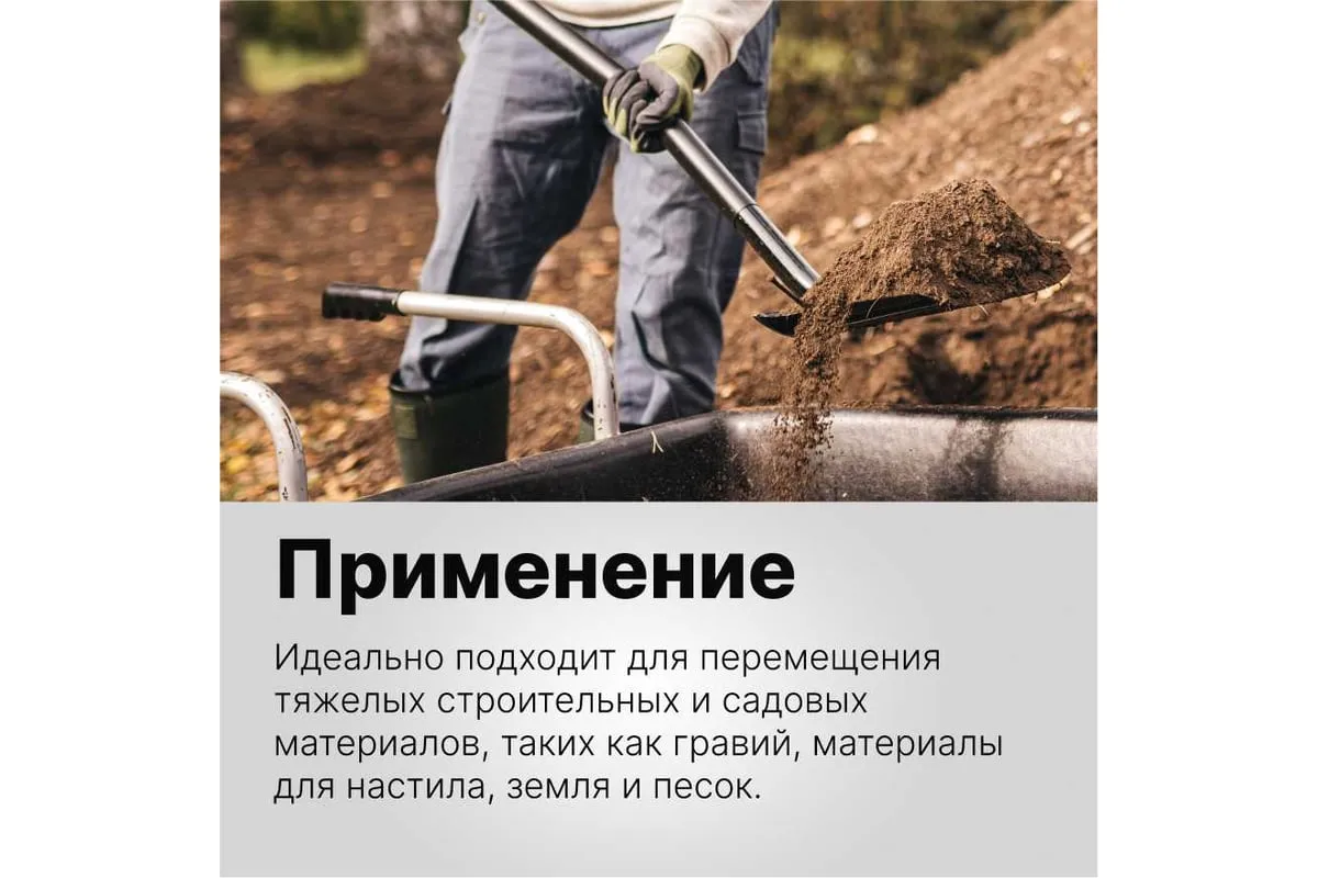 Идеально подходит для перемещения тяжелых строительных и садовых материалов, таких как гравий, материалы для настила, земля и песок. D-образная ручка подходит для использования в перчатках или без них.