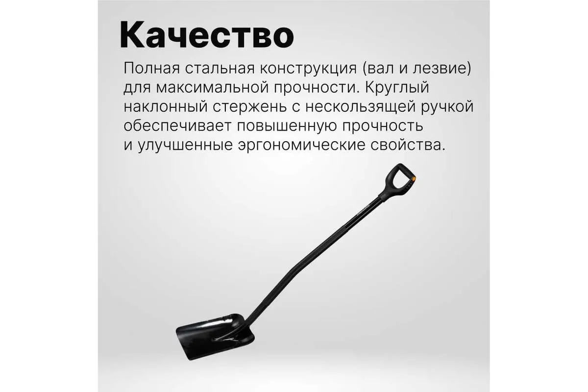 Полная стальная конструкция (вал и лезвие) для максимальной прочности. Круглый наклонный стержень с нескользящей ручкой обеспечивает повышенную прочность и улучшенные эргономические свойства.