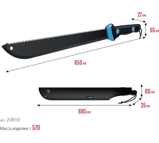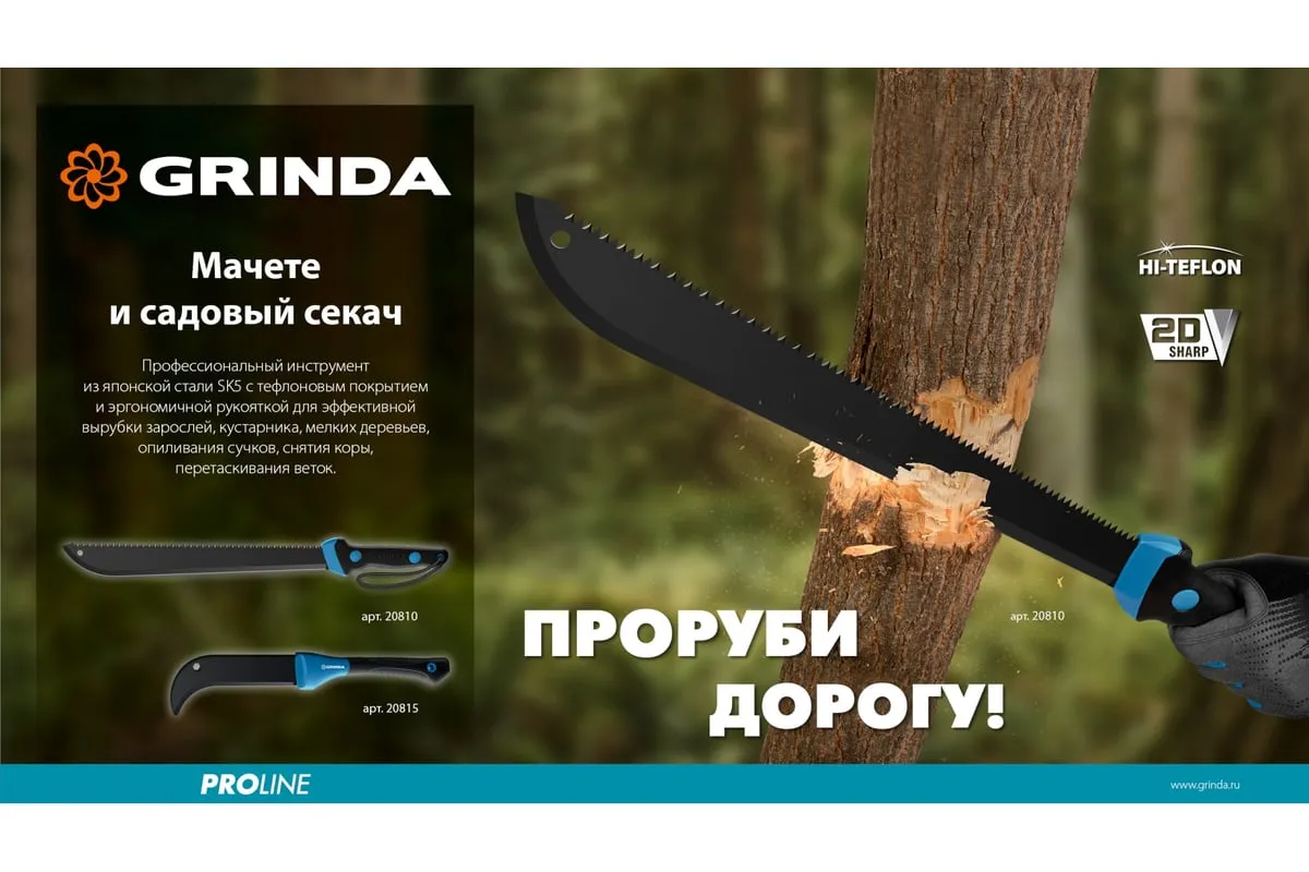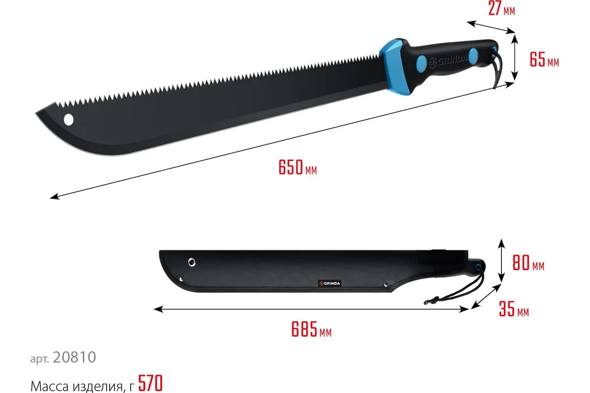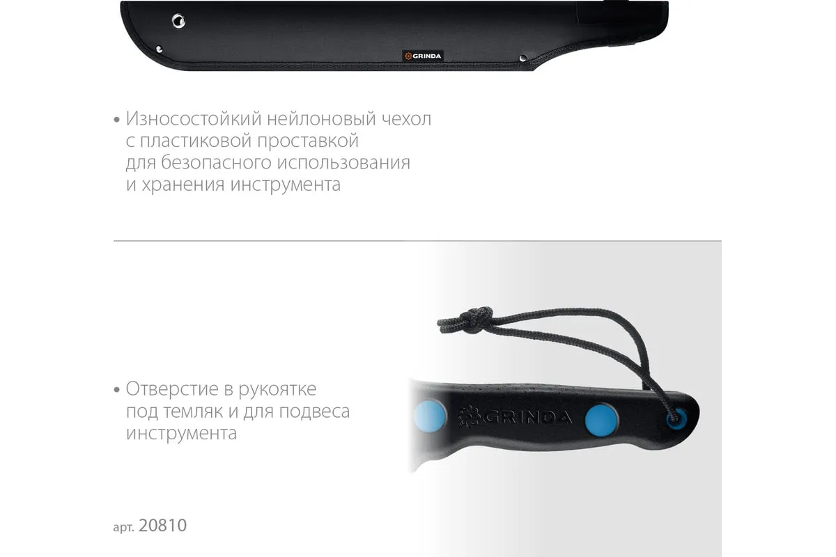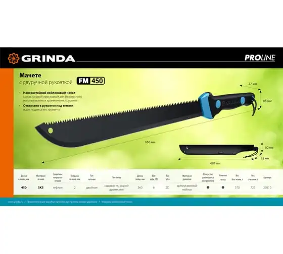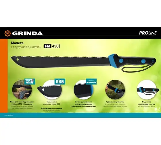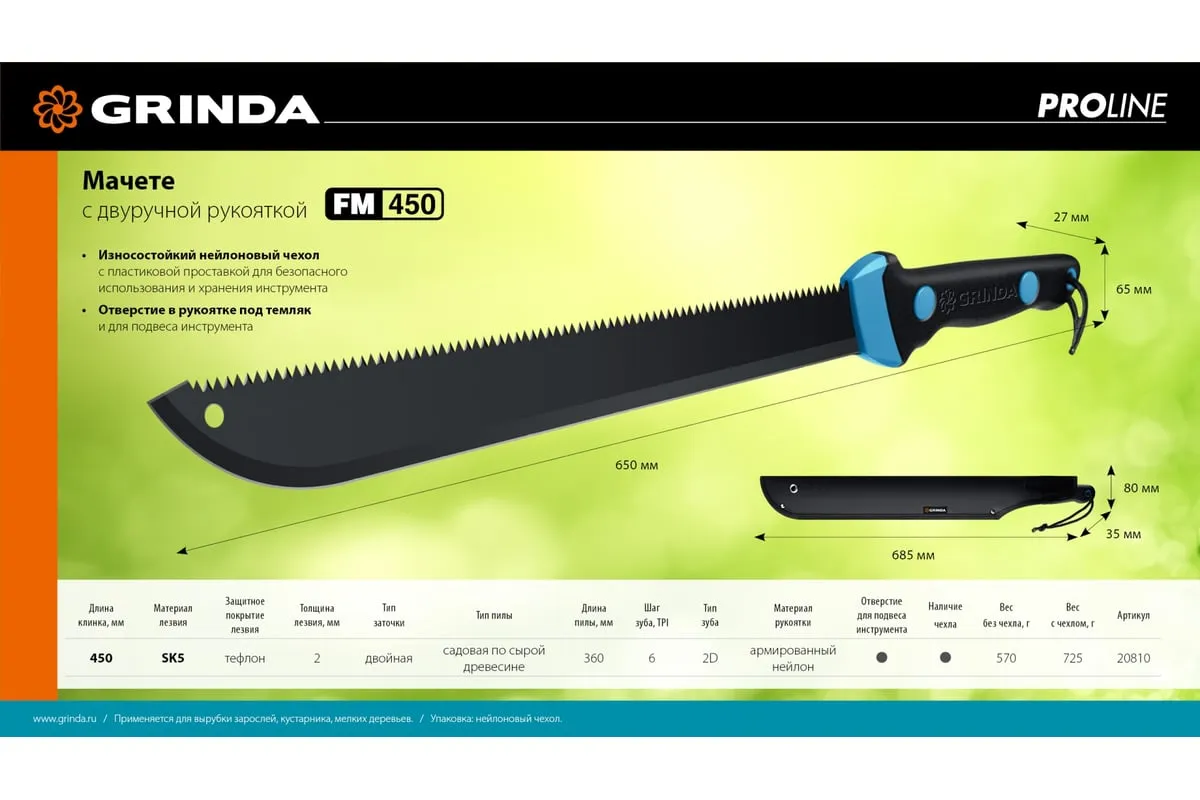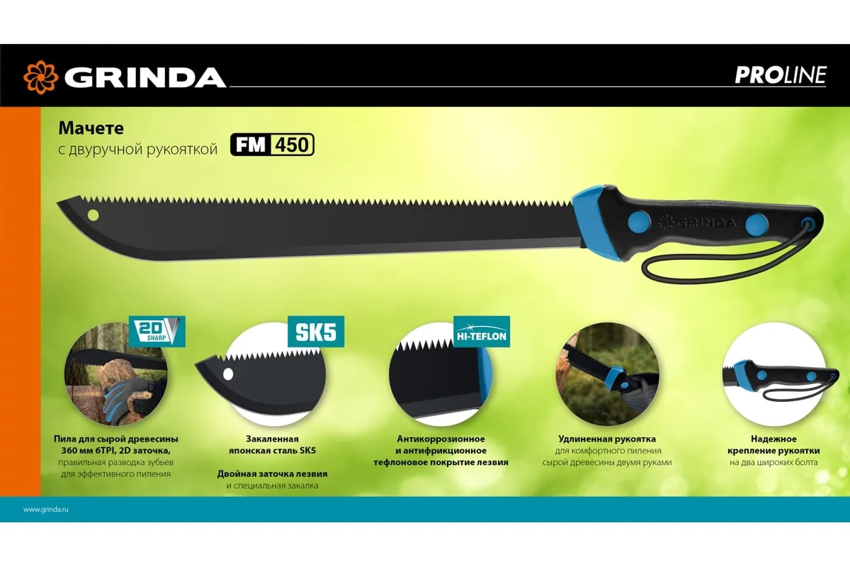 Мачете 450/650 мм Grinda PRO-Line FM 450, 20810 - профессиональный инструмент из японской стали SK5 c удлиненной рукояткой для вырубки зарослей, кустарника, мелких деревьев, опиливания веток.
