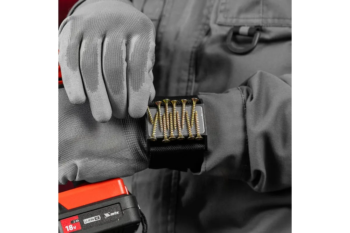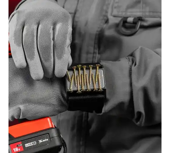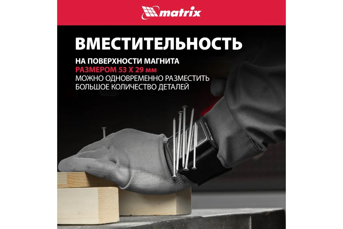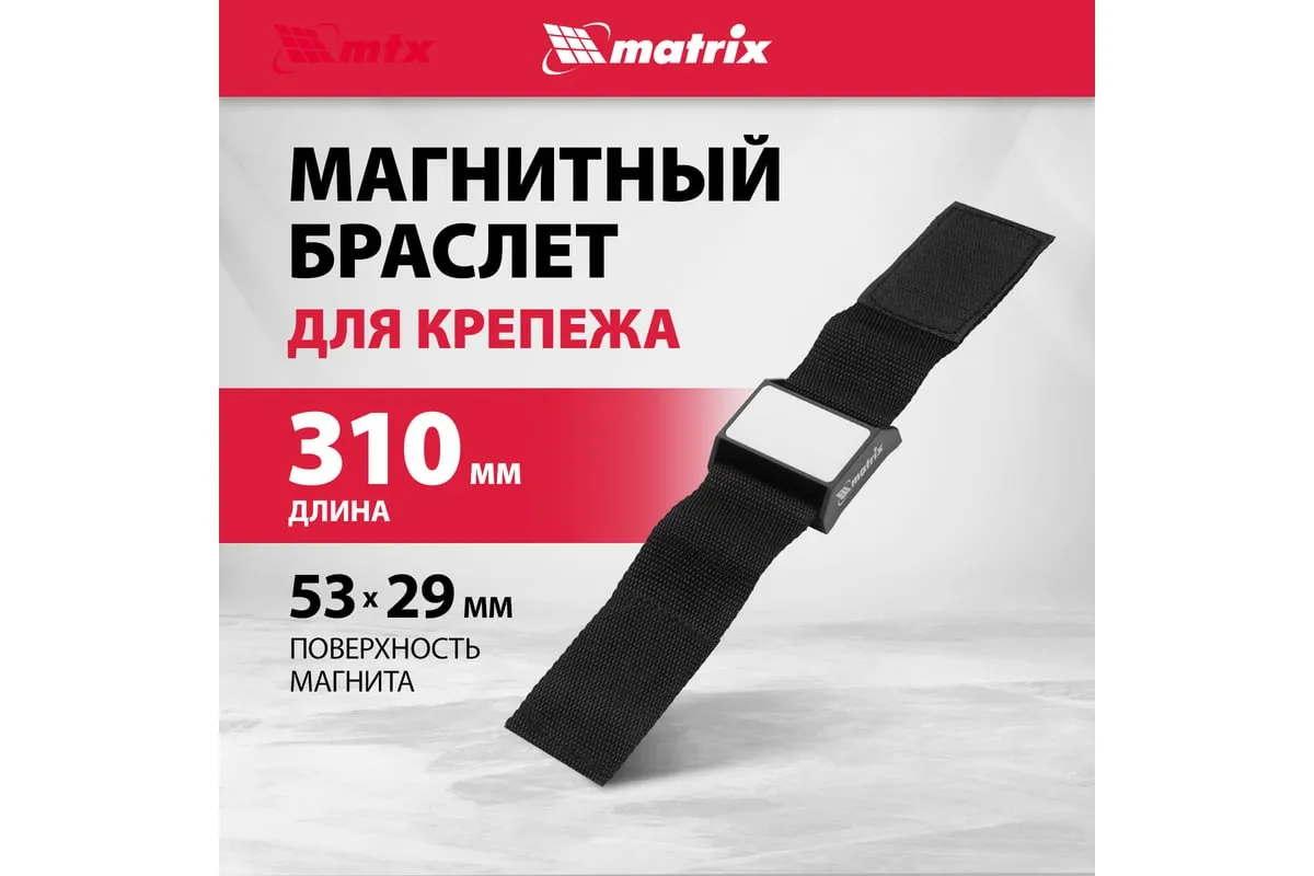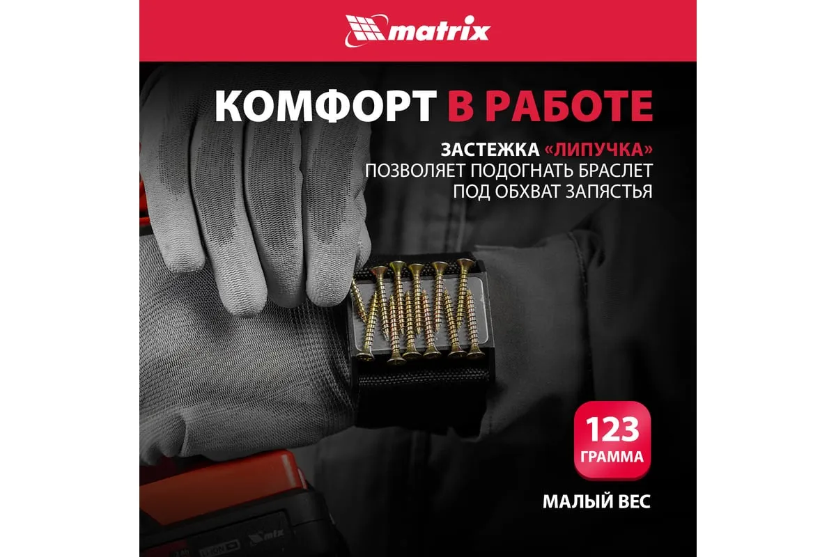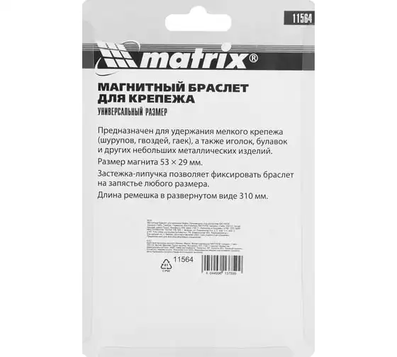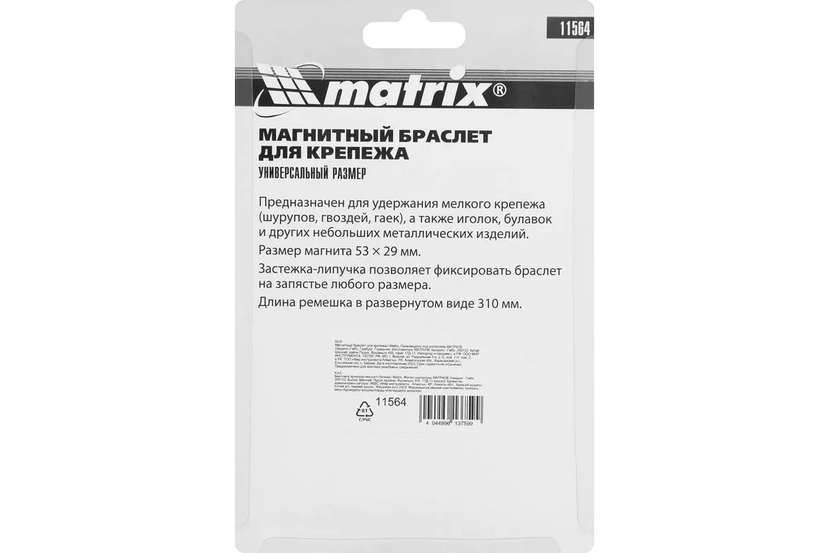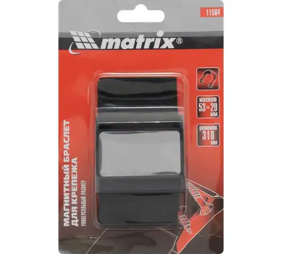 Магнитный браслет для крепежа MATRIX 11564 подходит для профессионального и домашнего использования. Крепится на запястье любого размера. Уменьшает вероятность потери мелких деталей. Магнит притягивает мелкий крепеж, биты, метизы, иголки и т.п. Длина ремешка составляет 310 мм.