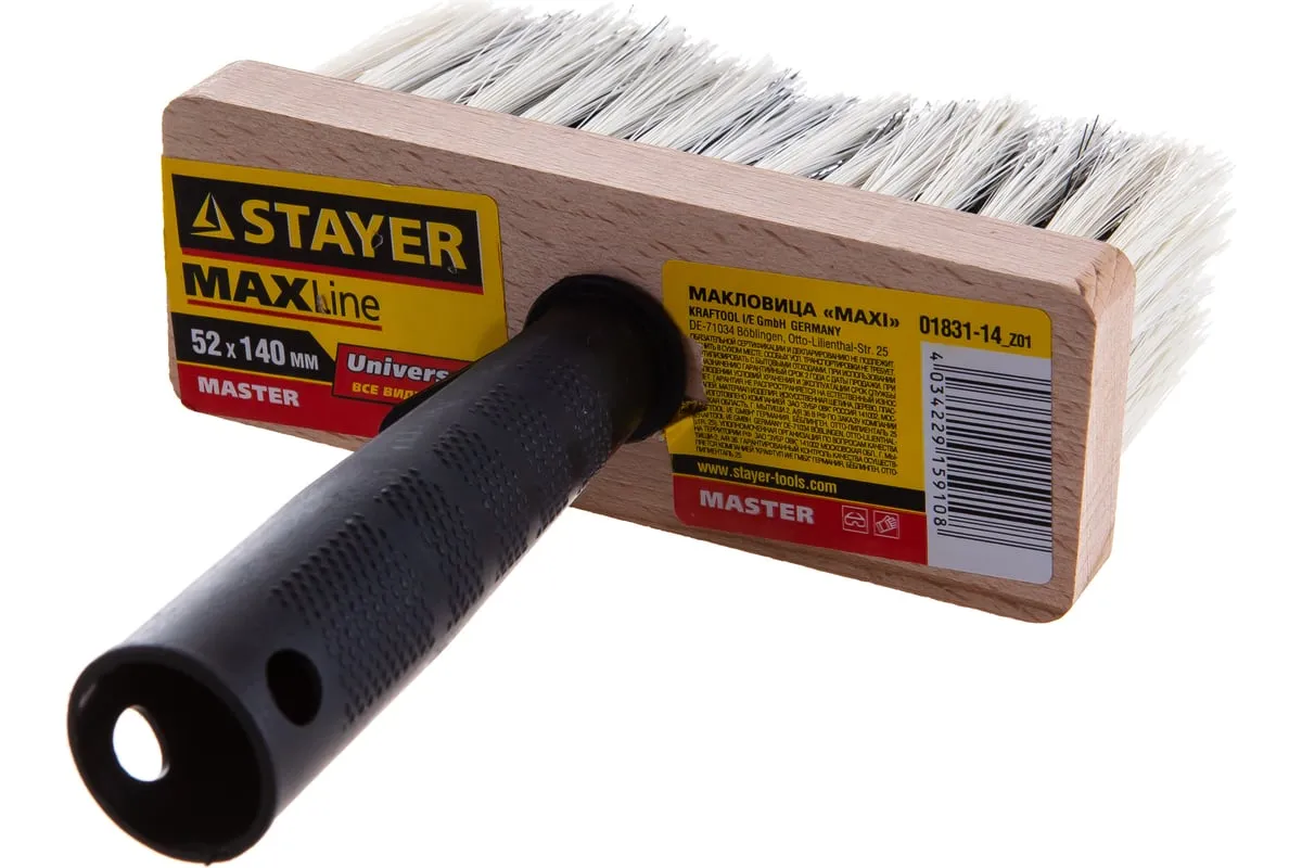 Макловица STAYER MASTER 52х140мм 01831-14_z01 используется на больших поверхностях, например для нанесения грунтовки или побелки на потолок. Изделие состоит из искусственной щетины, деревянного бандажа и удобной пластиковой рукоятки. На ручке есть отверстие, за которое макловицу можно подвешивать на ведро. Размер - 52х140 мм.