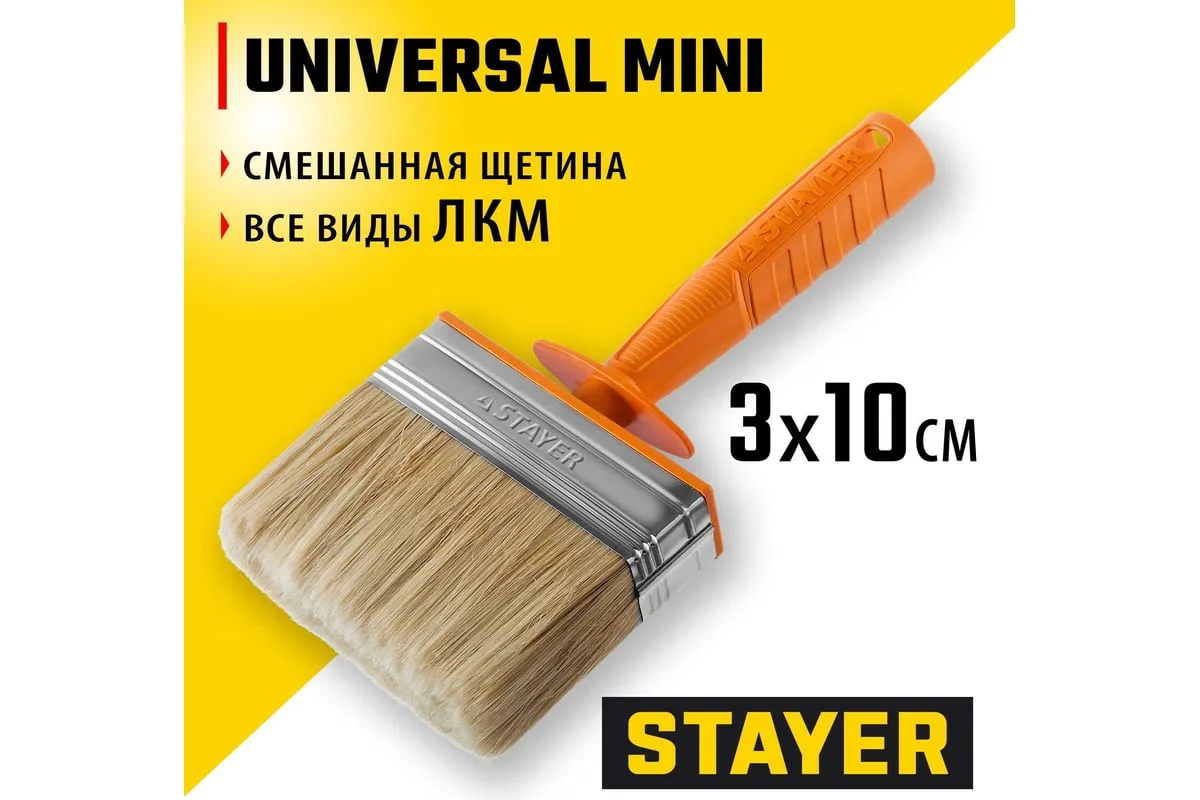Макловица STAYER Universal MINI 0182-10 - малярная кисть, используемая для работы со всеми типами ЛКМ, а так же грунтовки, побелки на большие поверхности, клеевых составов на обои, размывки потолков. Щетина кисти надежно закреплена бандажом из никелированной стали, а наличие удобной пластмассовой рукоятки обеспечит комфортную работу. Предназначена для окрашивания поверхностей большой площади, для размыва старых лакокрасочных покрытий, нанесения клеевых составов. Может испрользоваться со всеми видами ЛКМ. Перед использованием и после окончания работ промойте кисть в растворителе.