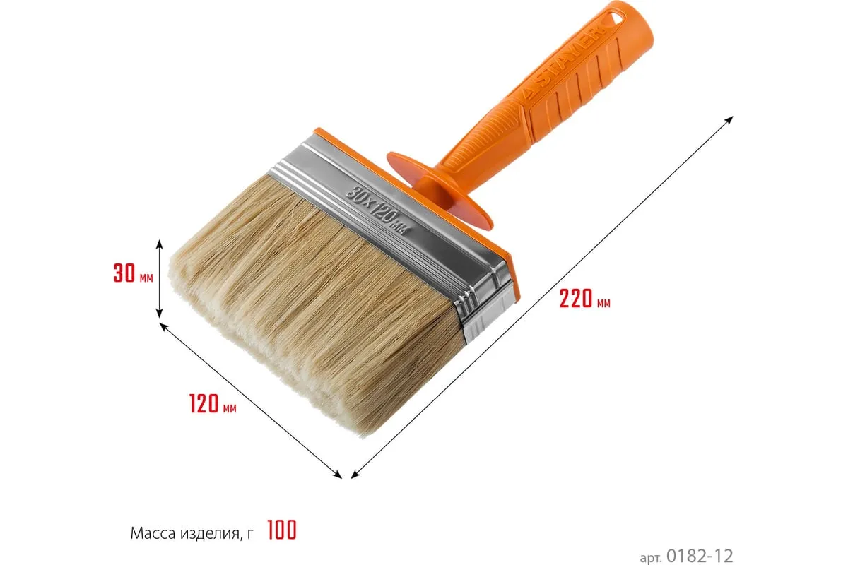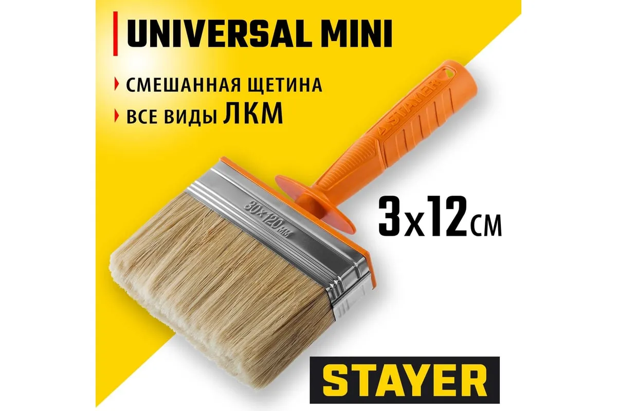 Макловица STAYER Universal MINI 0182-12 - малярная кисть, используемая для работы со всеми типами ЛКМ, а так же грунтовки, побелки на большие поверхности, клеевых составов на обои, размывки потолков. Щетина кисти надежно закреплена бандажом из никелированной стали, а наличие удобной пластмассовой рукоятки обеспечит комфортную работу., Предназначена для окрашивания поверхностей большой площади, для размыва старых лакокрасочных покрытий, нанесения клеевых составов. Может испрользоваться со всеми видами ЛКМ. Перед использованием и после окончания работ промойте кисть в растворителе.