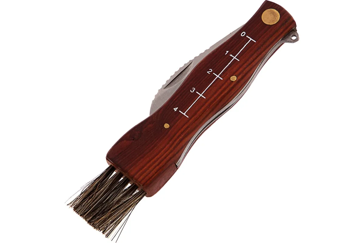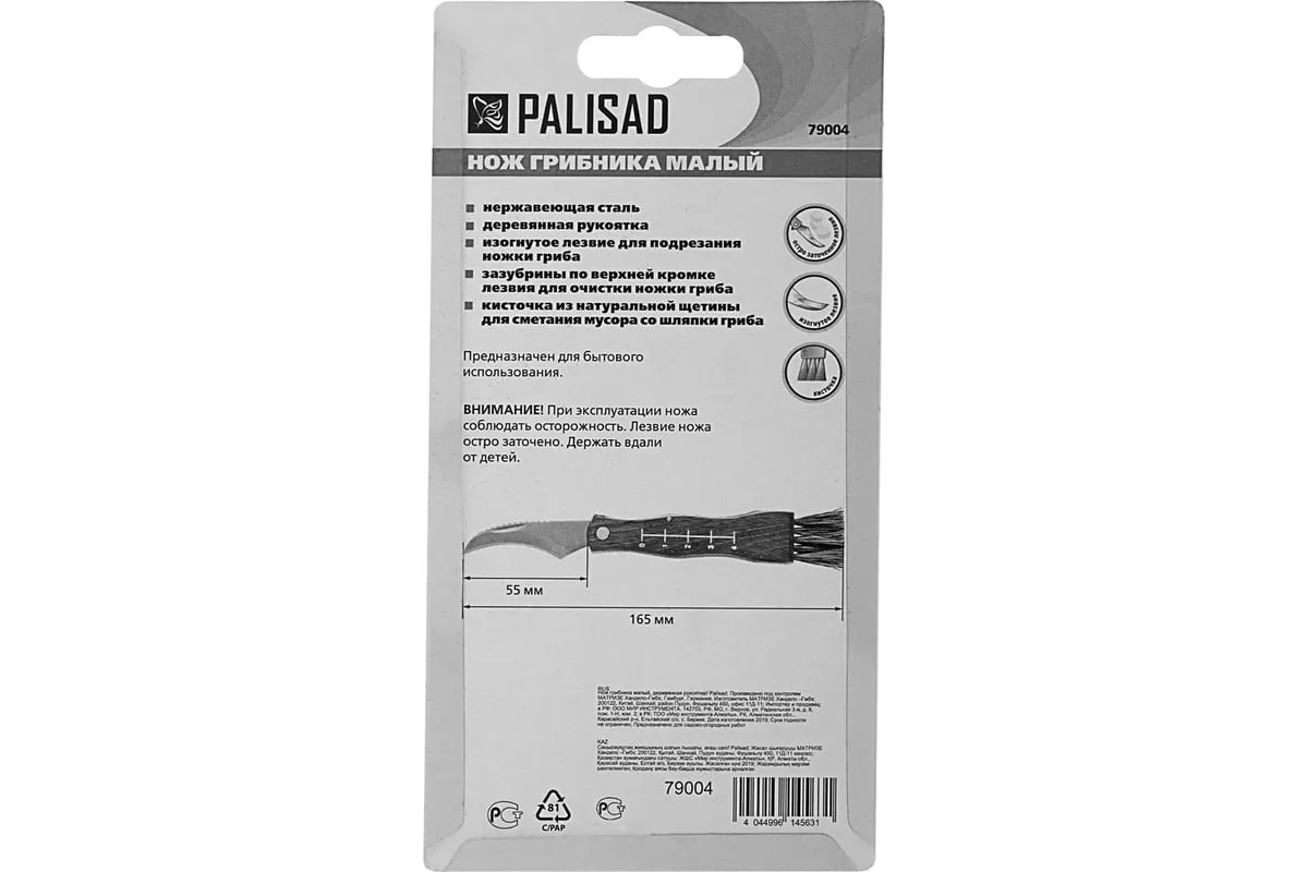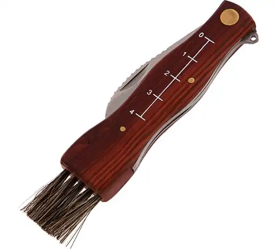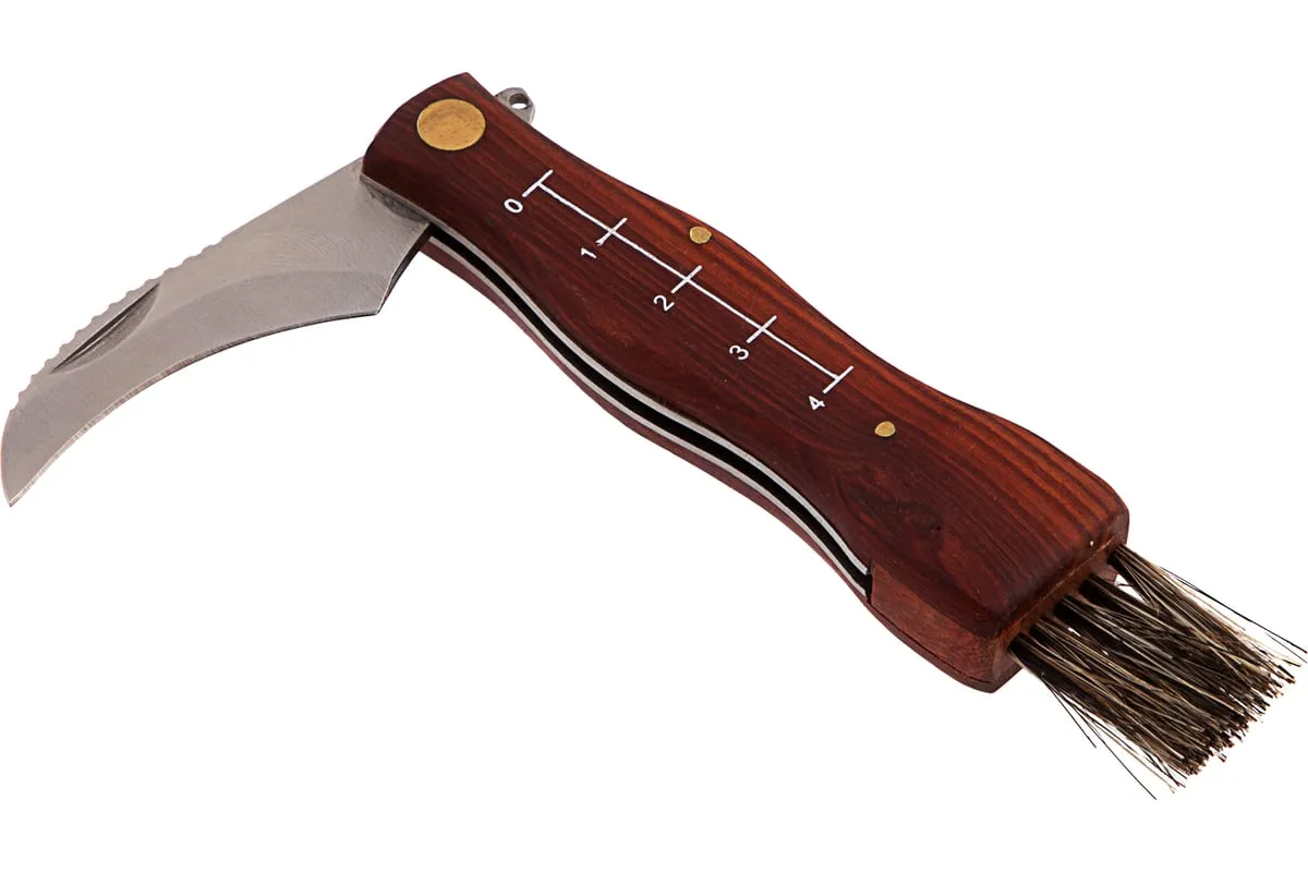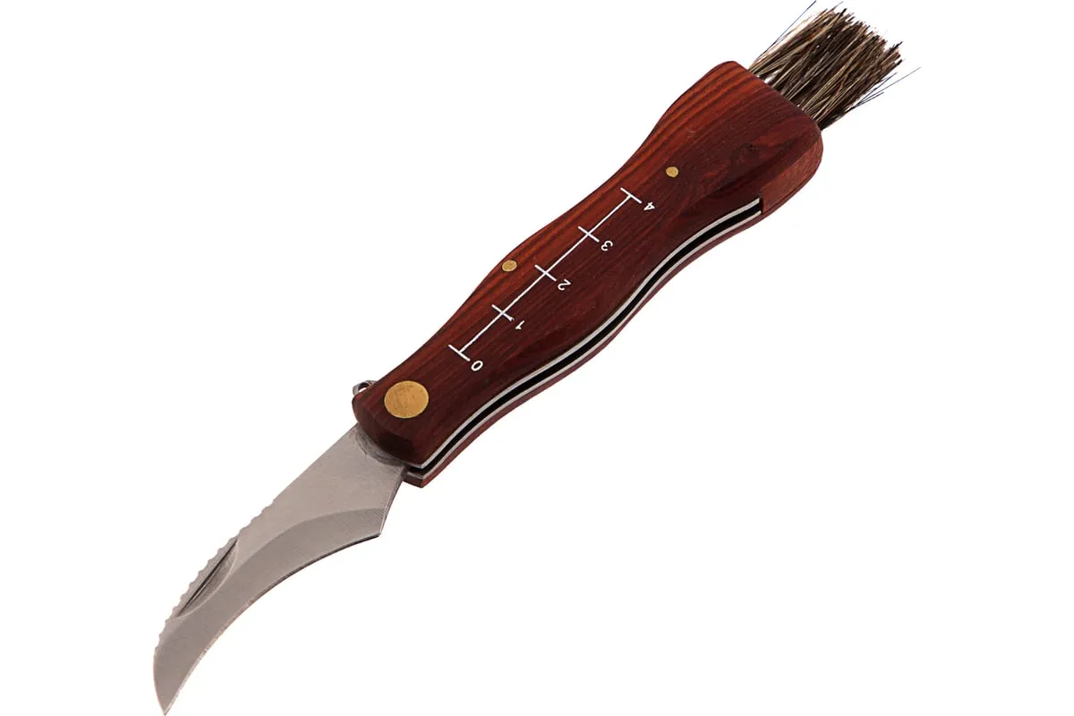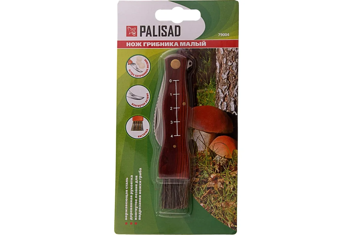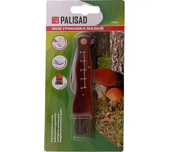 Малый нож грибника PALISAD 79004 надежен и практичен в использовании. Подходит для подрезания ножки гриба, а не для фронтальной нарезки. Нож имеет изогнутую форму клинка, напоминающую серп. Обладаетвысокой прочностью и твердостью. Зубчатая верхняя кромкапозволяет легко счищать остатки земли с ножки гриба. Конец деревянной рукоятки оснащен специальной кисточкой, благодаря которойможно очистить шляпку гриба от скопившегося мелкого мусора.