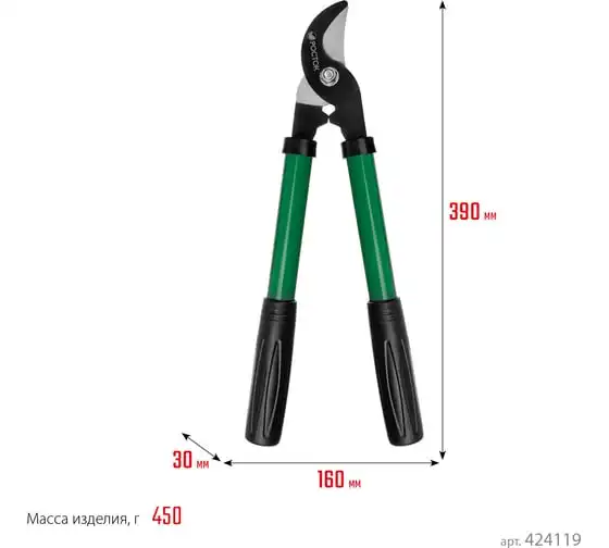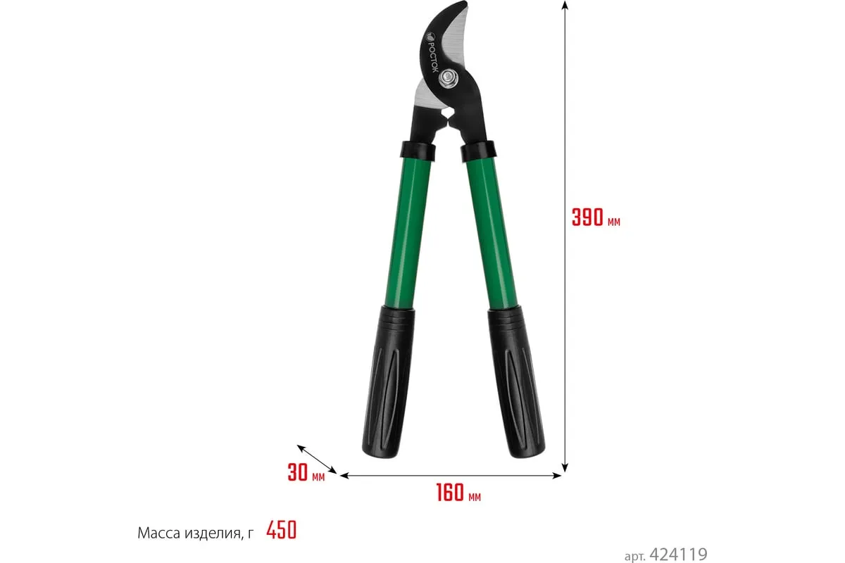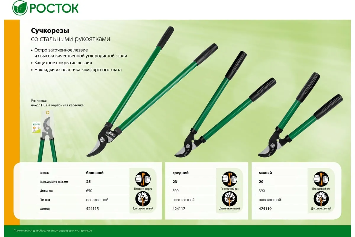 Сучкорез РОСТОК 424119, предназначен для обрезки веток кустарников или деревьев. Лезвие изготовлено из высококачественной углеродистой стали и остро заточено. Защитное покрытие лезвия. Накладки из пластика.