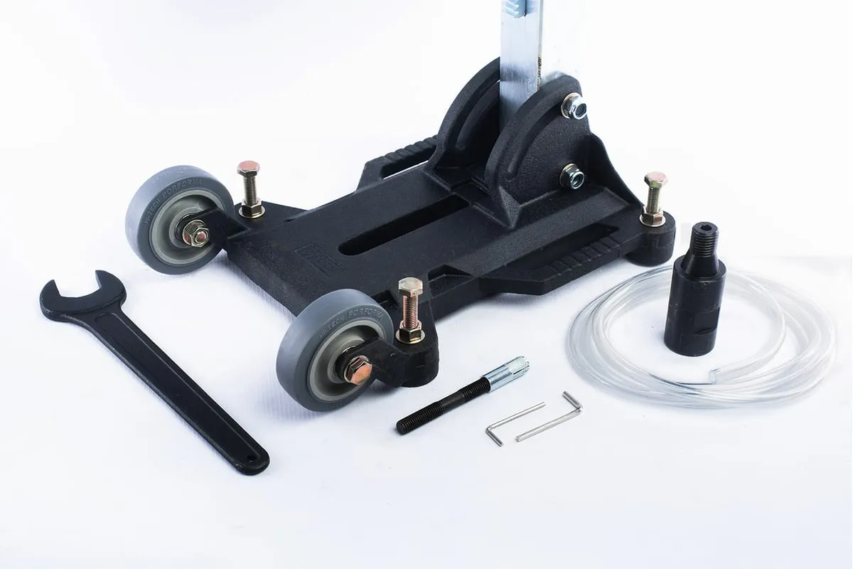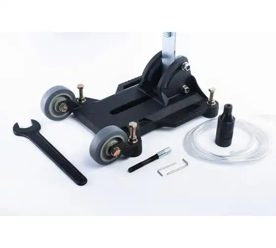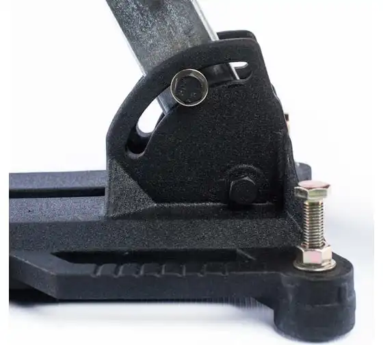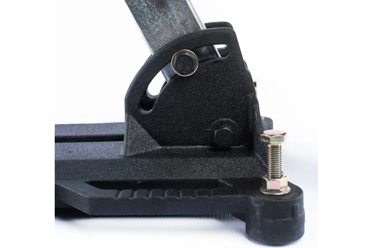 Металлическая конструкция отличается повышенной прочностью и устойчивостью к повреждениям. Рычаг перемещения с пластиковыми наконечниками обеспечивает комфортную работу. Транспортировочные колеса упрощают перемещение оборудования внутри рабочей зоны.