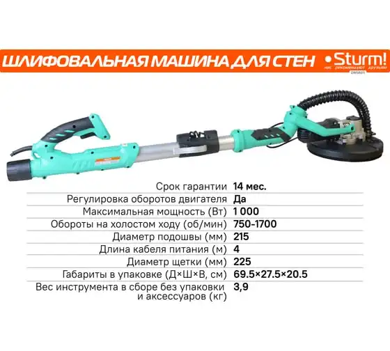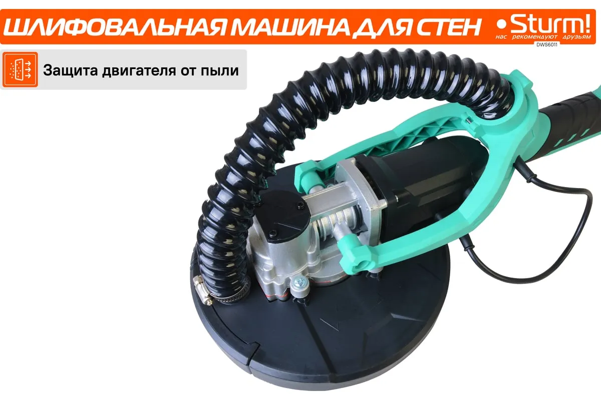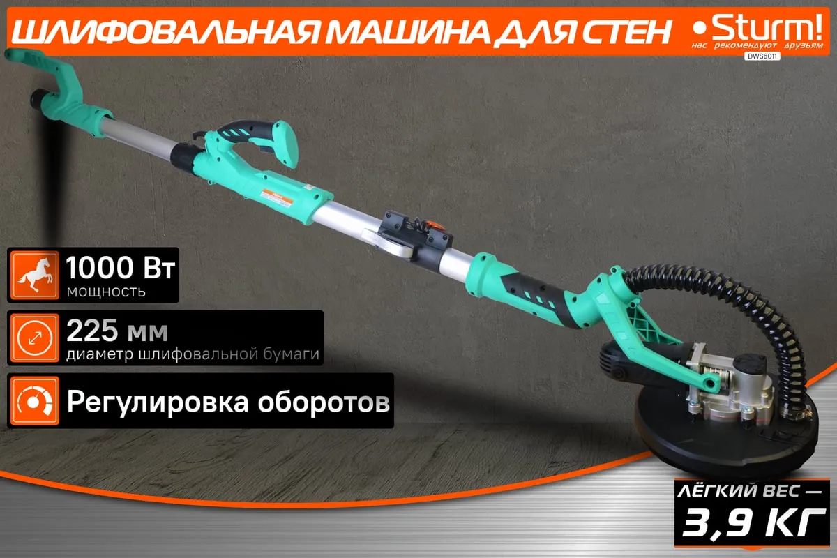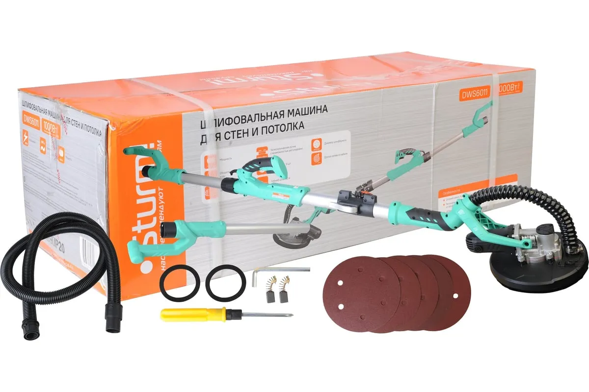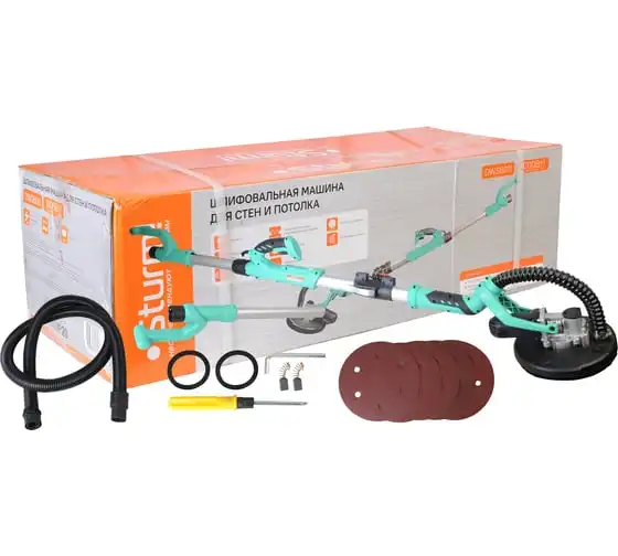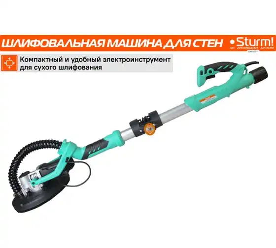 Шлифовальная машина для стен и потолка Sturm! DWS6011 — компактный и удобный электроинструмент для сухого шлифования штукатурки, гипсокартона и тому подобных материалов. В силу своего малого веса и регулируемой телескопической ручки, данная модель, обладает изрядной практичностью в своем применении. Также, на деле, выгодным отличием оказывается надежная защита электродвигателя от пыли.