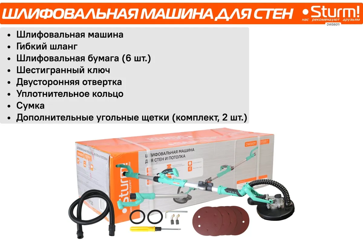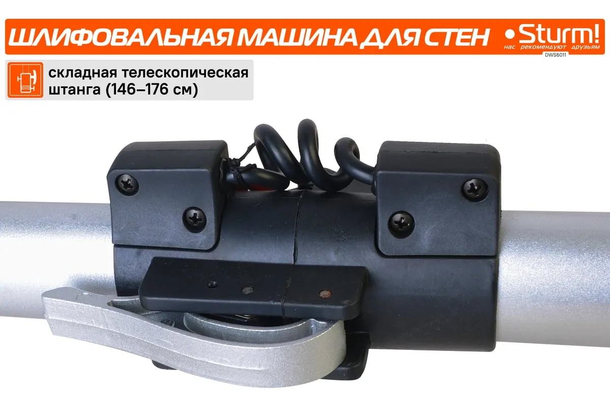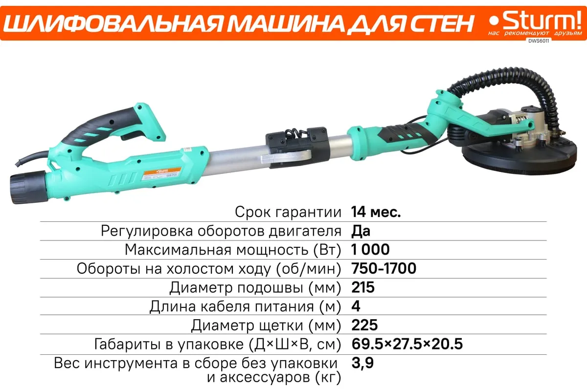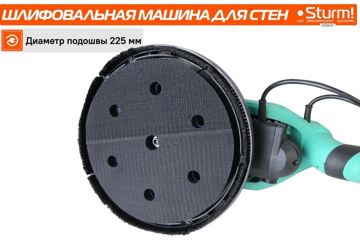 Шлифовальная машина для стен и потолка Sturm! DWS6011 — компактный и удобный электроинструмент для сухого шлифования штукатурки, гипсокартона и тому подобных материалов. В силу своего малого веса и регулируемой телескопической ручки, данная модель, обладает изрядной практичностью в своем применении. Также, на деле, выгодным отличием оказывается надежная защита электродвигателя от пыли.