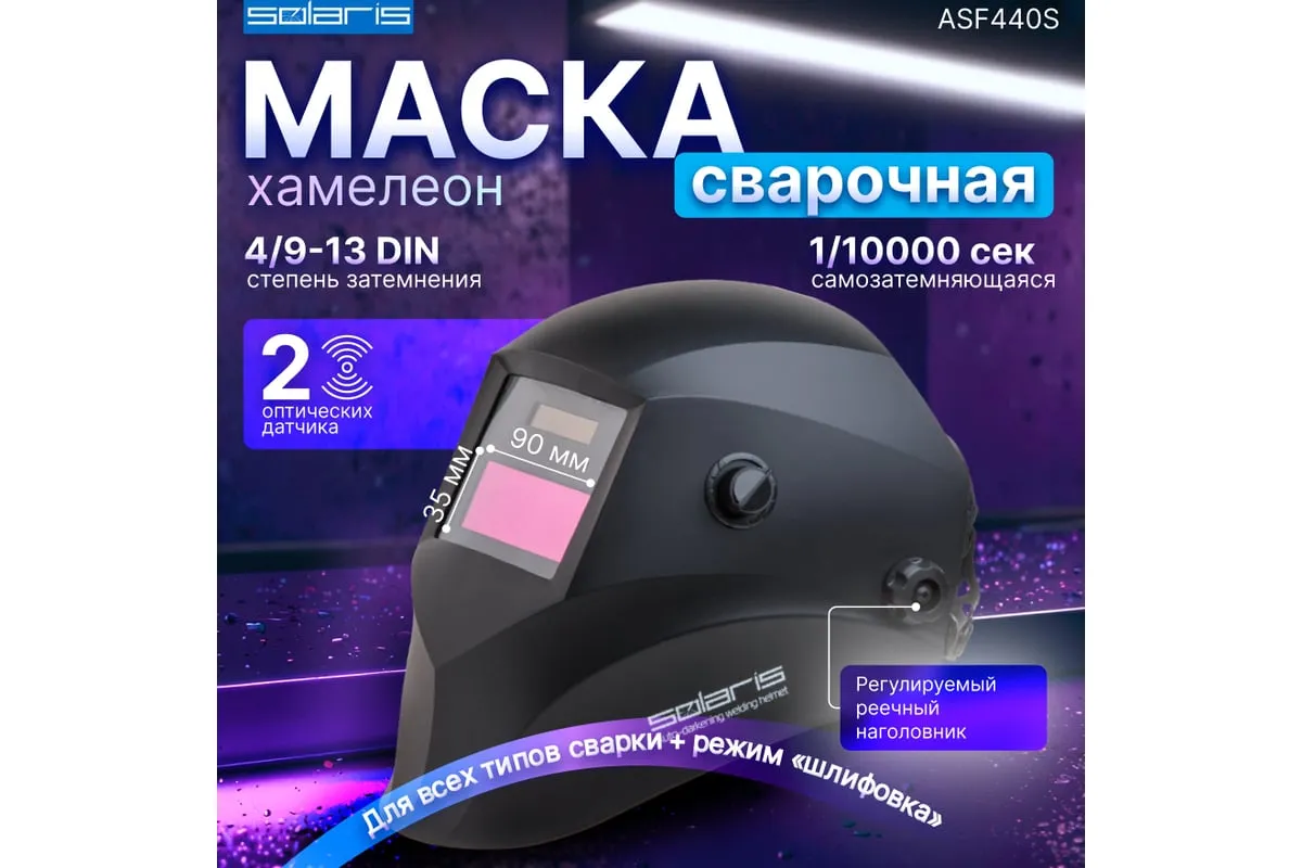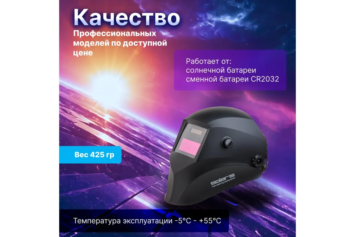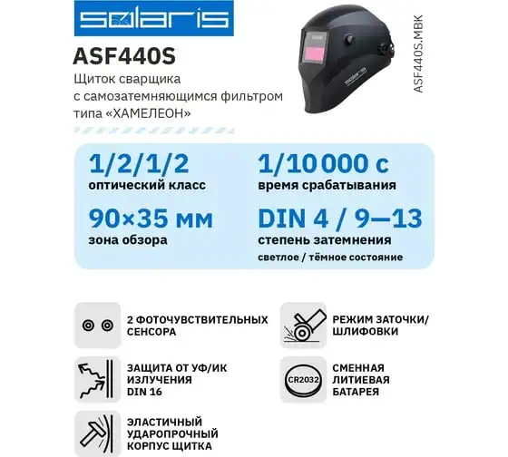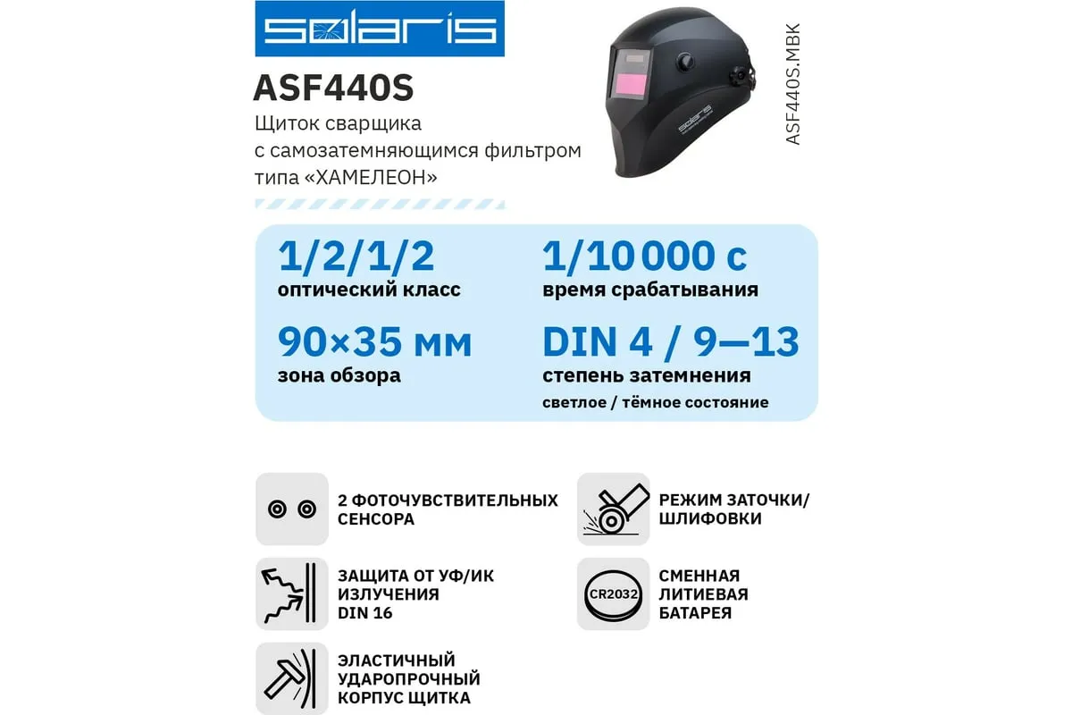 Маска сварочная хамелеон черный ASF440S SOLARIS ASF440S.MBK предназначена для защиты глаз, шеи, лица сварщика от светового и ИК-/УФ-излучения при сварке. Подойдет для начинающих пользователей для периодических работ. Два фоточувствительных сенсора гарантируют срабатывание в различных условиях сварки. Солнечная батарея обеспечивает стабильное питание электроники во время работы. Использование данной модели удобно, поскольку светофильтр автоматически затемняется при зажигании дуги. Применение: MIG, MAG/CO2, SMAW, MMA, воздушно-углеродная резка, импульсная сварка, плазменная сварка и резка.