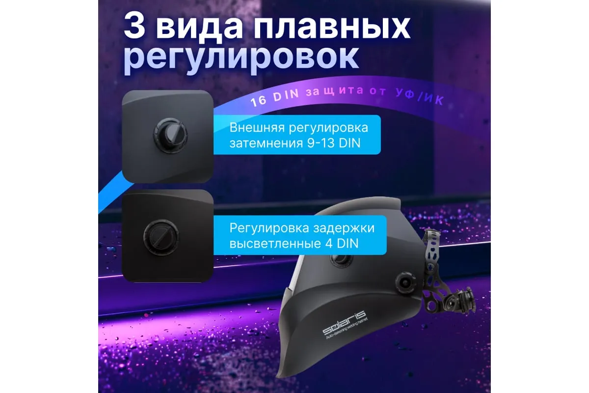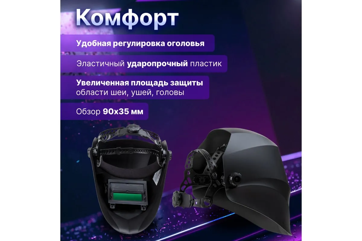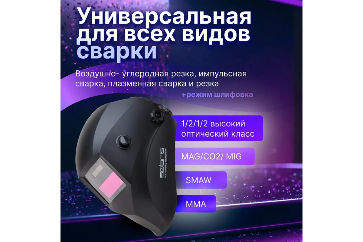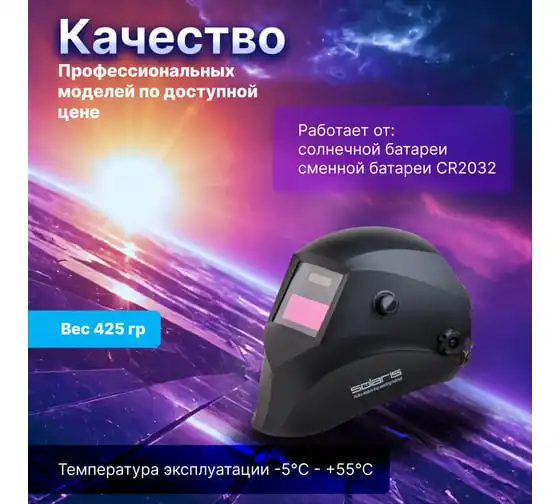 Маска сварочная хамелеон черный ASF440S SOLARIS ASF440S.MBK предназначена для защиты глаз, шеи, лица сварщика от светового и ИК-/УФ-излучения при сварке. Подойдет для начинающих пользователей для периодических работ. Два фоточувствительных сенсора гарантируют срабатывание в различных условиях сварки. Солнечная батарея обеспечивает стабильное питание электроники во время работы. Использование данной модели удобно, поскольку светофильтр автоматически затемняется при зажигании дуги. Применение: MIG, MAG/CO2, SMAW, MMA, воздушно-углеродная резка, импульсная сварка, плазменная сварка и резка.