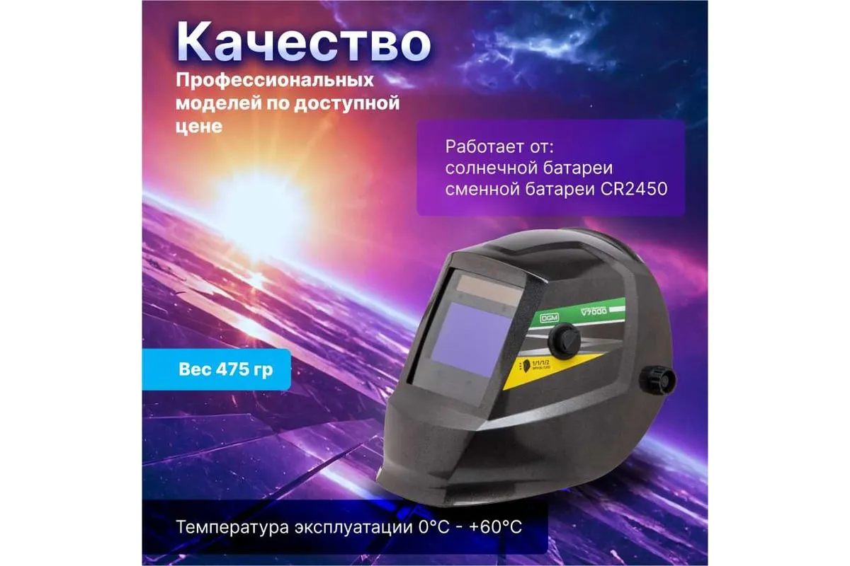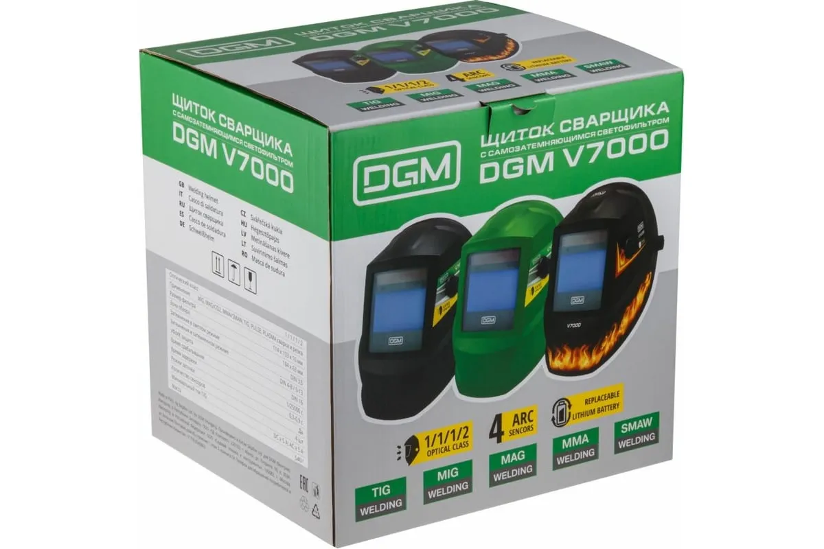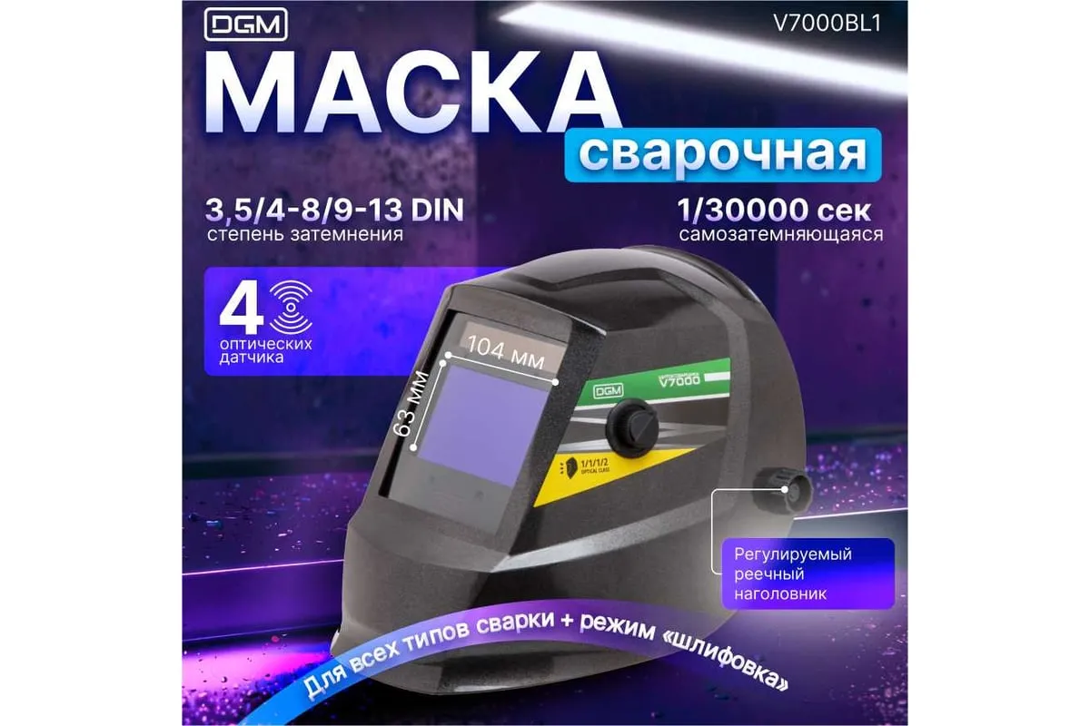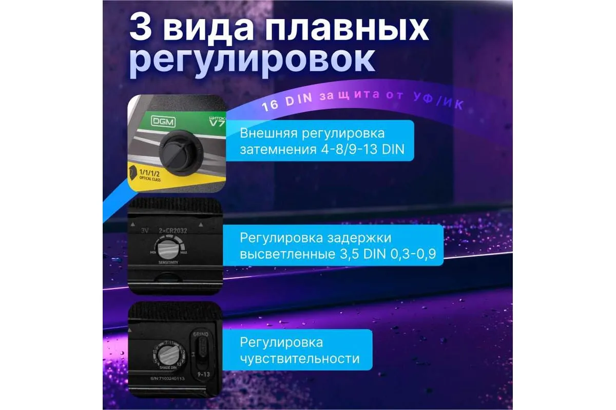 Маска сварочная хамелеон черный DGM V7000BL1 применяется для MIG, MAG/CO2, SMAW, TIG, MMA, воздушно- углеродной резки, импульсной сварки, плазменной сварки и резки. Оснащена качественным светофильтром с 4 фотосенсорами, что позволяет проводить сварочные работы даже на небольших токах в режиме TIG. Оголовье с большим количеством настроек позволит настроить щиток под любого оператора.