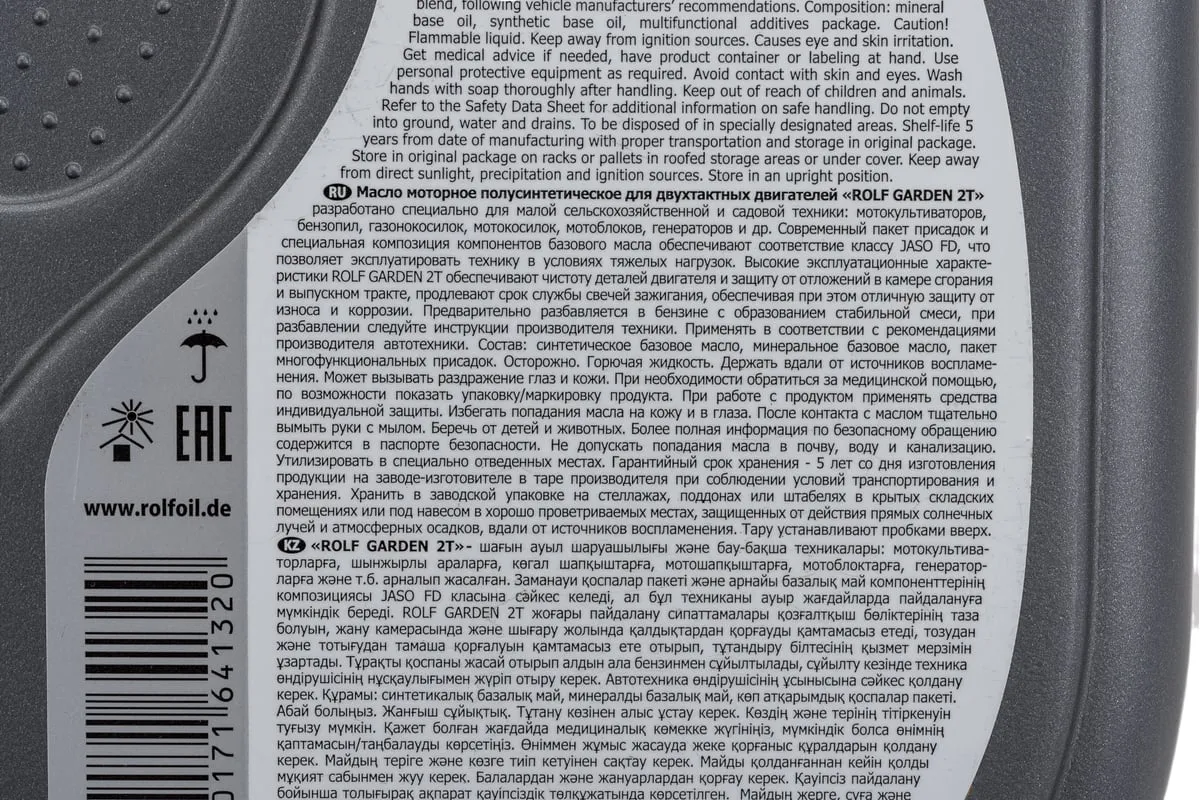 Масло моторное полусинтетическое GARDEN 2Т 1 л Rolf 322665 - малозольное масло для двухтактных двигателей. Соответствует самому высокому эксплуатационному классу JASO FD и позволяет эксплуатировать технику в тяжелых условиях и на высокоскоростных режимах. Высокие эксплуатационные показатели ROLF GARDEN 2T гарантируют чистоту деталей двигателя, обеспечивают защиту от отложений в камере сгорания и выпускном тракте, продлевают срок службы свечей зажигания. Совершенный пакет присадок даёт отличную смазывающую способность независимо от типа системы смазки и охлаждения двигателя, обеспечивая при этом превосходную защиту от износа и коррозии.