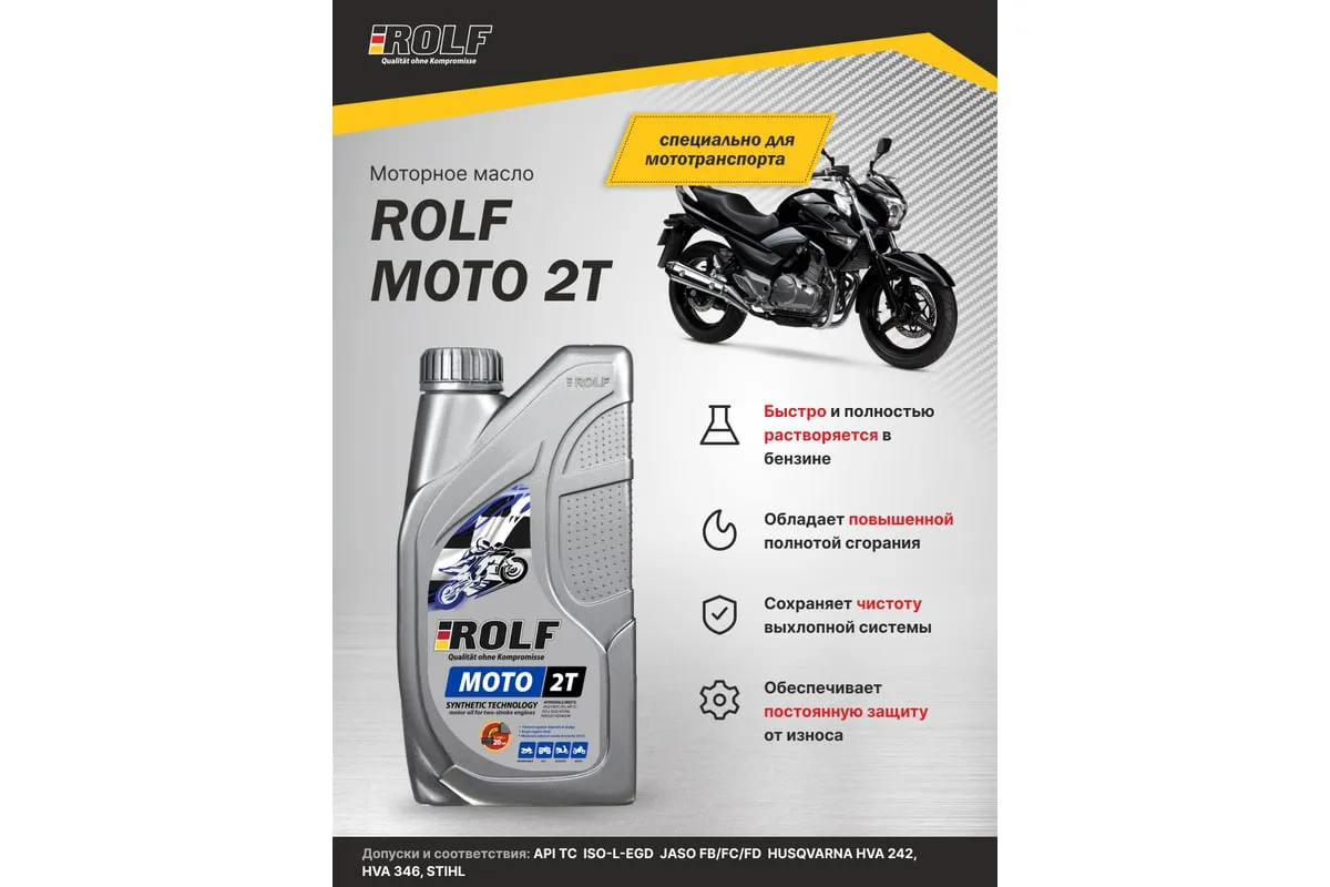 Масло моторное полусинтетическое MOTO 2T пластик 1 л Rolf 322663 - малозольное масло для двухтактных двигателей. Отвечает требованиям самой жесткой категории JASO FD, что позволяет эксплуатировать технику в тяжелых условиях и на высокоскоростных режимах. Высокие эксплуатационные показатели ROLF MOTO 2T гарантируют чистоту деталей двигателя, обеспечивают защиту от отложений в камере сгорания и выпускном тракте, продлевают срок службы свечей зажигания. Совершенный пакет присадок даёт отличную смазывающую способность независимо от системы смазки и охлаждения двигателя, обеспечивая при этом превосходную защиту от износа и коррозии.