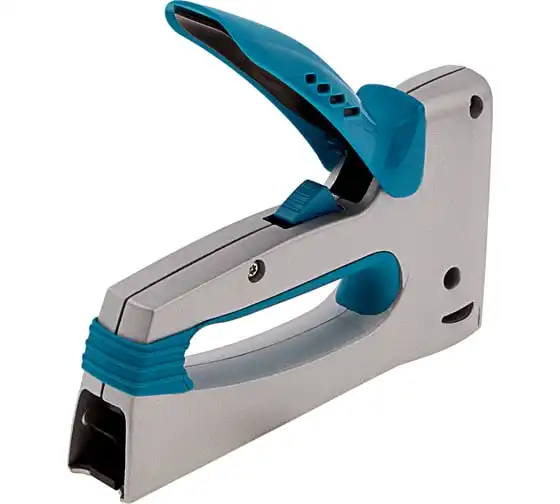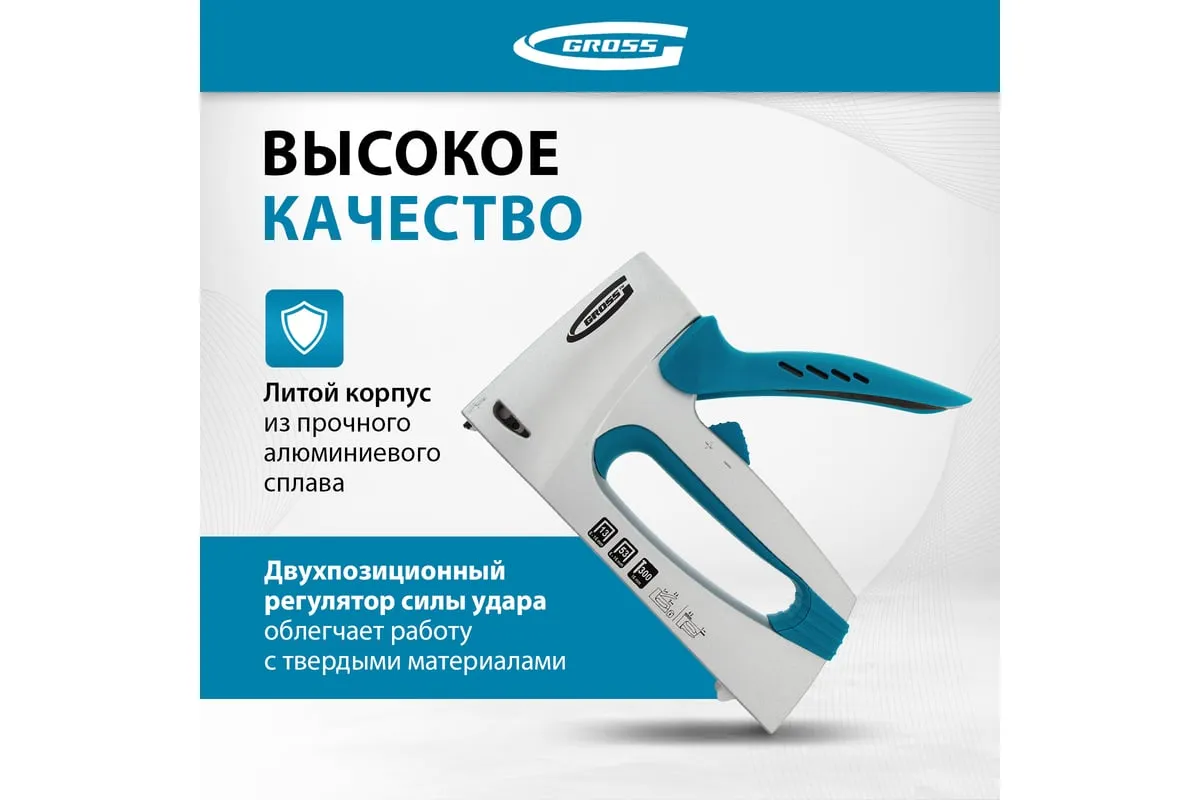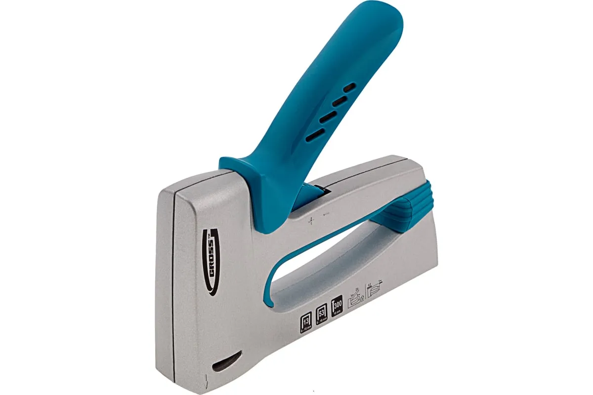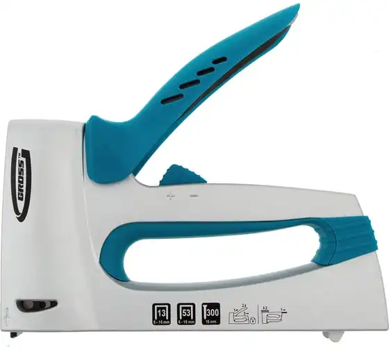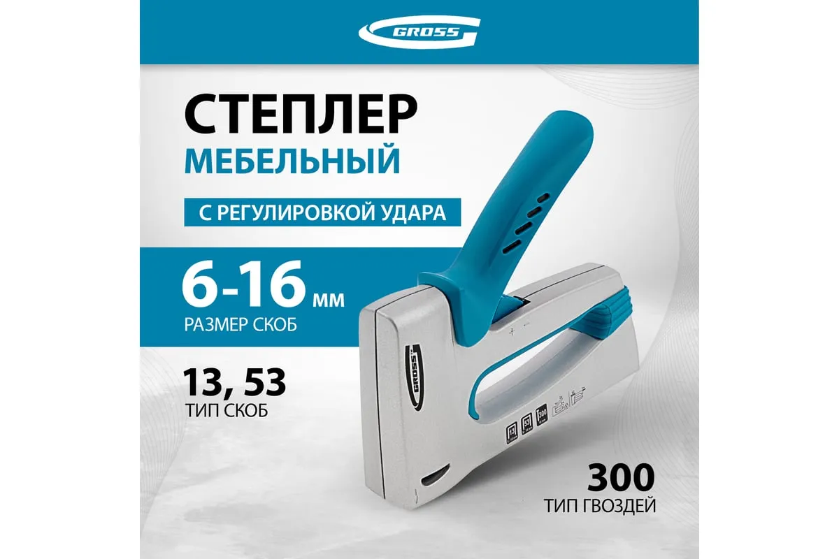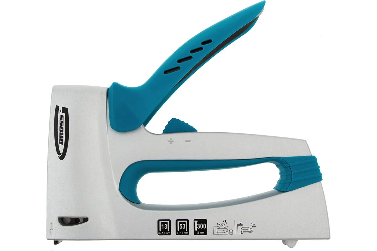 Мебельный степлер Gross 41002 в алюминиевом корпусе, с функцией регулировки силы удара, совместим со скобами типа 13 и 53 размером 6-16 мм и гвоздями типа 300 размером 16 мм. Инструмент используют для фиксации на деревянном основании оргалита, фанеры, ДВП, ДСП, пленки, утеплителя и других листовых материалов. Инструмент будет полезен при сборке и обшивке мебели, укладке ковровых покрытий и изоляционных материалов, выполнении багетных работ. Подходит для профессионального применения.