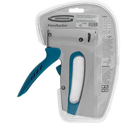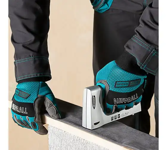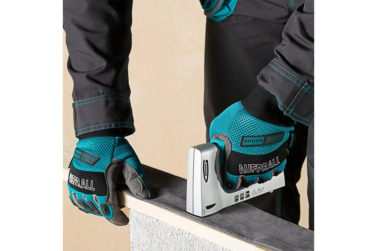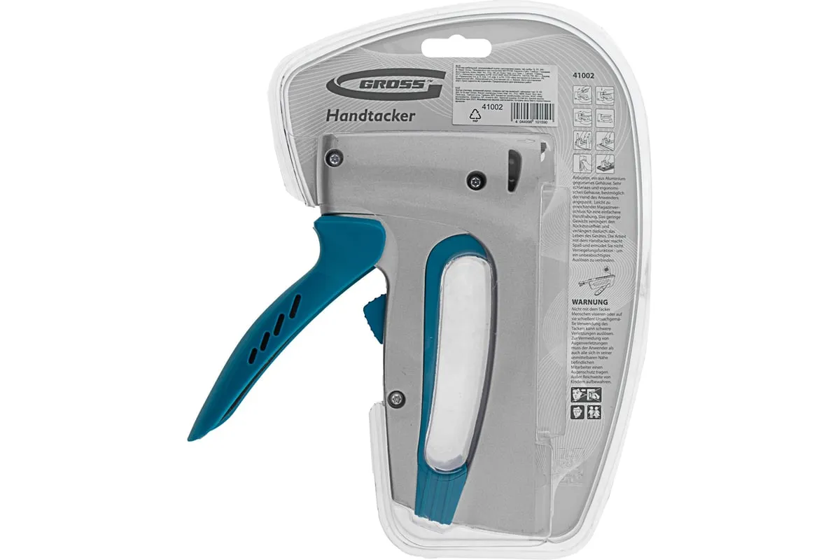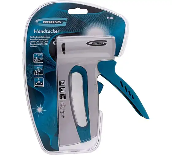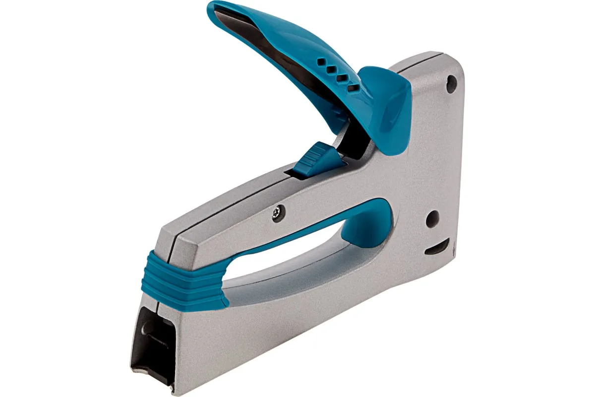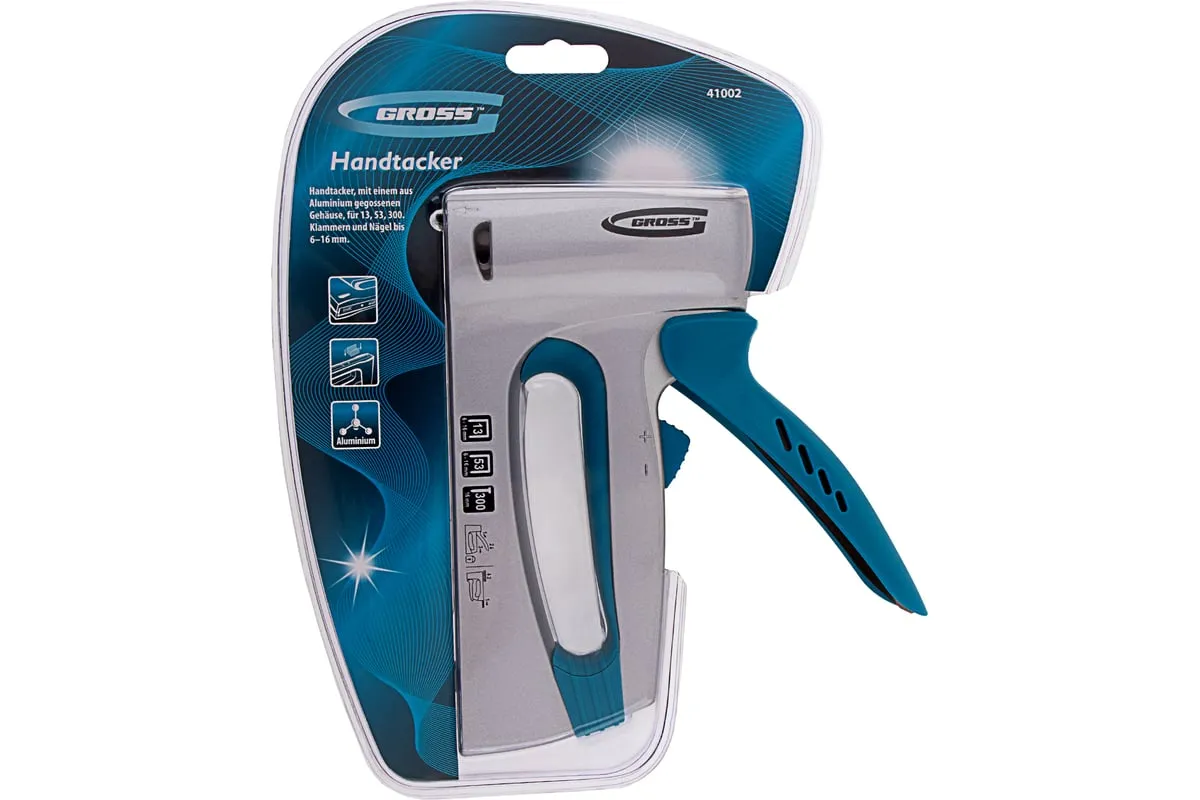Мебельный степлер Gross 41002 в алюминиевом корпусе, с функцией регулировки силы удара, совместим со скобами типа 13 и 53 размером 6-16 мм и гвоздями типа 300 размером 16 мм. Инструмент используют для фиксации на деревянном основании оргалита, фанеры, ДВП, ДСП, пленки, утеплителя и других листовых материалов. Инструмент будет полезен при сборке и обшивке мебели, укладке ковровых покрытий и изоляционных материалов, выполнении багетных работ. Подходит для профессионального применения.