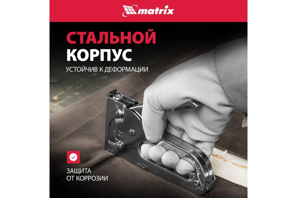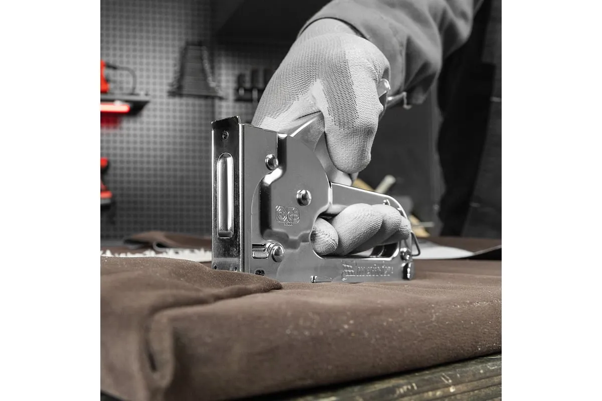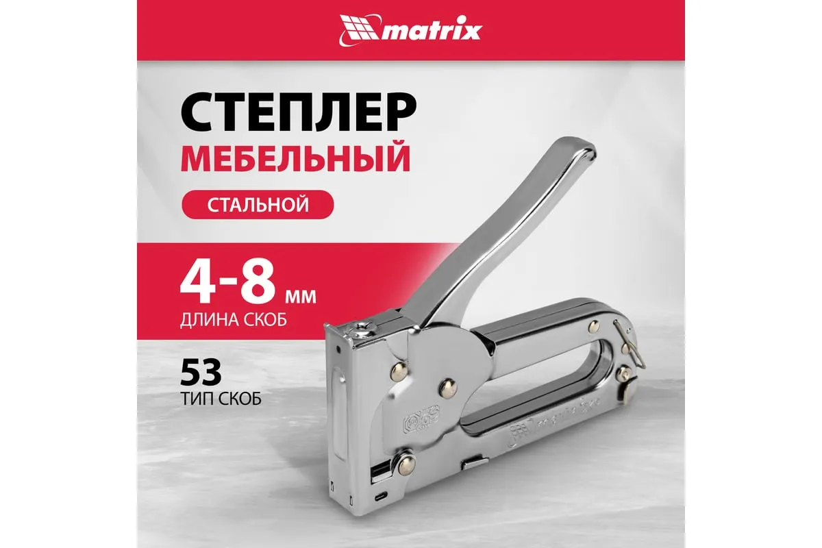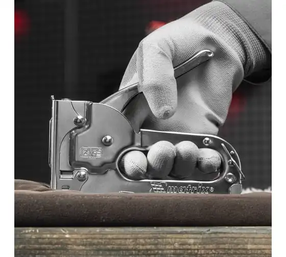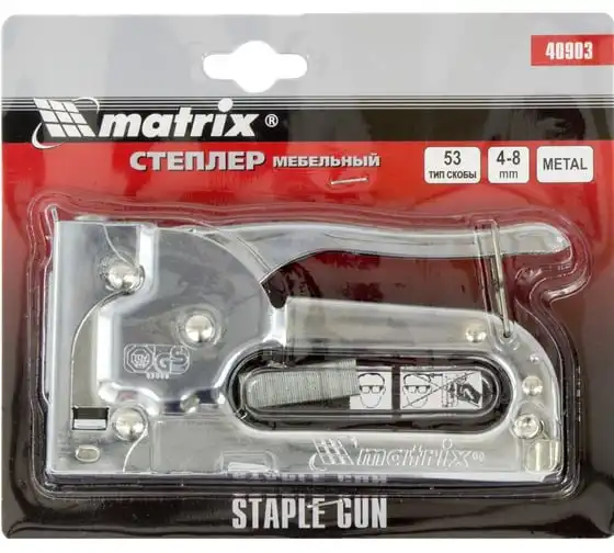 Мебельный степлер MATRIX MASTER 40903 применяется для обивки мебели и других конструкций. Может использоваться для прибивания тонких материалов к деревянным заготовкам при использовании коротких скоб. Степлер очень удобен и эффективен в работе. Он обладает повышенным рабочим ресурсом за счет использования для его изготовления качественных материалов.