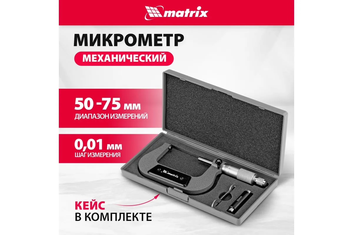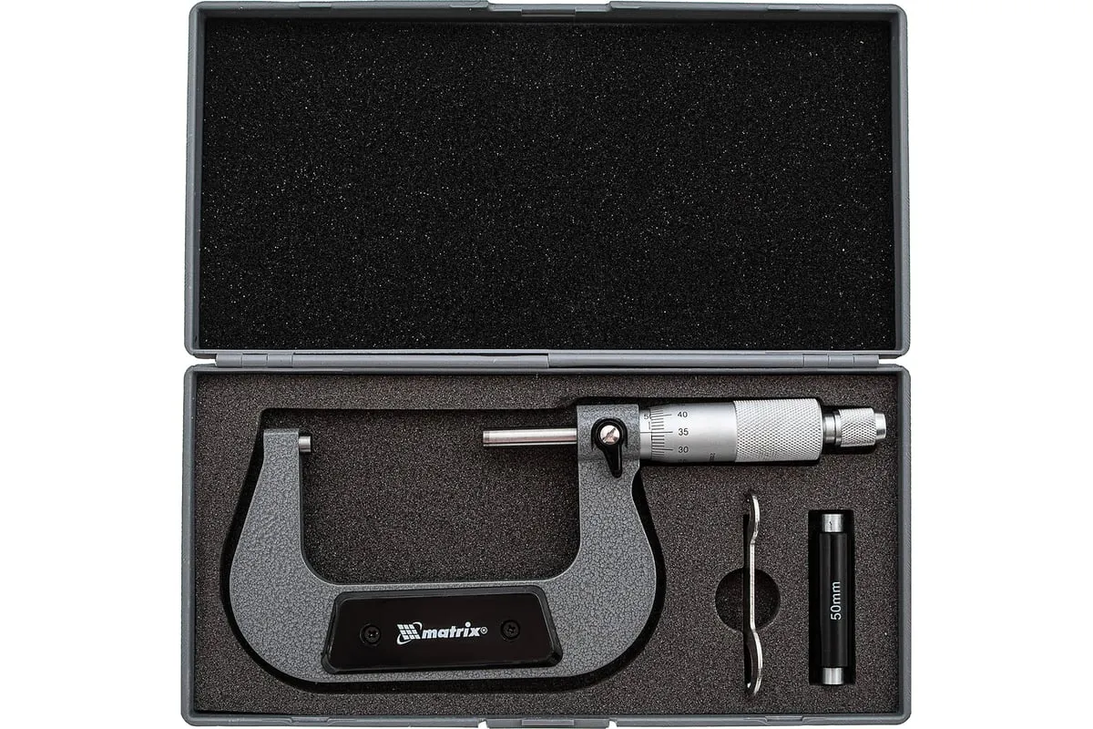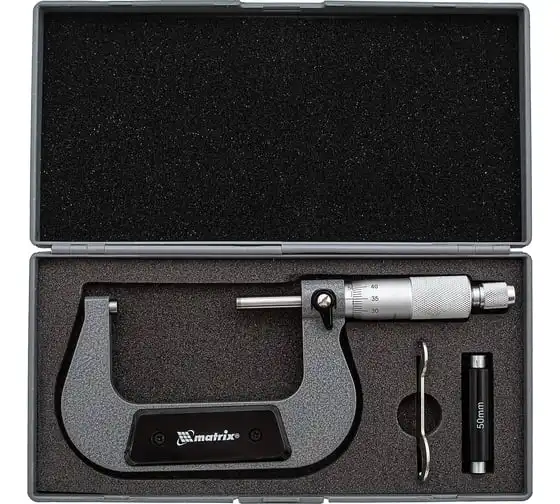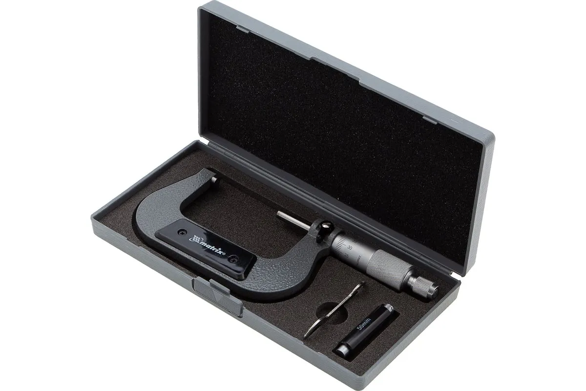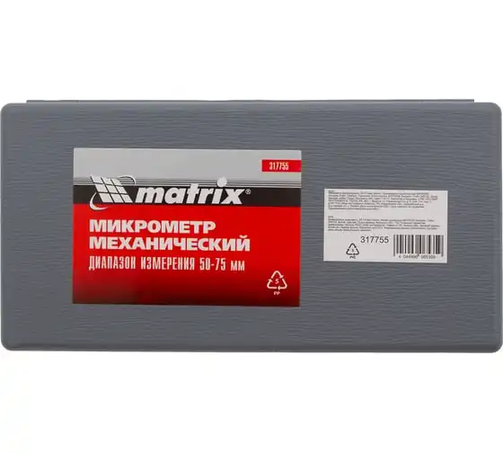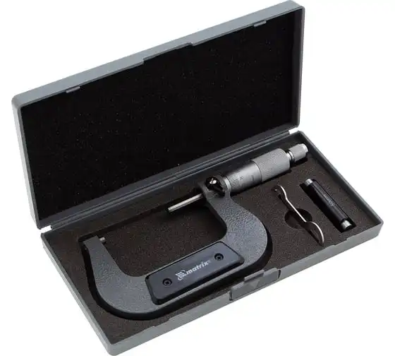 Механический микрометр MATRIX 317755 имеет форму скобы. Корпус выполнен из инструментальной стали, что обеспечивает высокую надежность и долговечность. Для удобства хранения и транспортировки данный инструмент поставляется в пластиковом кейсе.