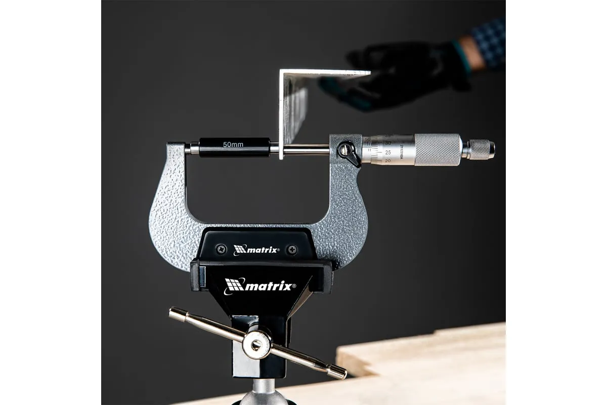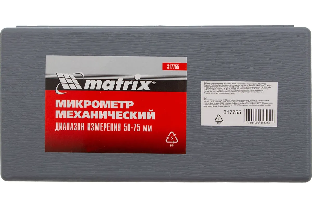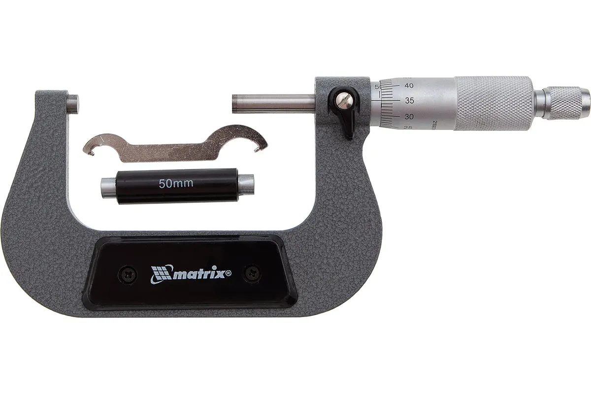 Механический микрометр MATRIX 317755 имеет форму скобы. Корпус выполнен из инструментальной стали, что обеспечивает высокую надежность и долговечность. Для удобства хранения и транспортировки данный инструмент поставляется в пластиковом кейсе.