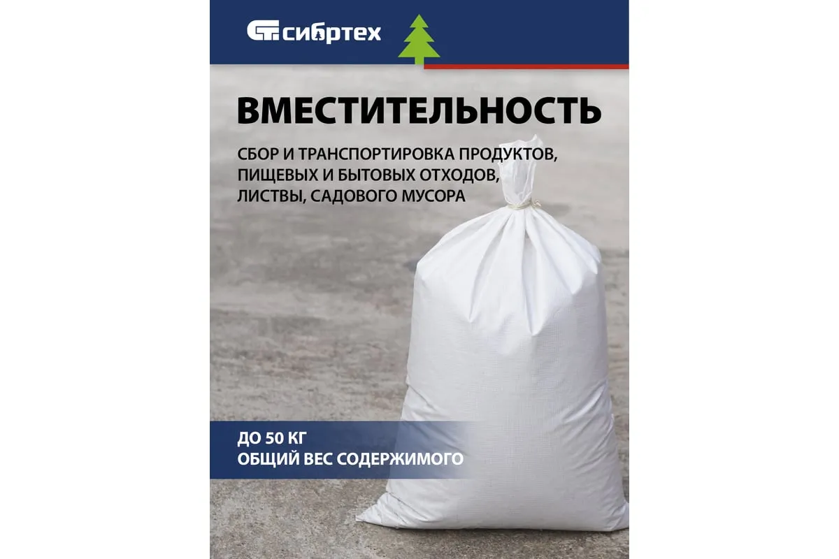 Белый полипропиленовый мешок Сибртех 94110 размером 55 х 95 см используется для бытовых целей: сбора, транспортировки пищевых и бытовых отходов. Подойдет также для перемещения пищевых продуктов, сбора листвы и садового мусора.