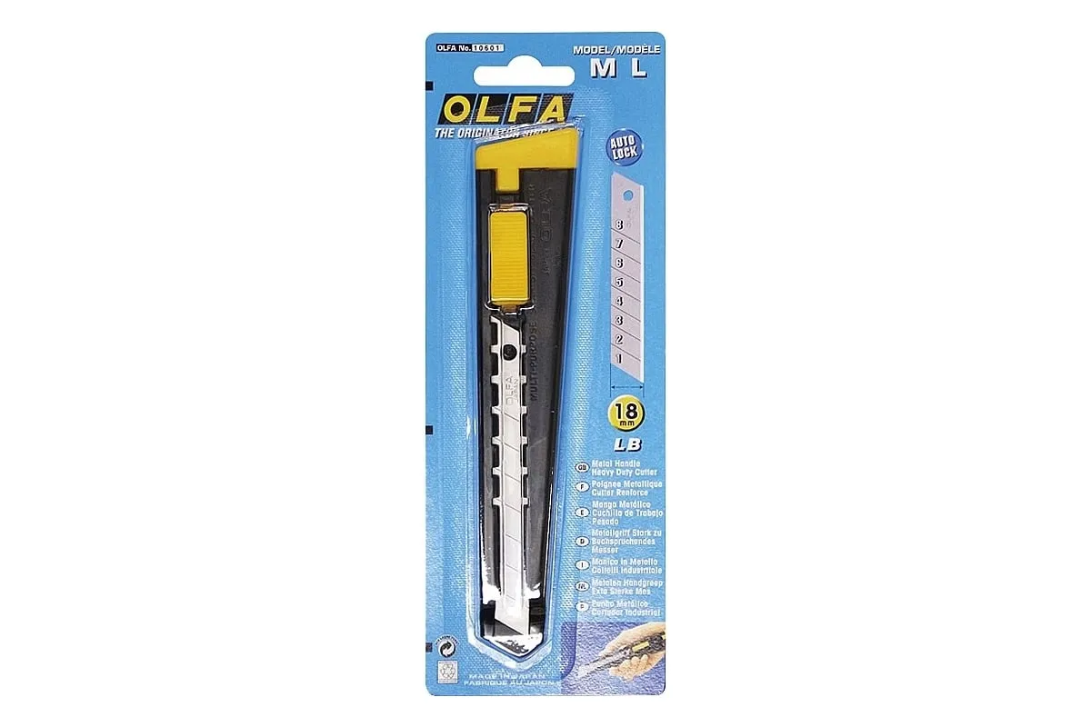 Если Вам нравится OLFA OL-180, но нужна большая сила реза, тогда универсальный нож с металлической ручкой OLFA ML шириной 18 мм — то, что вам нужно. Отличается тонким профилем, что позволяет носить его всегда с собой в кармане или сумке для инструментов. Стальная рукоятка устойчива к коррозии и химическим веществам. Предусмотрена автоматическая фиксация лезвия.