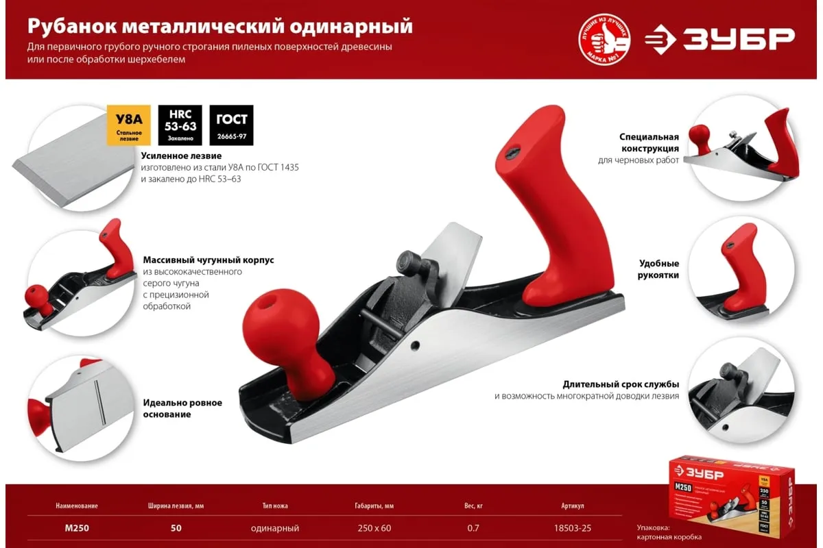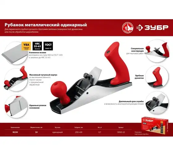Металлический рубанок Зубр М250 250х60 мм 18503-25_z02 - идеальный инструмент для любого этапа обработки древесины. Изготовлен из высококачественных материалов с соблюдением ГОСТ 266625-97.