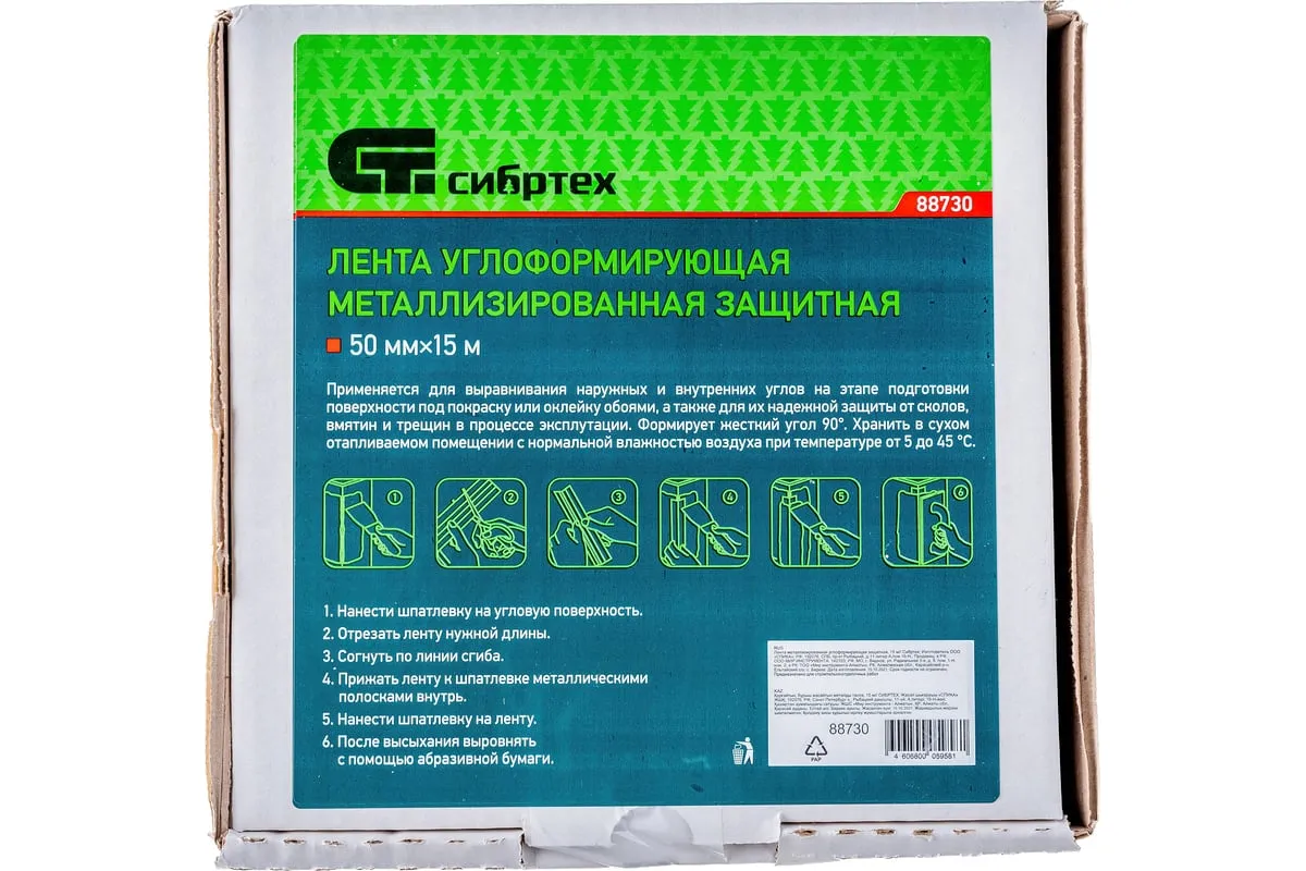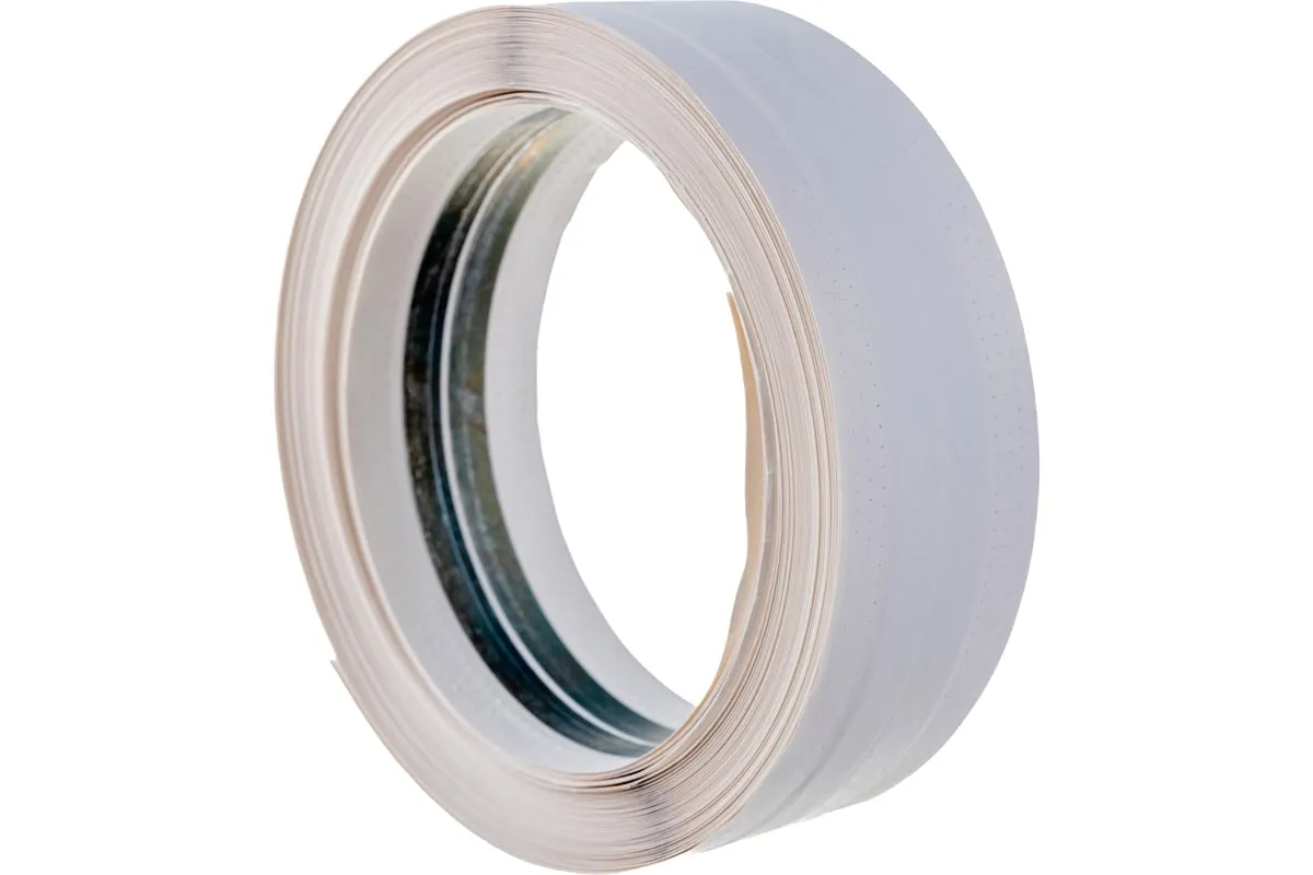 Металлизированная углоформирующая защитная лента Сибртех 88730 длиной 15 м используется для армирования и выравнивания стыков и углов для последующей отделки. Защищает углы от механических повреждений: растрескивания, сколов, вмятин и трещин. За счет металлической полосы заменяет собой угловой профиль из металла или пластика. Подходит для использования с гипсовыми и полимерными шпатлевками для ГКЛ, позволяя снизить их расход.