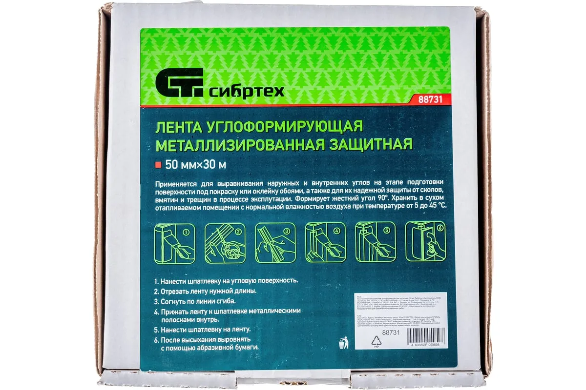 Металлизированная углоформирующая защитная лента Сибртех 88731 длиной 30 м используется для армирования и выравнивания стыков и углов для последующей отделки. Защищает углы от механических повреждений: растрескивания, сколов, вмятин и трещин. За счет металлической полосы заменяет собой угловой профиль из металла или пластика. Подходит для использования с гипсовыми и полимерными шпатлевками для ГКЛ, позволяя снизить их расход.