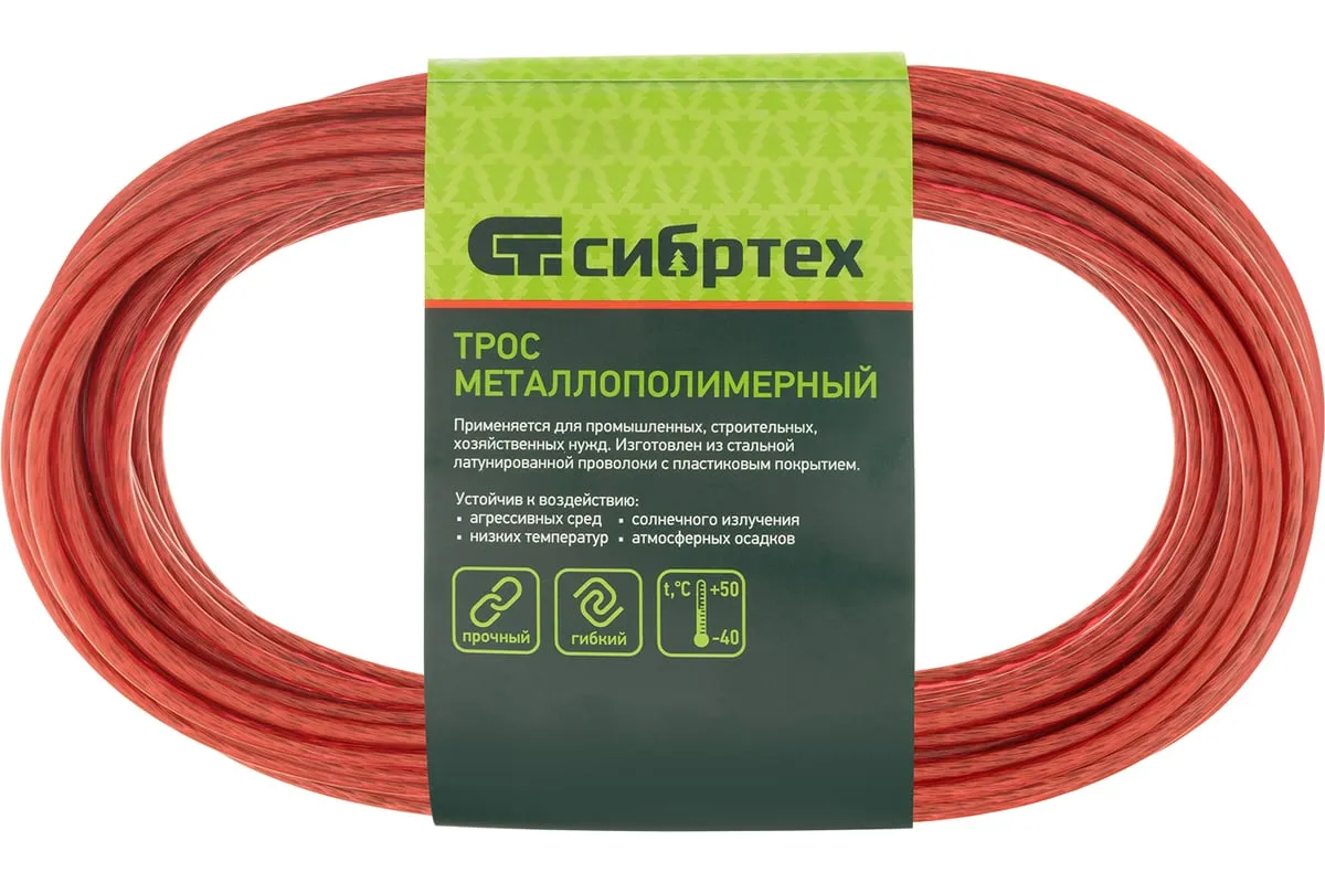 Трос изготовлен из стальной латунированной проволоки и покрыт пластикатом ПВХ методом экструзии, что делает его более устойчивым к окислению.В зависимости от диаметра выдерживает значительные разрывные нагрузки.Применяется при погружении насосов и датчиков в скважины, колодцы, в качестве несущего элемента различных строительных конструкции.Используется при изготовлении рекламных растяжек, для лучшей декоративности предлагается в нескольких цветах.