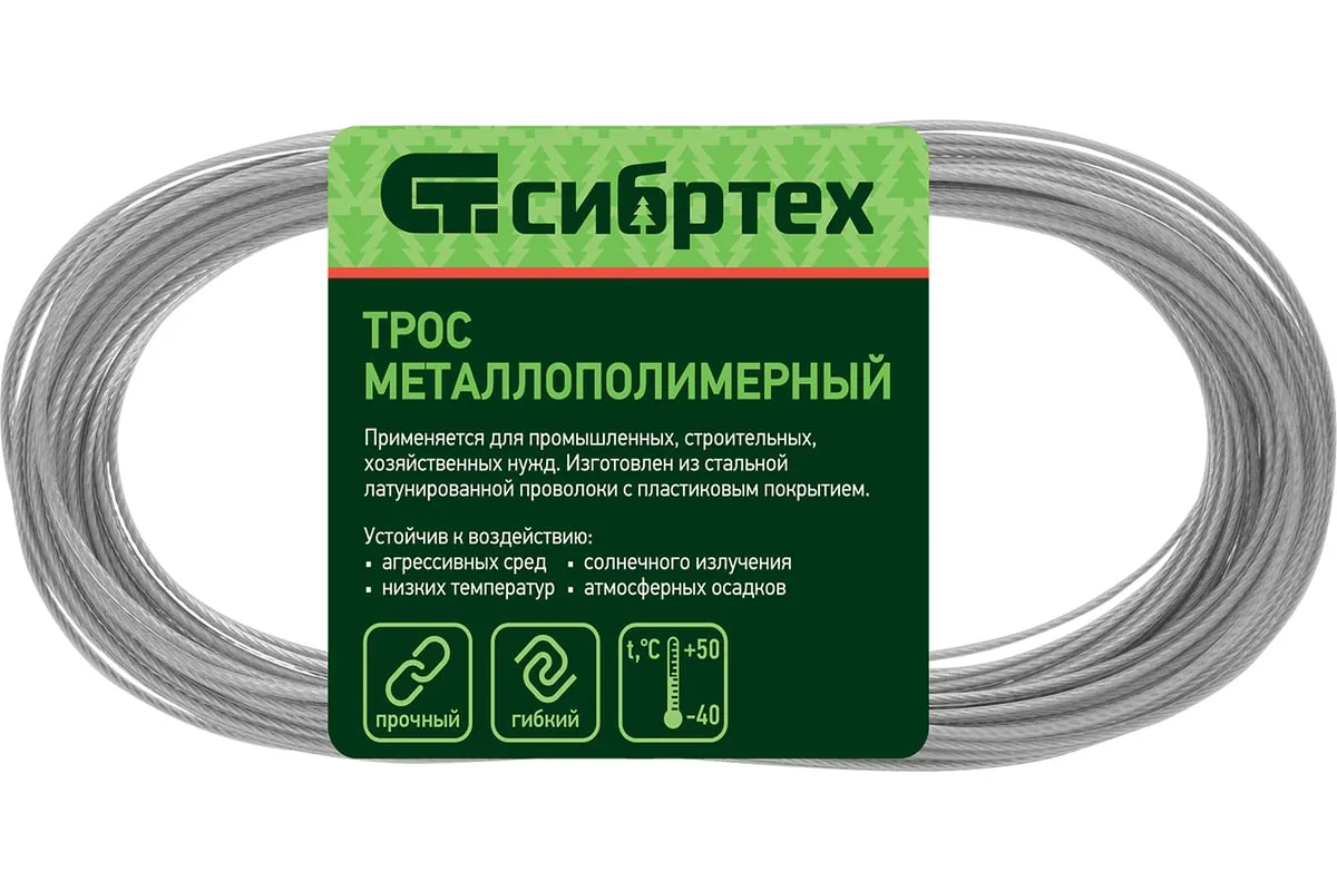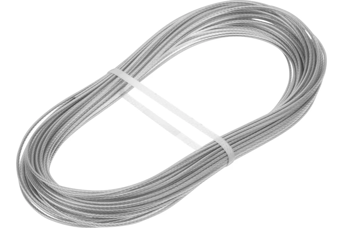 Металлополимерный прозрачный трос ПР-2.0 Сибртех 47625 толщиной 2,0 мм, 20 м. п. в мотке, можно использовать в домашнем хозяйстве для развешивания белья или на загородном участке в качестве садового шнура для подвязки растений. Применяется также для крепления погружных насосов и датчиков, монтажа тентовых конструкций, информационных табличек и растяжек, установки ограждений, антенн и мачт. Трос устойчив к перепадам температуры и воздействиям агрессивных сред, поэтому может использоваться в сложных условиях.