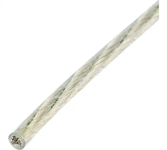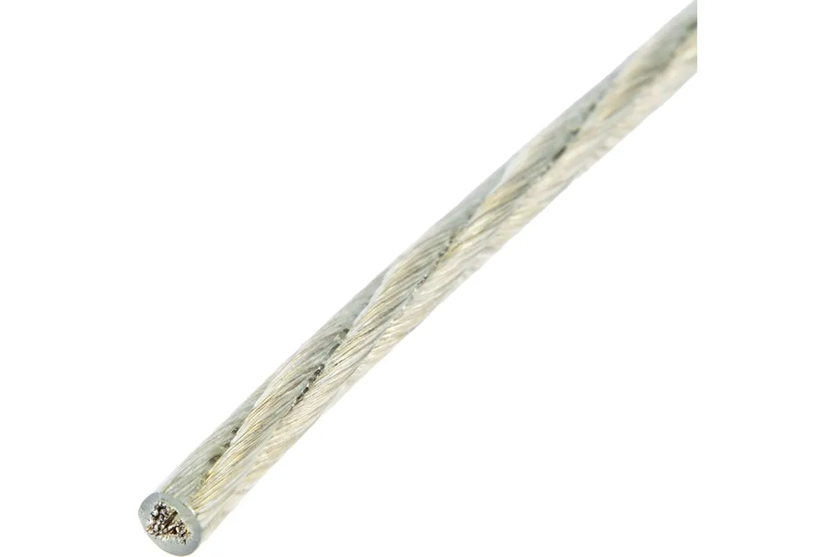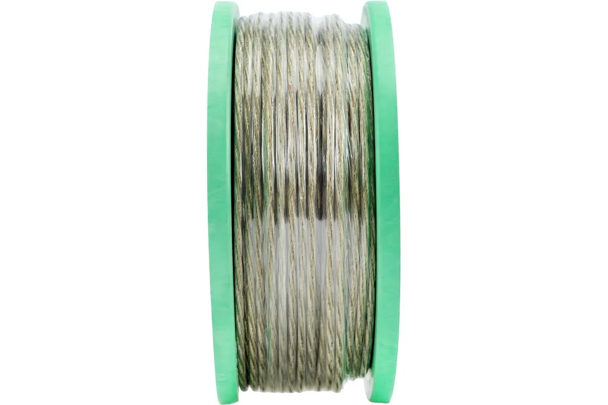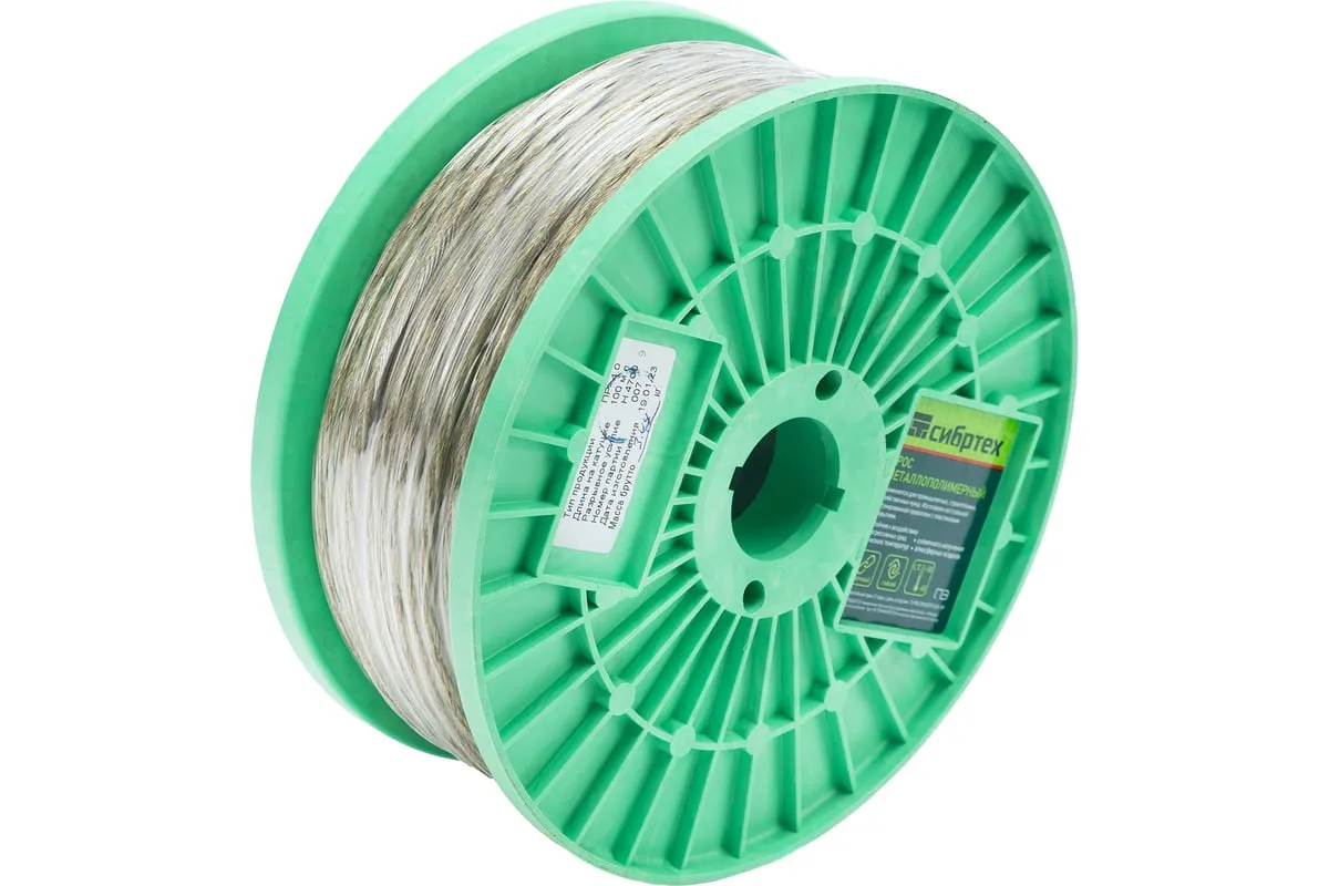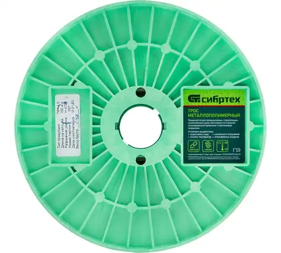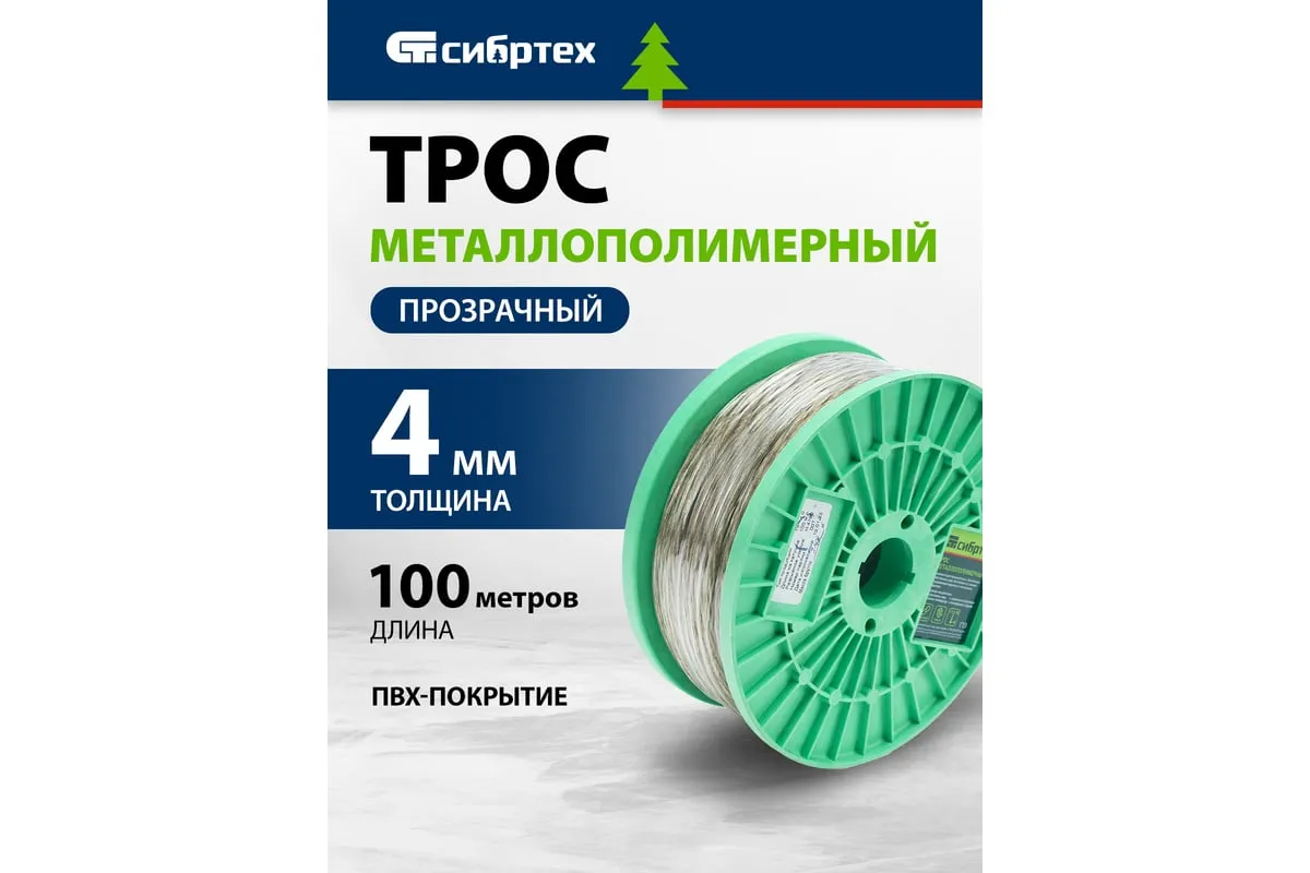 Трос металлополимерный прозрачный ПР-4.0 Сибртех 47630 толщиной 4,0 мм, на катушке 100 м. п., используется для монтажа рекламных баннеров и воздушных кабельных линий, установки ограждений, палаток, теплиц, погружения скважинных насосов и датчиков. Применяется в качестве садового троса-шнура для подвязки растений, а также как трос для белья. Жила шнура состоит из стальной проволоки, поэтому он выдерживает значительные нагрузки.